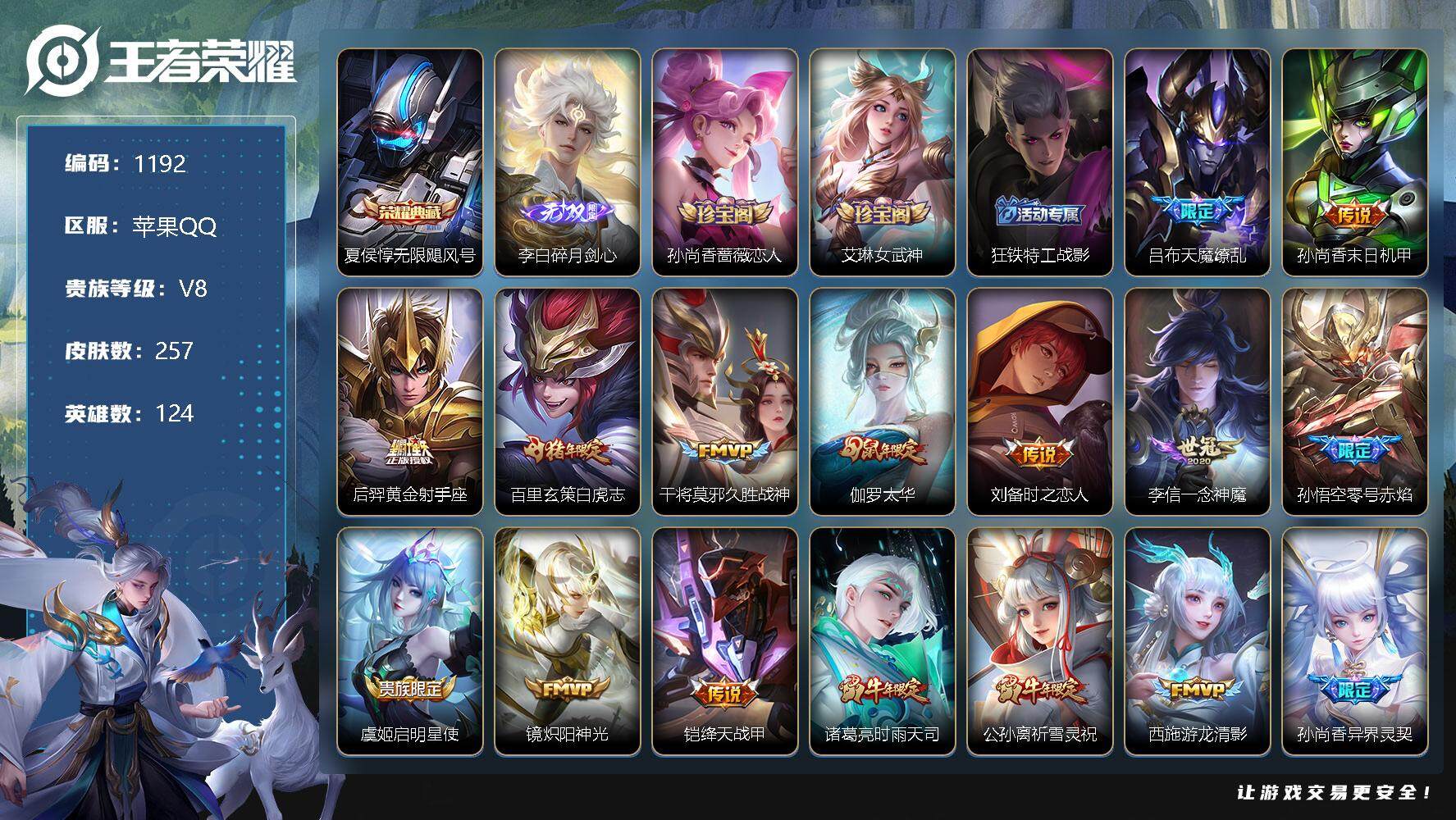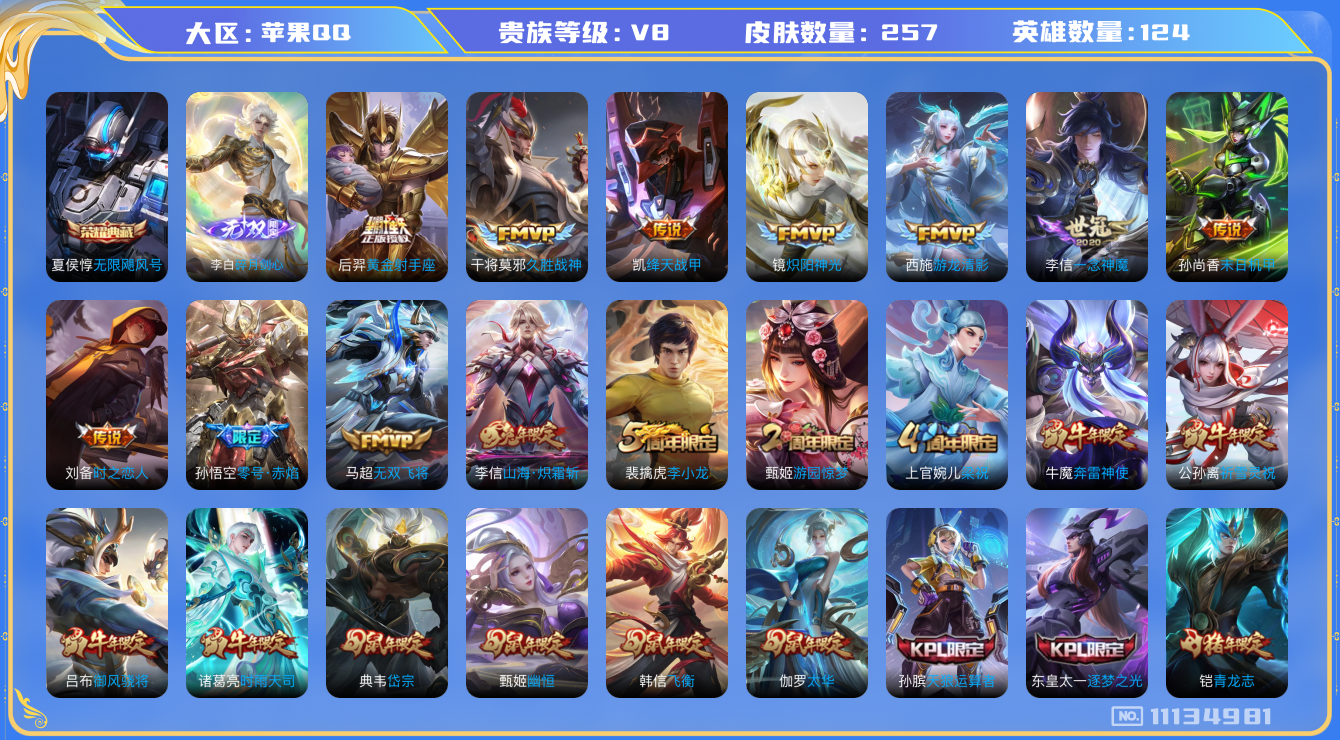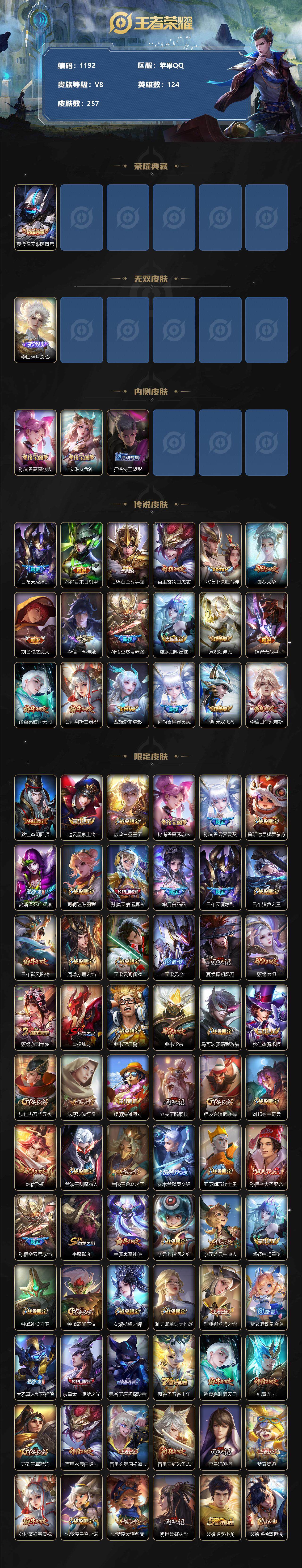 [11134981]【商品标题】:苹果Q-V6-最强王者段位-124英雄-257皮肤-1典藏-0珍品无双-1无双-0珍品传说-18传说-80史诗