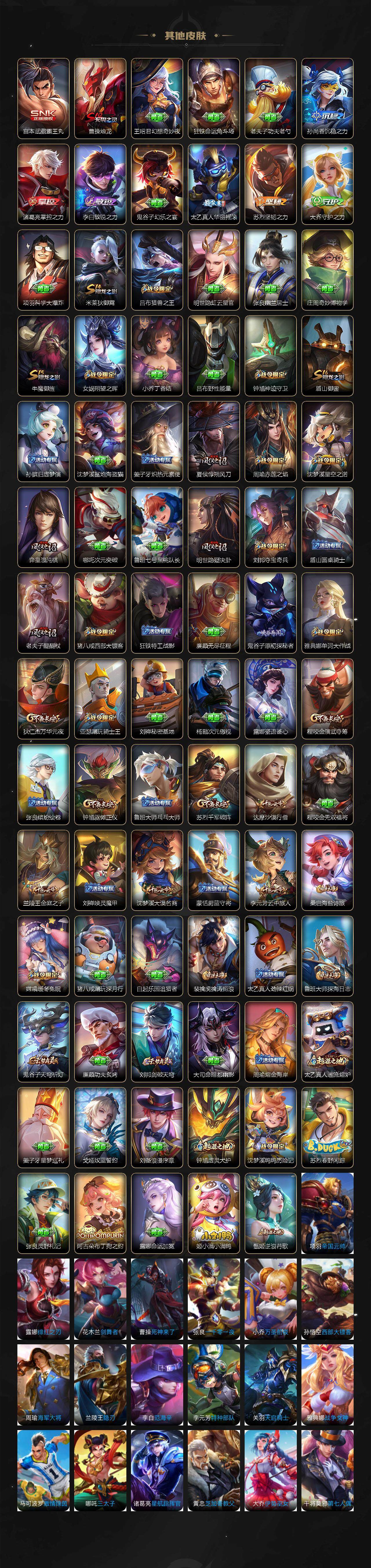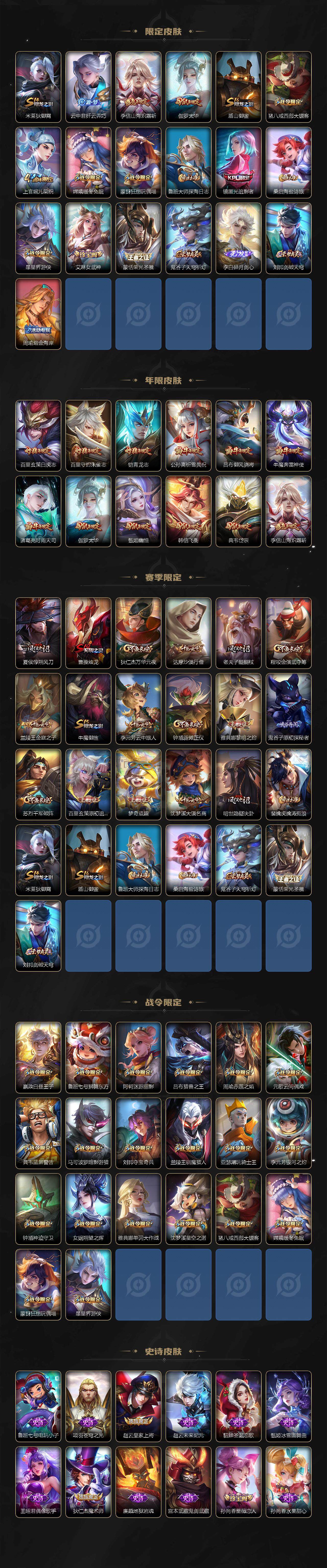 【限定皮肤】:狄仁杰阴阳师,赵云皇家上将,嬴政白昼王子,孙尚香蔷薇恋人,孙尚香异界灵契,鲁班七号狮舞东方,高渐离死亡摇滚,阿轲迷踪丽影,孙膑天狼运算者,芈月白晶晶,吕布天魔缭乱,吕布猎兽之王,吕布御风骁将,周瑜赤莲之焰,元歌云间偶戏,元歌无心,夏侯惇朔风刀,甄姬幽恒,甄姬游园惊梦,曹操烛龙,典韦蓝屏警告,典韦岱宗,马可波罗暗影游猎,狄仁杰魔术师,狄仁杰万华元夜,达摩沙漠行僧,项羽海滩派对,老夫子醍醐杖,程咬金演武夺筹,刘邦夺宝奇兵,韩信飞衡,兰陵王驯魔猎人,兰陵王金庭之子,花木兰默契交锋,亚瑟潮玩骑士王,孙悟空大圣娶亲,孙悟空零号赤焰,牛魔御旌,牛魔奔雷神使,李元芳银河之约,李元芳云中旅人,虞姬启明星使,钟馗神迹守卫,钟馗驱傩正仪,女娲朔望之晖,雅典娜单词大作战,雅典娜黎明之约,蔡文姬繁星吟游,太乙真人华丽摇滚,东皇太一逐梦之光,鬼谷子原初探秘者,鬼谷子五谷丰年,诸葛亮时雨天司,铠青龙志,苏烈千军破阵,百里玄策白虎志,百里玄策原初追逐者,百里守约朱雀志,弈星混沌棋,梦奇顽趣,公孙离祈雪灵祝,沈梦溪星空之诺,沈梦溪大漠名商,明世隐疑决卦,裴擒虎李小龙,裴擒虎擒涛扼浪,米莱狄御霄,云中君纤云弄巧,李信山海炽霜斩,伽罗太华,盾山御銮,猪八戒西部大镖客,上官婉儿梁祝,嫦娥暖冬兔眠,蒙犽狂想玩偶喵,鲁班大师探海日志,镜匿光追影者,桑启海盐诗旅,暃星界游侠,艾琳女武神,蒙恬荣光圣徽,鬼谷子天穹祈灯,李白碎月剑心,刘邦剑破天穹,周瑜熔金海岸