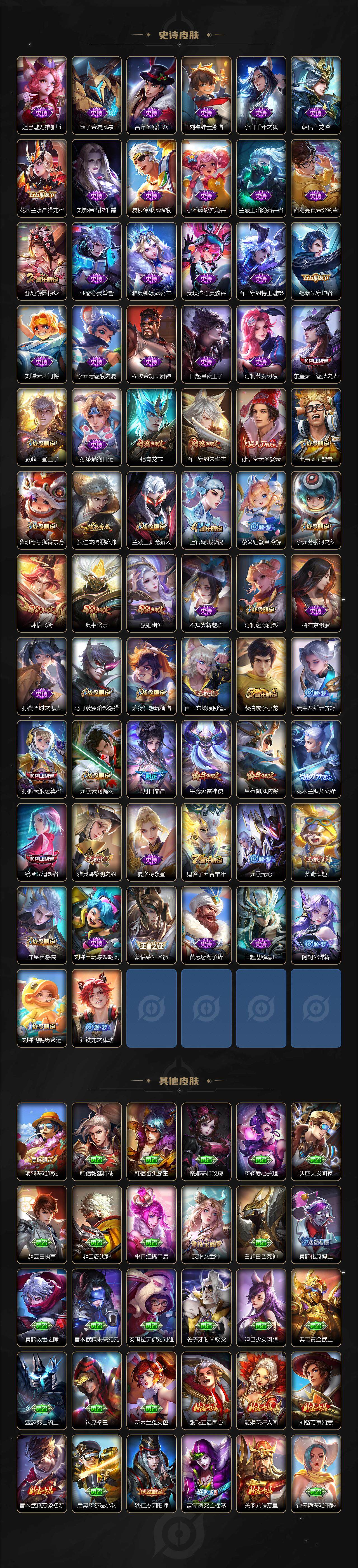 - [12204164]V9 3典藏 30传说 125英雄 352皮肤 可修改实名 优质装备:鸣剑·曳影,神鉴启示录,最初的交响(伽罗典藏),黄金狮子座,云鹰飞将(小将军),绛天战甲(鸡嘴战神),猫影幻舞,久胜战神,炽阳神光,一念神魔,云霓雀翎,末日机甲-孙尚香(绿蚂蚱),地狱火,音你心动-小乔,地狱之眼,乞巧织情,时之恋人-刘备(电焊工),淬星耀世,挚爱之约,无双飞将,碎云,鲁班七号-时之奇旅,黄金天蝎座,涂山容容 传说皮:乘龙·问璇玑(孙尚香年限),貂蝉曦玄引 珍宝阁皮:妄想食味,玩趣恶龙 限定皮:愿照·千秋盛(女娲年限),鸣野蒿,至尊宝,凤求凰(白切鸡),凤凰于飞,傲雪梅枪,白晶晶,时雨天司(水龙头),至美·化雀舞,遇见飞天,怒海麟威,梁祝,李小龙,如梦令-后羿,孙行者,猪悟能,一生所爱,大圣娶亲,热情桑巴,女儿国国王,寅虎·御盾(廉颇年限),玉兔公主,深海之息(深海大菠萝),唐三藏 史诗皮:鸭鸭历险记-刘禅,化蝶舞,星界战将,龙之律动,茶境仙,怒海争锋,蒙犽顽岩魄,海诺心动手记,夜落电台,蔬乡物语(鲁班七号),曹操夜都魔契,织梦人,遇见神鹿,紫霞仙子,苍穹之光,电玩小子(小书包),白龙吟,黄金分割率,特工魅影,千年之狐,永昼,江河有灵,浮梦罗烟,魅语,无限星赏官,冰冠公主,偶像歌手,晚萤,电玩·爆裂旋风,百相守梦(关羽),银翎春语,龙骑士(小龙虾),末日机甲-吕布,猫狗日记-孙策,猫狗日记-大乔,时之恋人-孙尚香,乱世虎臣,节奏热浪,女仆咖啡,摇滚巨星,水果甜心,绅士熊喵,天才门将,星夜王子,心灵骇客,时之奇旅-安琪拉,功夫厨神,德古拉伯爵,暗隐猎兽者,幽灵船长,鬼剑武藏,暗渊魔法,心灵战警,乐园奇幻夜,舞动绿茵,地狱岩魂,诗语江南,缤纷独角兽,乘风破浪,逐浪之夏,月团寄思,水晶猎龙者,曙光守护者,箭羽风息,金属风暴,原初追逐者,圣诞狂欢,圣诞恋歌,鹰眼统帅,暗夜贵公子,魅力维加斯,黎明之约,赏金猎手,奇遇舞章,寅虎·御盾,未来纪元-赵云