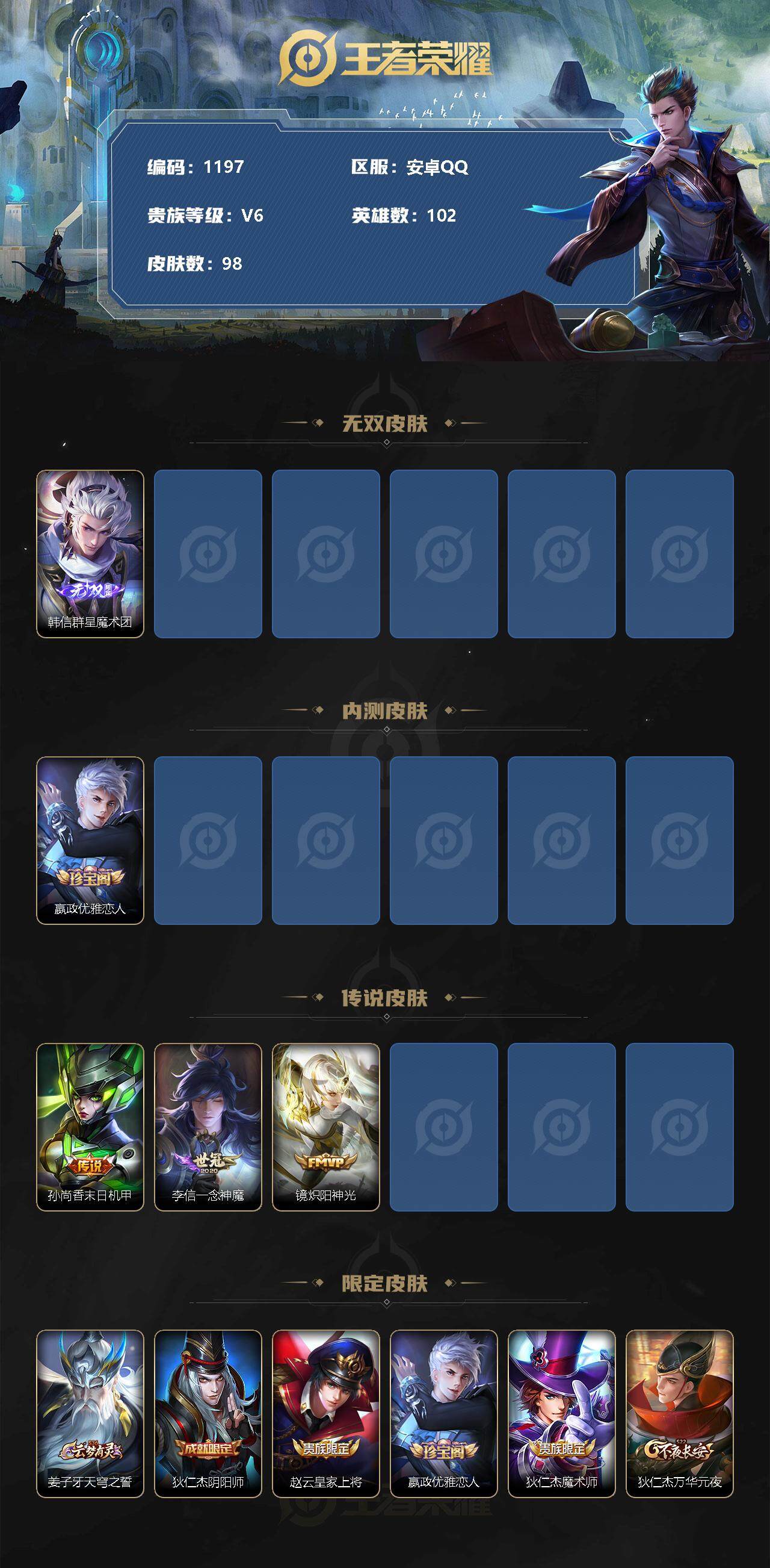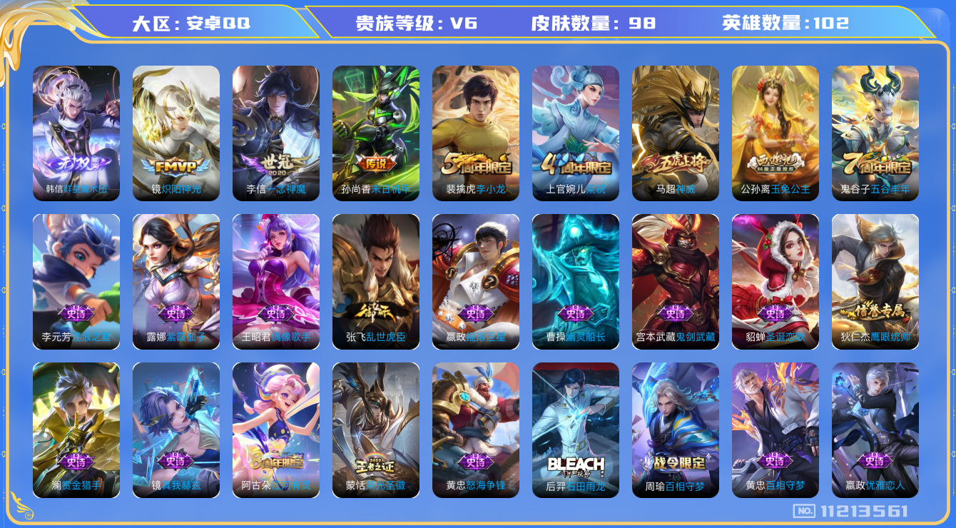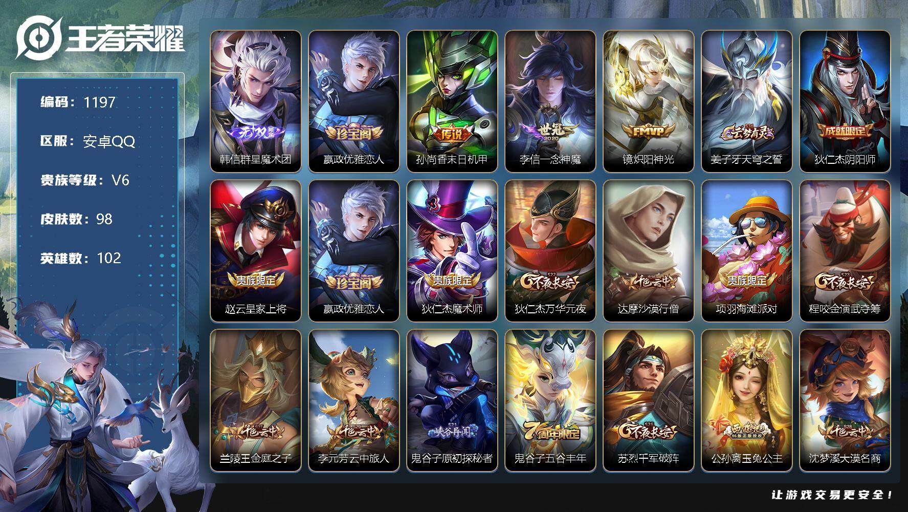 [11213561]【商品标题】:安卓Q-V6-最强王者段位-102英雄-98皮肤-0典藏-0珍品无双-1无双-0珍品传说-3传说-26史诗