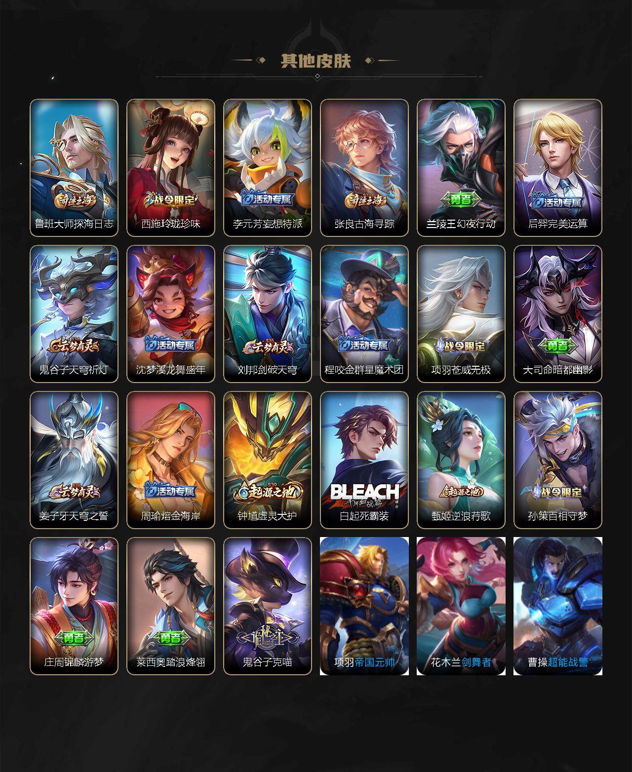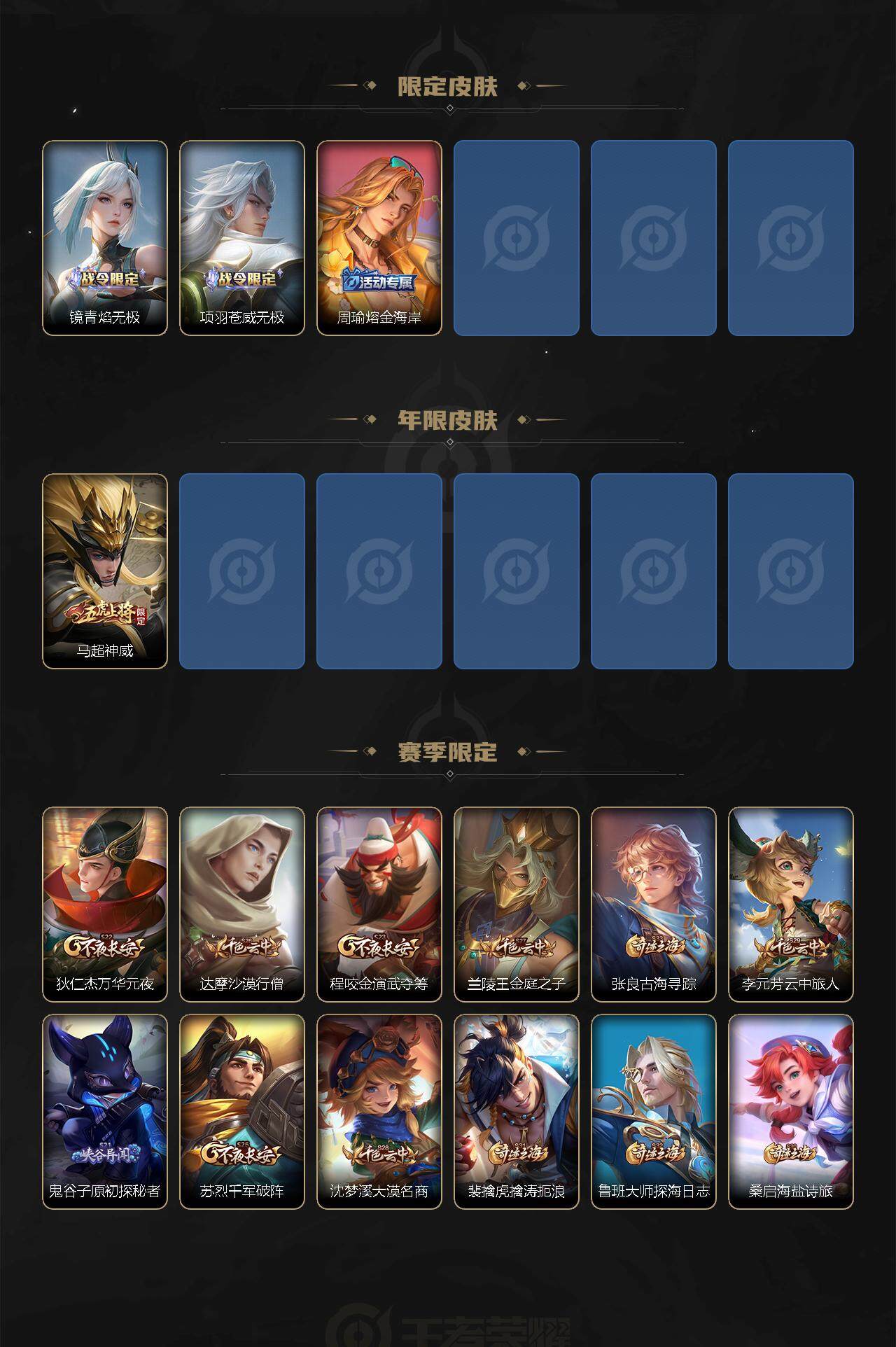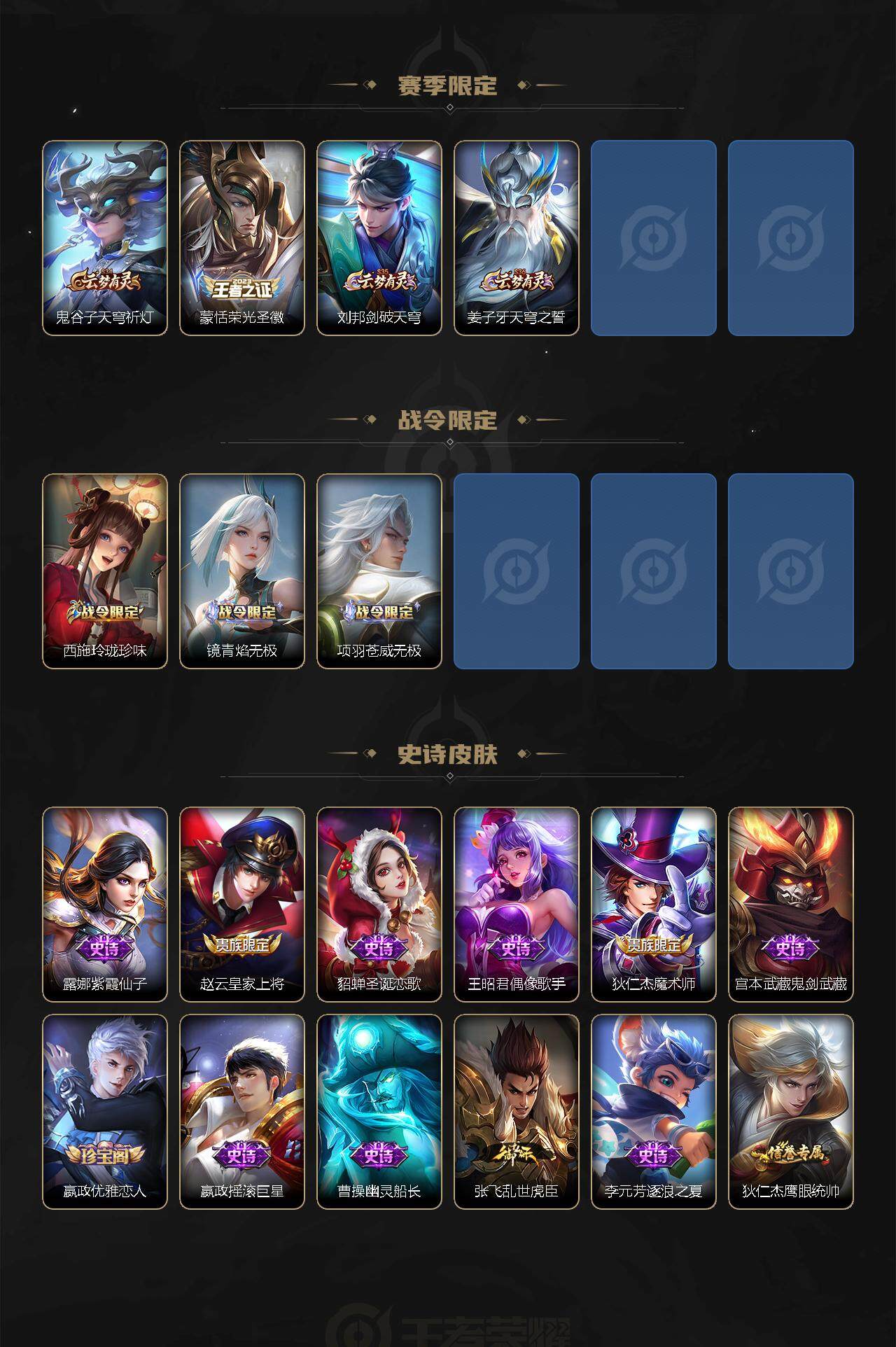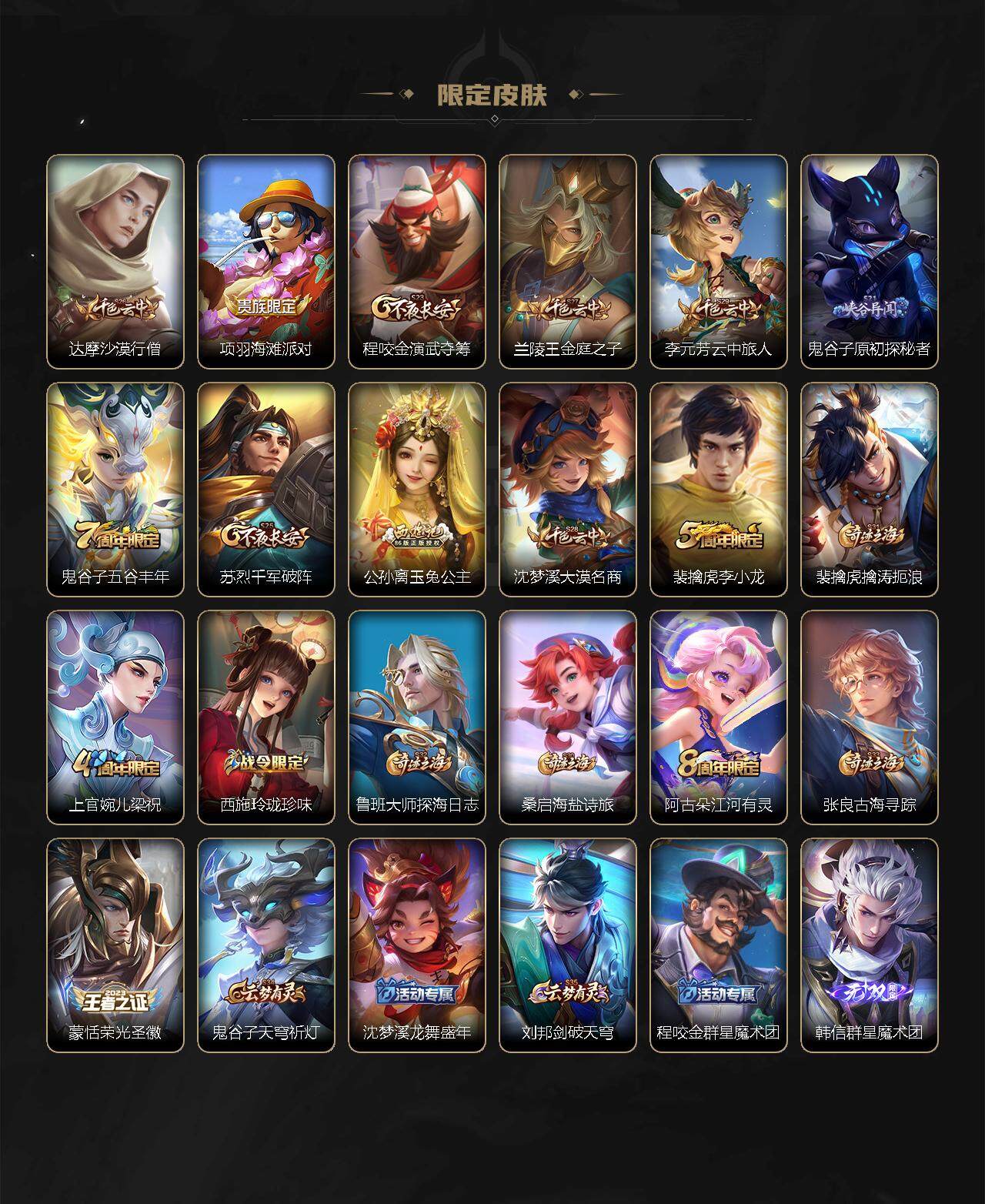 【赛季限定】:狄仁杰万华元夜,达摩沙漠行僧,程咬金演武夺筹,兰陵王金庭之子,张良古海寻踪,李元芳云中旅人,鬼谷子原初探秘者,苏烈千军破阵,沈梦溪大漠名商,裴擒虎擒涛扼浪,鲁班大师探海日志,桑启海盐诗旅,鬼谷子天穹祈灯,蒙恬荣光圣徽,刘邦剑破天穹,姜子牙天穹之誓