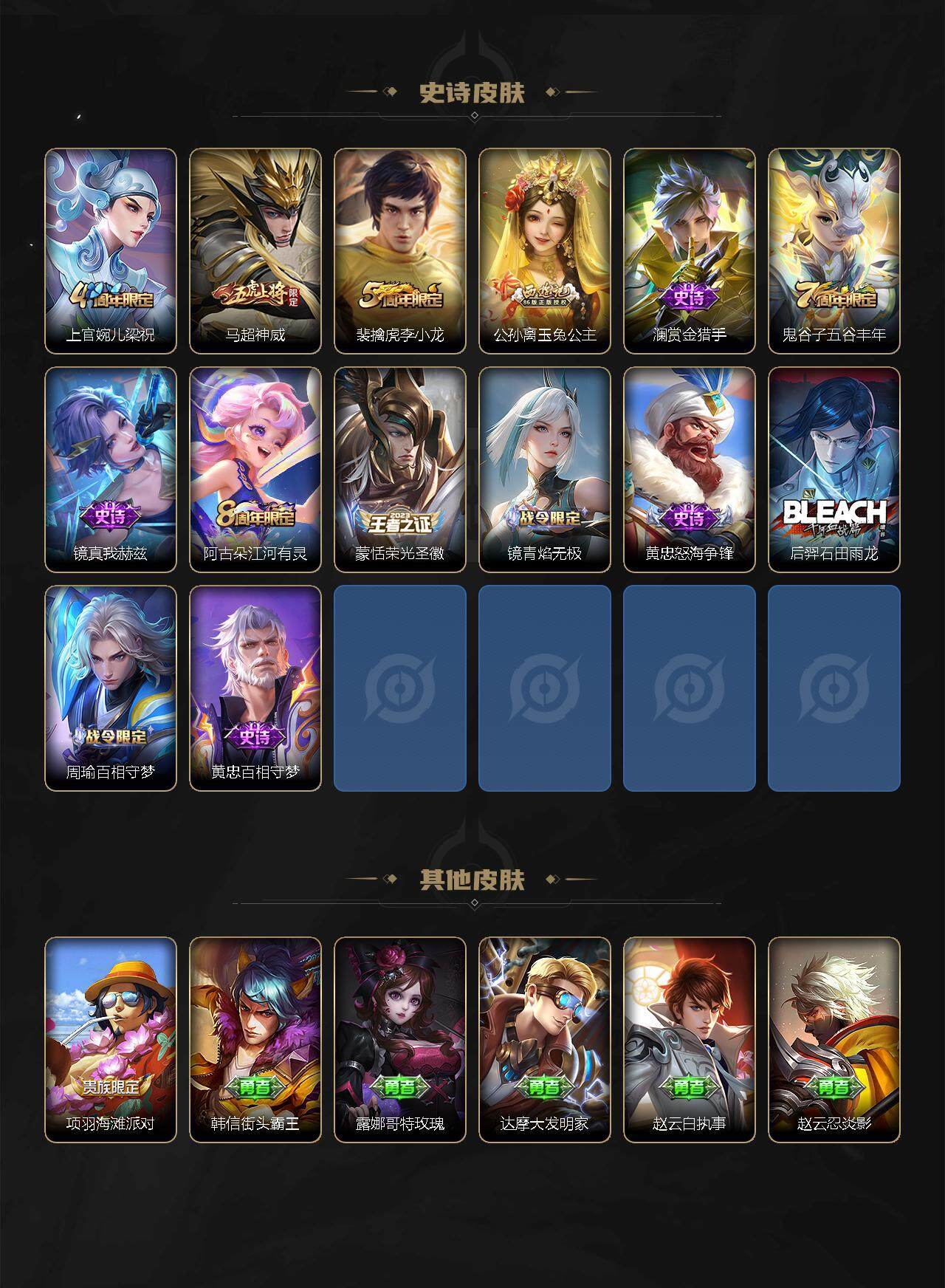 【史诗皮肤】:露娜紫霞仙子,赵云皇家上将,貂蝉圣诞恋歌,王昭君偶像歌手,狄仁杰魔术师,宫本武藏鬼剑武藏,嬴政优雅恋人,嬴政摇滚巨星,曹操幽灵船长,张飞乱世虎臣,李元芳逐浪之夏,狄仁杰鹰眼统帅,上官婉儿梁祝,马超神威,裴擒虎李小龙,公孙离玉兔公主,澜赏金猎手,鬼谷子五谷丰年,镜真我赫兹,阿古朵江河有灵,蒙恬荣光圣徽,镜青焰无极,黄忠怒海争锋,后羿石田雨龙,周瑜百相守梦,黄忠百相守梦