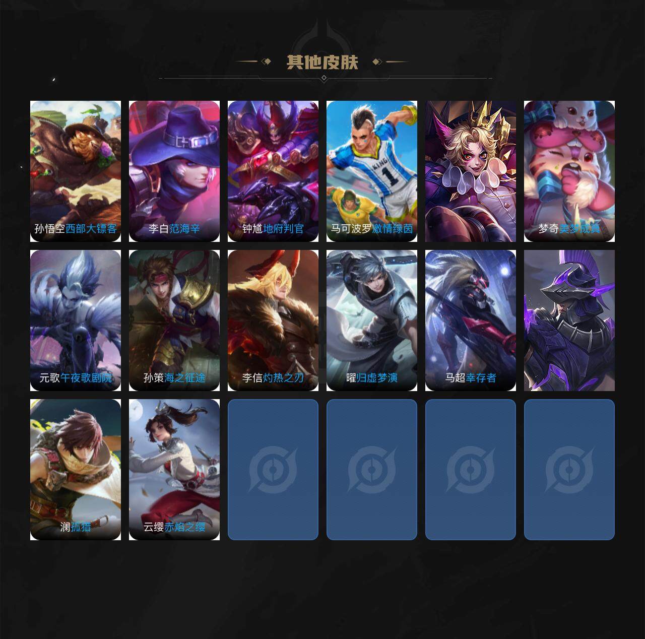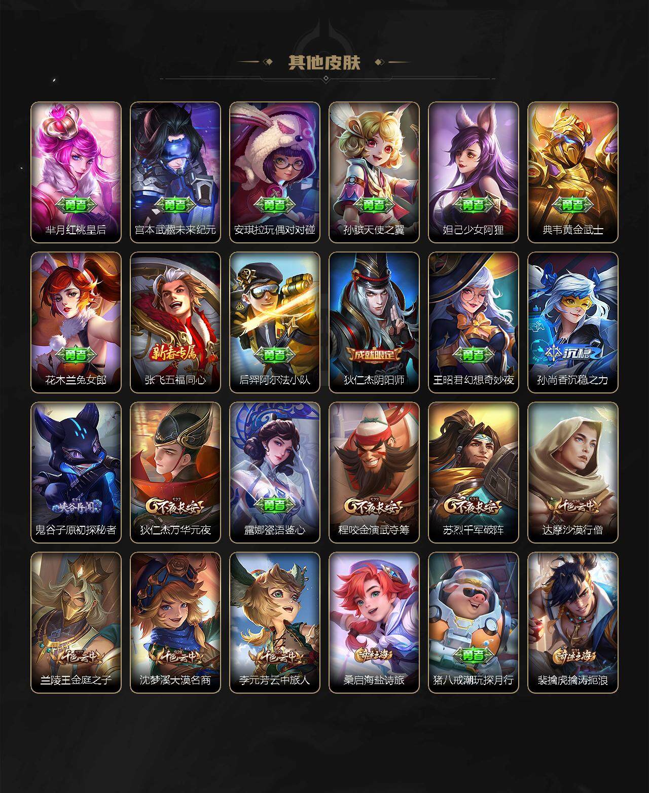 【其他皮肤】:项羽海滩派对,韩信街头霸王,露娜哥特玫瑰,达摩大发明家,赵云白执事,赵云忍炎影,芈月红桃皇后,宫本武藏未来纪元,安琪拉玩偶对对碰,孙膑天使之翼,妲己少女阿狸,典韦黄金武士,花木兰兔女郎,张飞五福同心,后羿阿尔法小队,狄仁杰阴阳师,王昭君幻想奇妙夜,孙尚香沉稳之力,鬼谷子原初探秘者,狄仁杰万华元夜,露娜瓷语鉴心,程咬金演武夺筹,苏烈千军破阵,达摩沙漠行僧,兰陵王金庭之子,沈梦溪大漠名商,李元芳云中旅人,桑启海盐诗旅,猪八戒潮玩探月行,裴擒虎擒涛扼浪,鲁班大师探海日志,西施玲珑珍味,李元芳妄想特派,张良古海寻踪