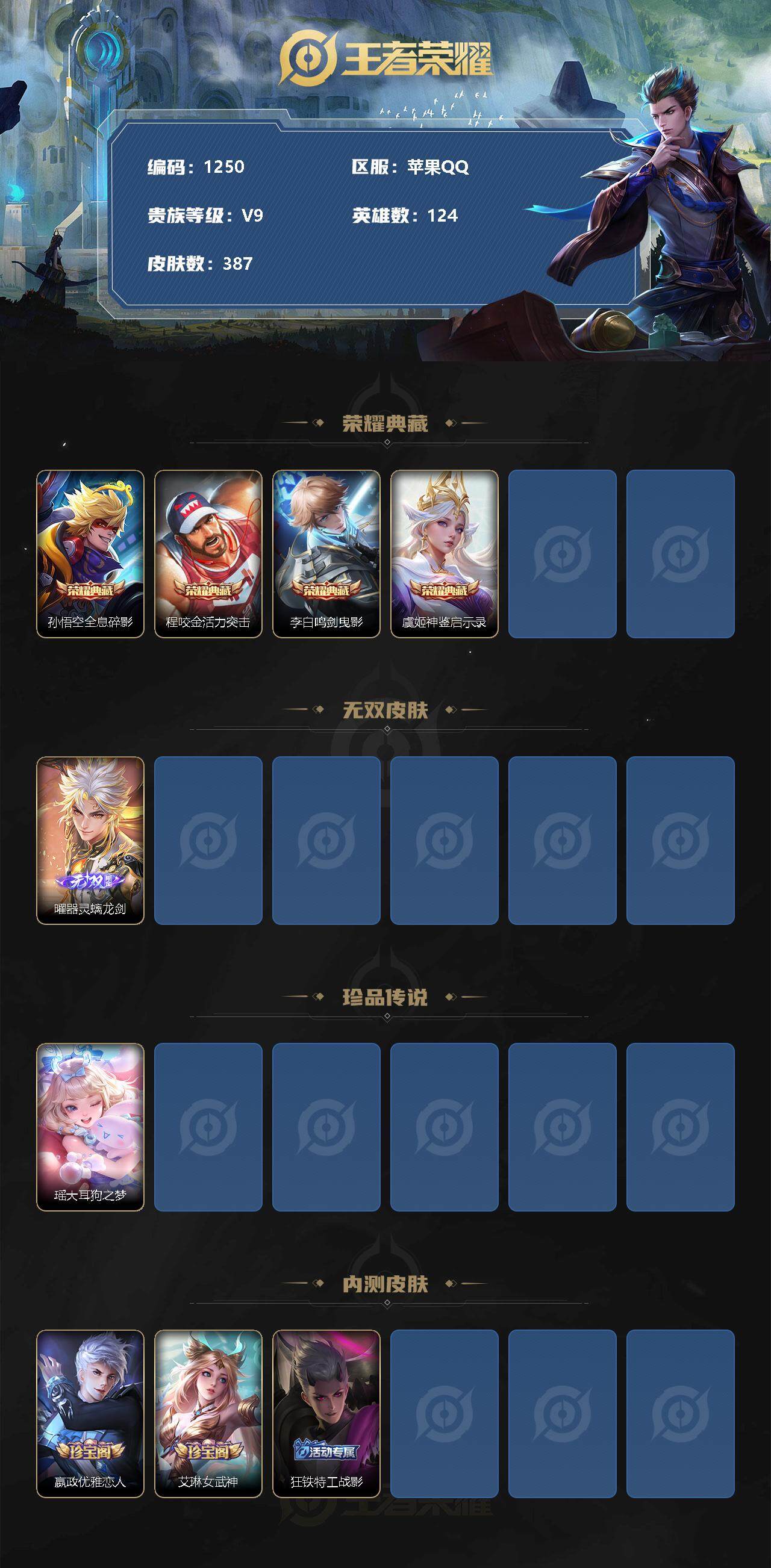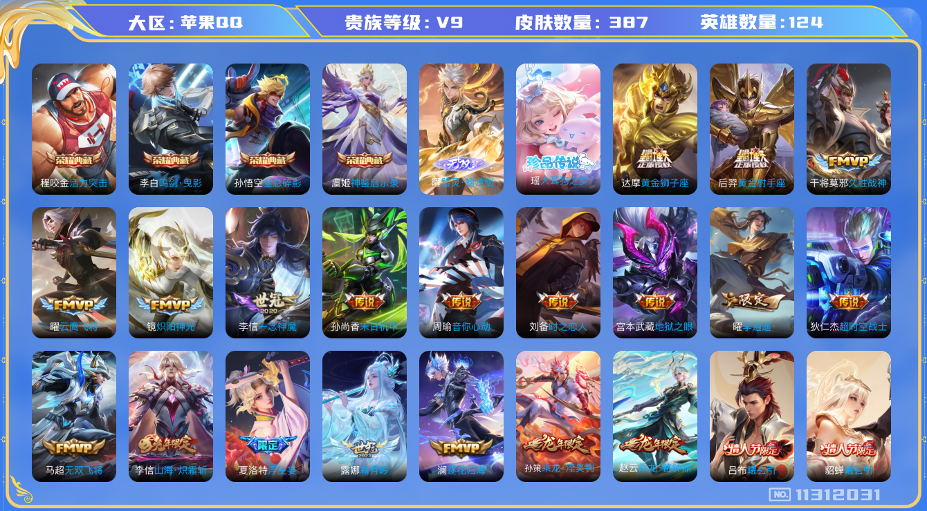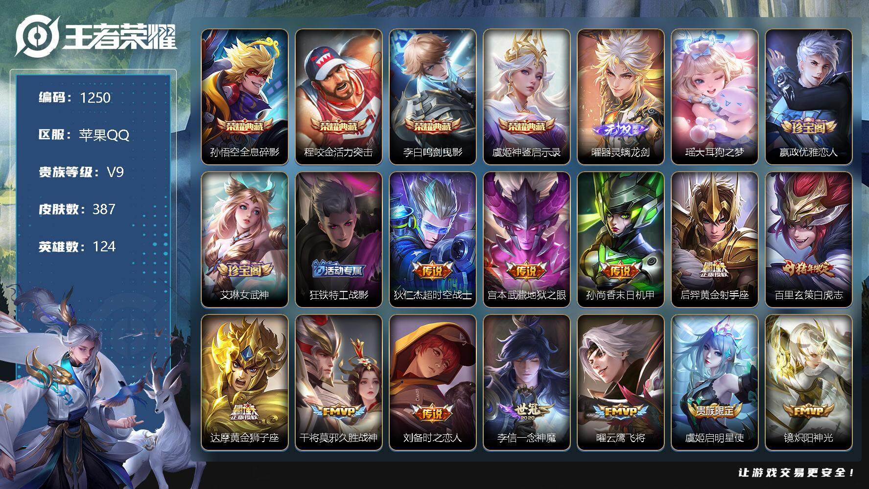 [11312031]【商品标题】:苹果Q-V9-至尊星耀V段位-124英雄-387皮肤-4典藏-0珍品无双-1无双-1珍品传说-31传说-115史诗