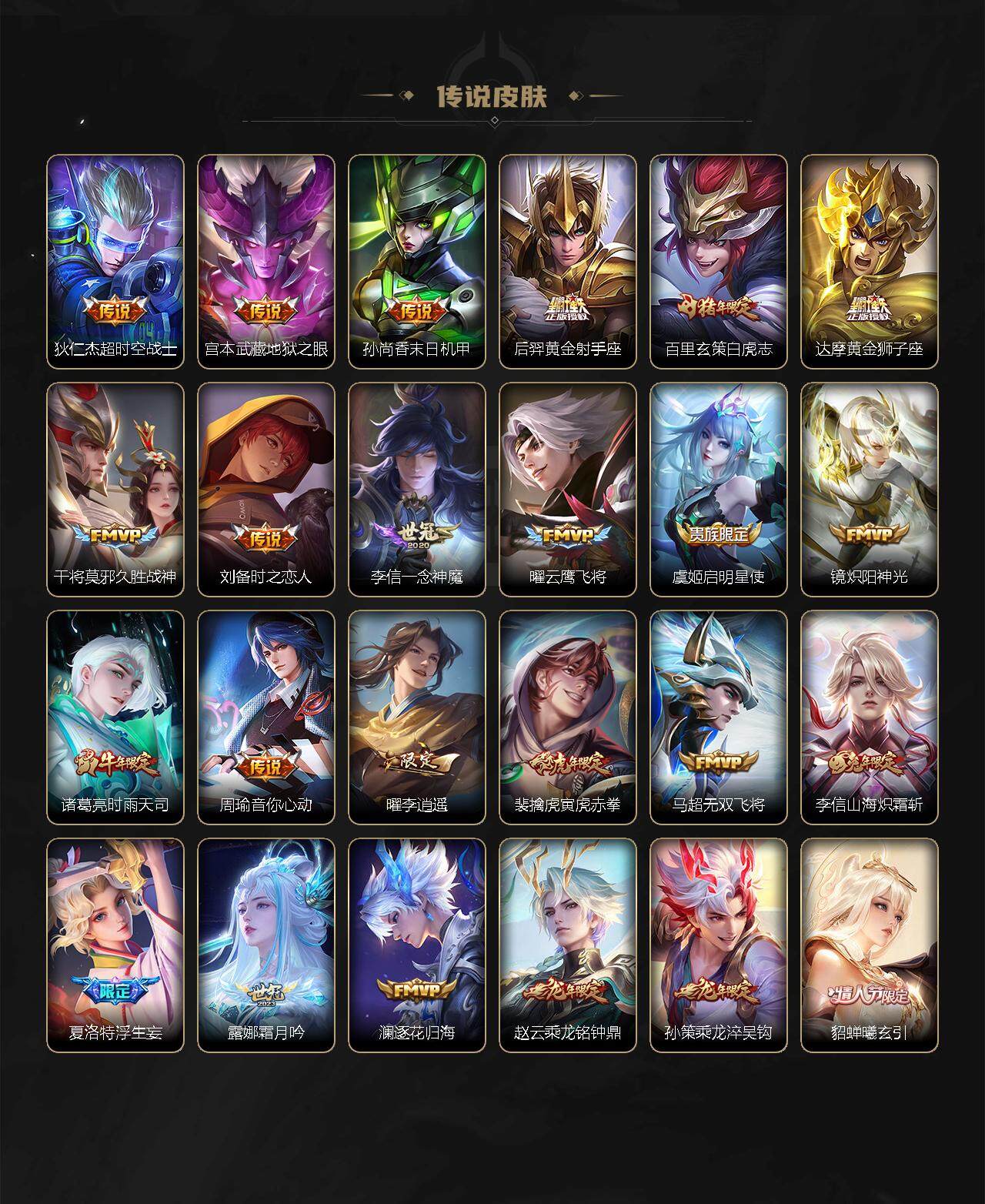 【传说皮肤】:狄仁杰超时空战士,宫本武藏地狱之眼,孙尚香末日机甲,后羿黄金射手座,百里玄策白虎志,达摩黄金狮子座,干将莫邪久胜战神,刘备时之恋人,李信一念神魔,曜云鹰飞将,虞姬启明星使,镜炽阳神光,诸葛亮时雨天司,周瑜音你心动,曜李逍遥 ,裴擒虎寅虎赤拳,马超无双飞将,李信山海炽霜斩,夏洛特浮生妄,露娜霜月吟,澜逐花归海,赵云乘龙铭钟鼎,孙策乘龙淬吴钩,貂蝉曦玄引,吕布曦玄引,亚连落雪白狼,铠冥王哈迪斯,桑启鸣野蒿,云缨幻光神枪,澜愿照九州拓,司空震愿照山河定