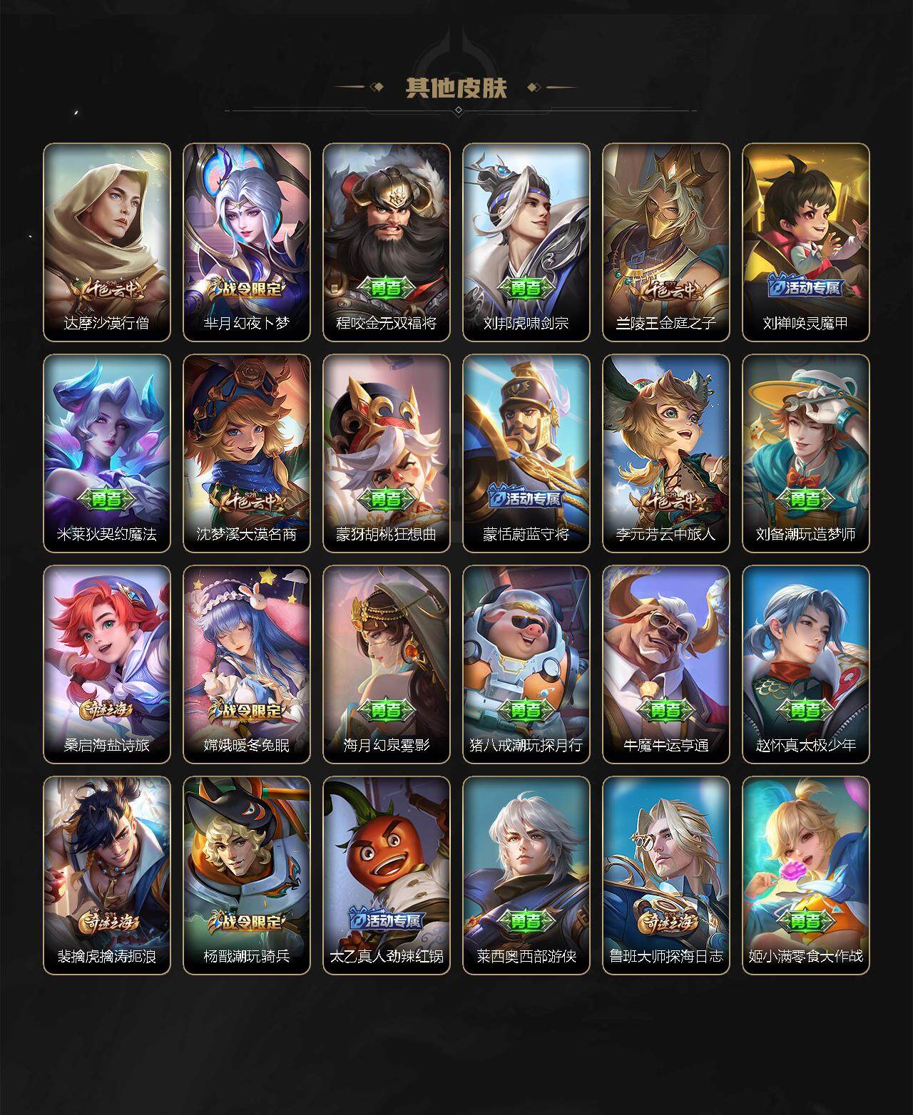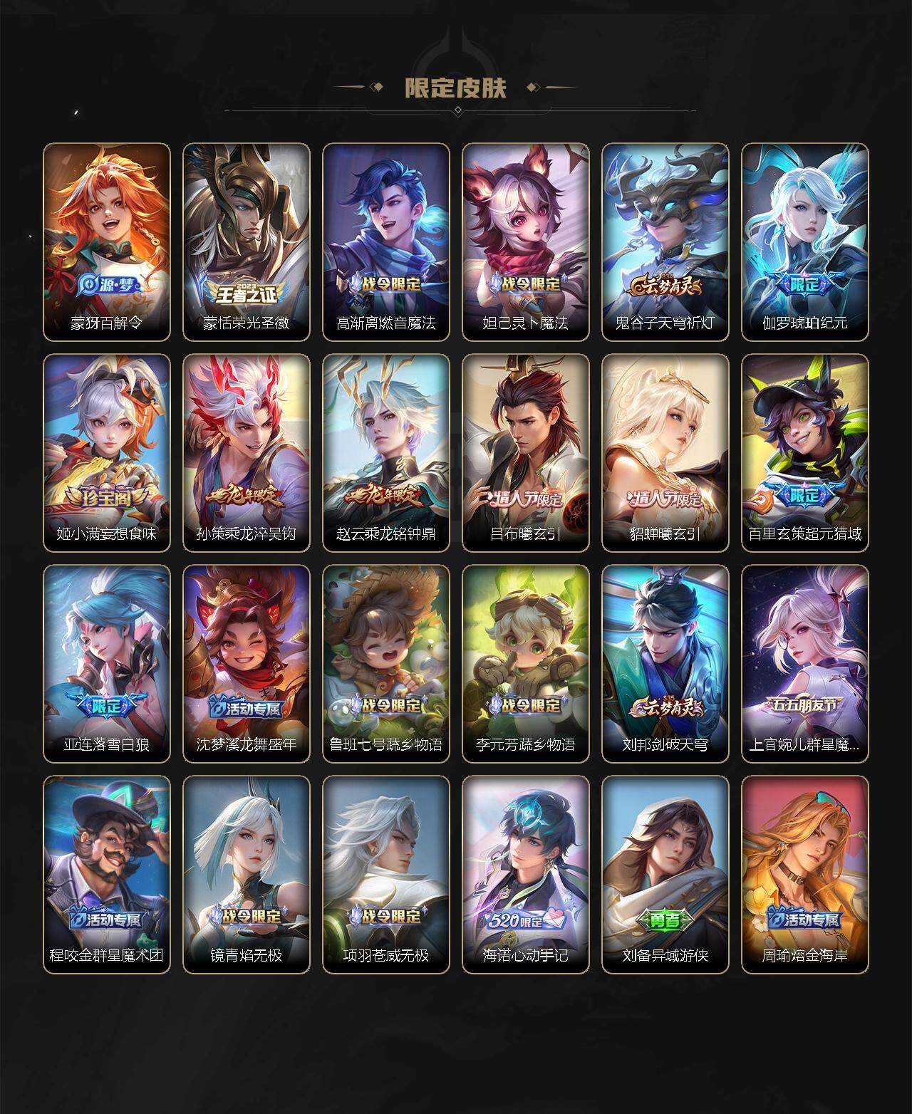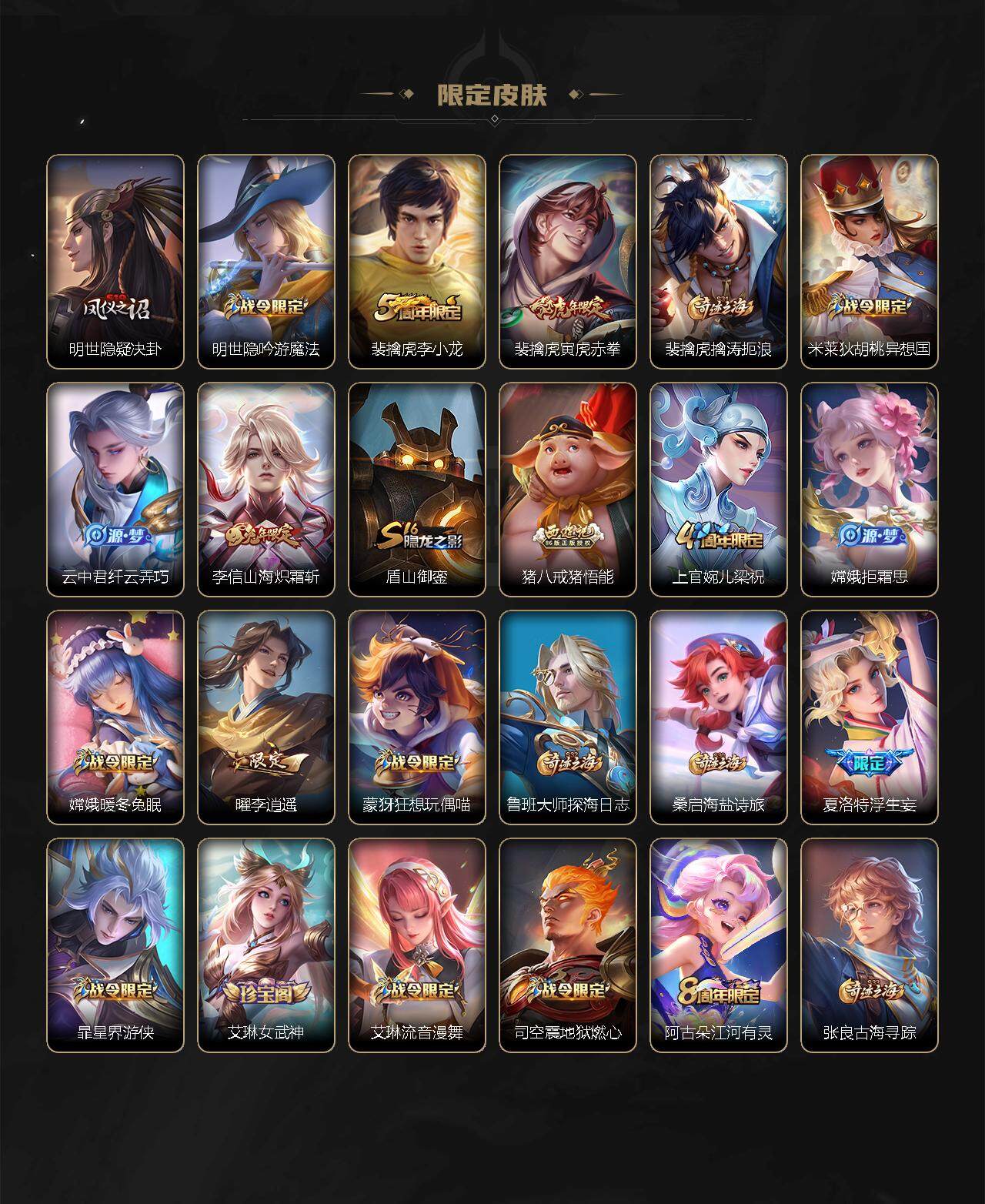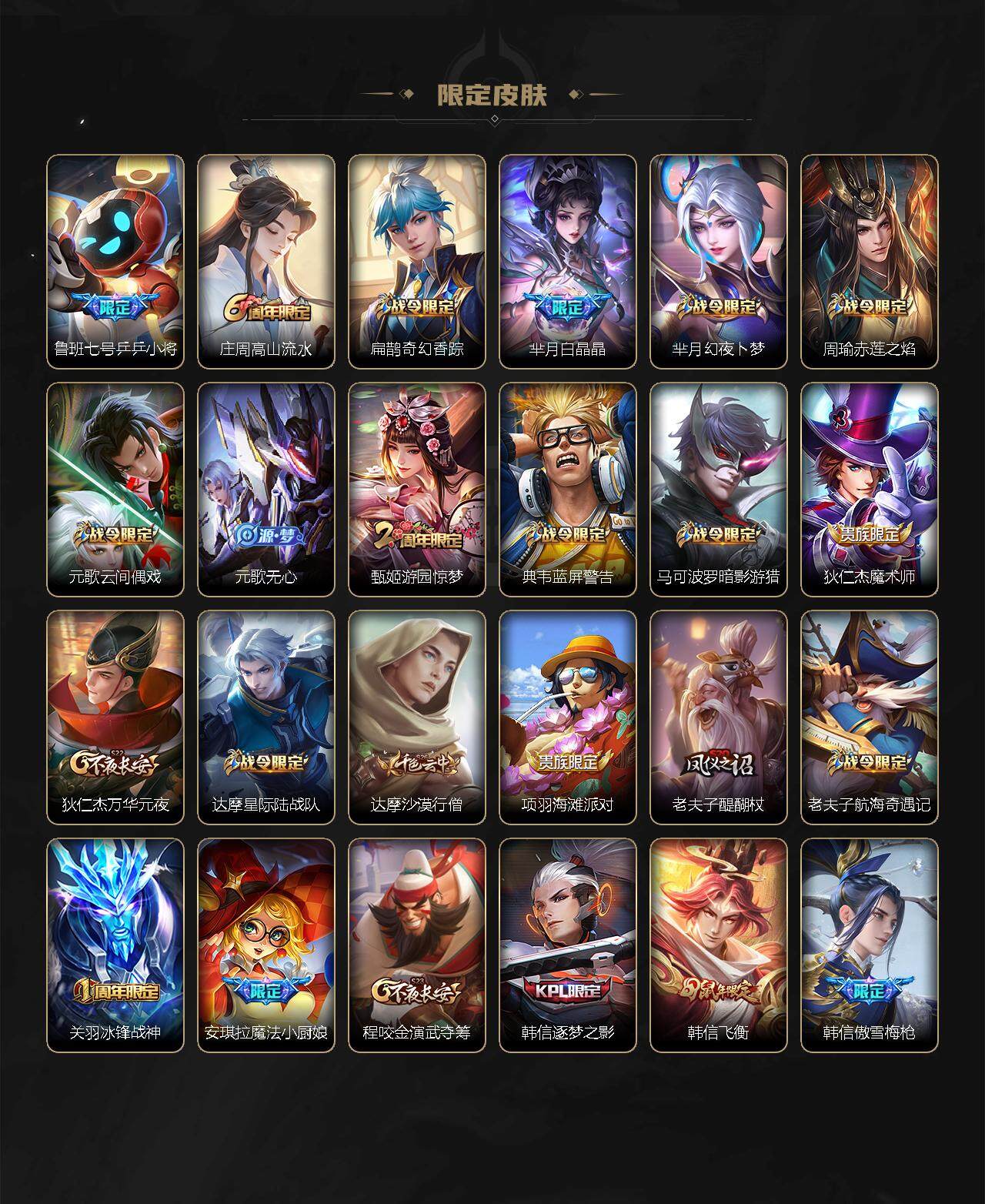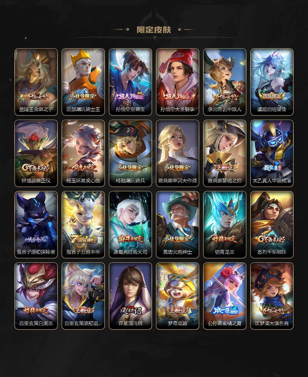 【限定皮肤】:铠冥王哈迪斯,暃埋骨钱,蒙犽顽岩魄,蔡文姬夏日便利店,大乔绒语心约,虞姬夏日便利店,姜子牙天穹之誓,狄仁杰阴阳师,赵云皇家上将,墨子神迹守卫,嬴政优雅恋人,嬴政白昼王子,鲁班七号乒乒小将,庄周高山流水,扁鹊奇幻香踪,芈月白晶晶,芈月幻夜卜梦,周瑜赤莲之焰,元歌云间偶戏,元歌无心,甄姬游园惊梦,典韦蓝屏警告,马可波罗暗影游猎,狄仁杰魔术师,狄仁杰万华元夜,达摩星际陆战队,达摩沙漠行僧,项羽海滩派对,老夫子醍醐杖,老夫子航海奇遇记,关羽冰锋战神,安琪拉魔法小厨娘,程咬金演武夺筹,韩信逐梦之影,韩信飞衡,韩信傲雪梅枪,兰陵王金庭之子,亚瑟潮玩骑士王,孙悟空至尊宝,孙悟空大圣娶亲,李元芳云中旅人,虞姬启明星使,钟馗驱傩正仪,杨玉环寅虎心曲,杨戬潮玩骑兵,雅典娜单词大作战,雅典娜黎明之约,太乙真人华丽摇滚,鬼谷子原初探秘者,鬼谷子五谷丰年,诸葛亮时雨天司,黄忠火炮绅士,铠青龙志,苏烈千军破阵,百里玄策白虎志,百里玄策原初追逐者,弈星混沌棋,梦奇顽趣,公孙离蜜橘之夏,沈梦溪大漠名商,明世隐疑决卦,明世隐吟游魔法,裴擒虎李小龙,裴擒虎寅虎赤拳,裴擒虎擒涛扼浪,米莱狄胡桃异想国,云中君纤云弄巧,李信山海炽霜斩,盾山御銮,猪八戒猪悟能,上官婉儿梁祝,嫦娥拒霜思,嫦娥暖冬兔眠,曜李逍遥 ,蒙犽狂想玩偶喵,鲁班大师探海日志,桑启海盐诗旅,夏洛特浮生妄,暃星界游侠,艾琳女武神,艾琳流音漫舞,司空震地狱燃心,