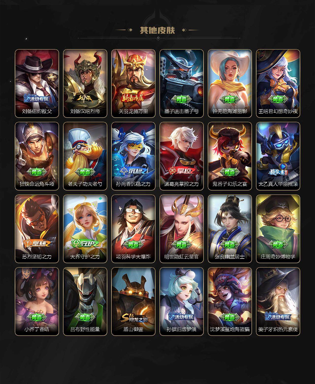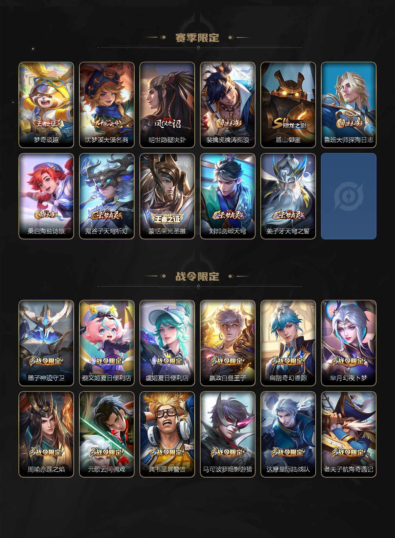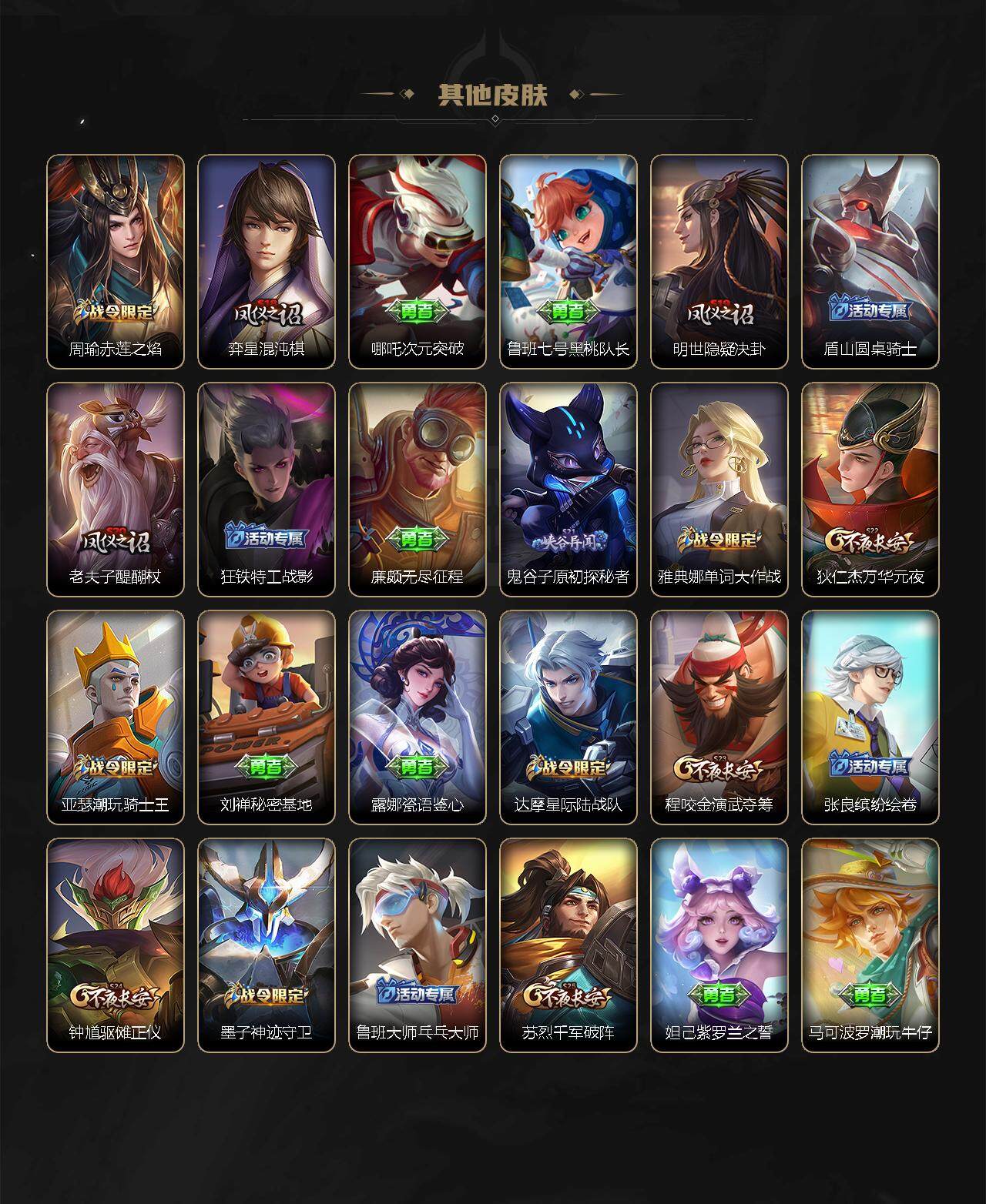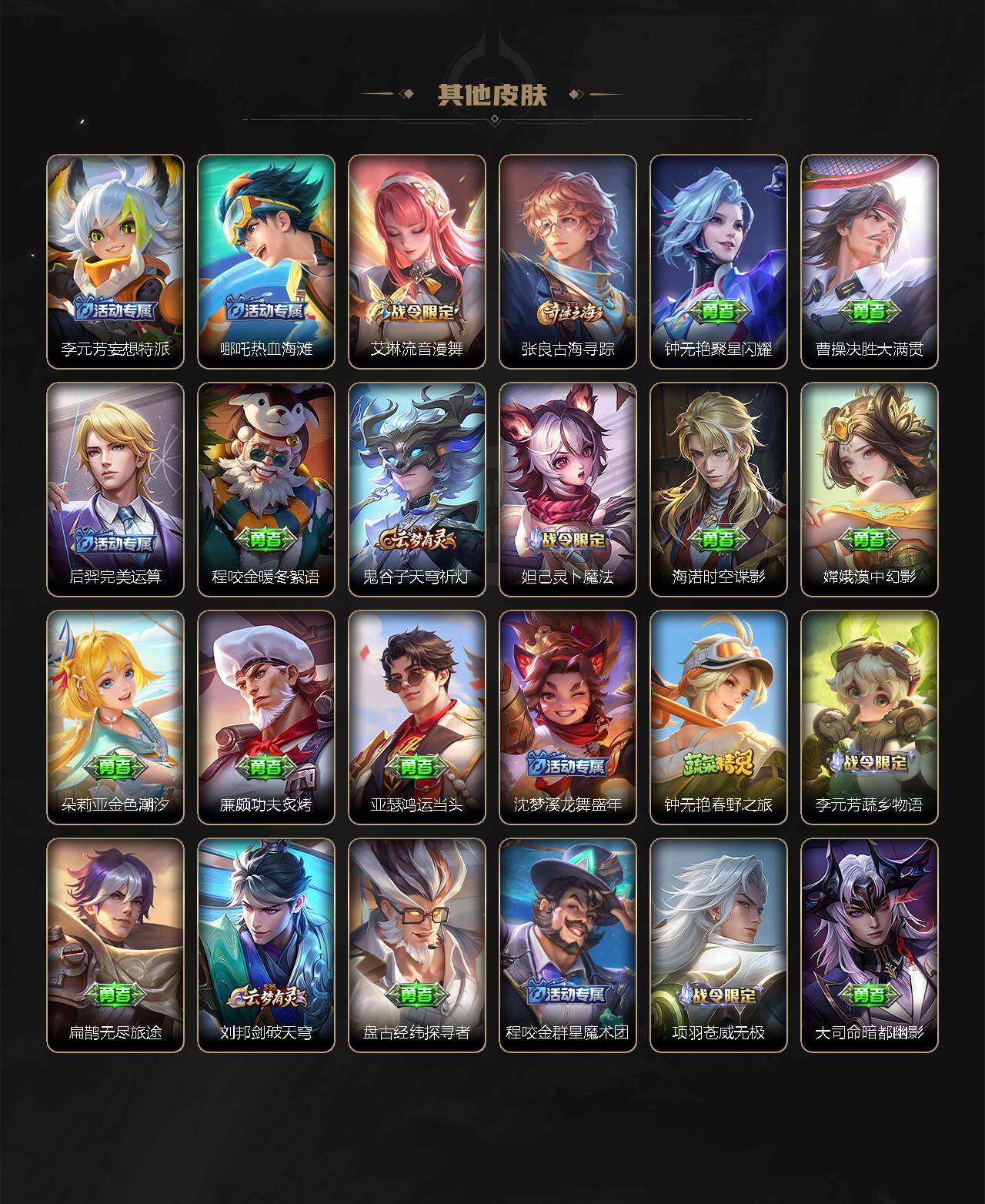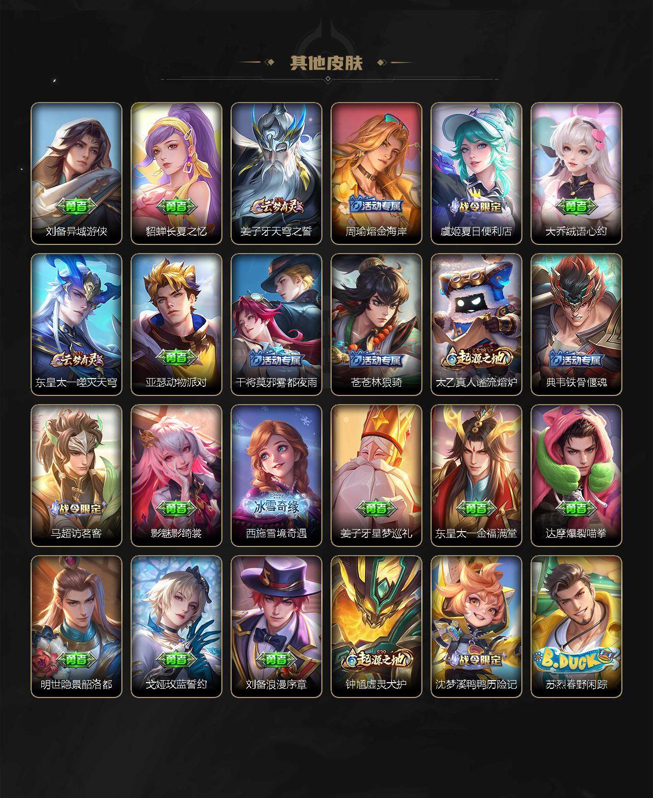 【限定皮肤】:铠冥王哈迪斯,暃埋骨钱,蒙犽顽岩魄,蔡文姬夏日便利店,大乔绒语心约,虞姬夏日便利店,姜子牙天穹之誓,狄仁杰阴阳师,赵云皇家上将,墨子神迹守卫,嬴政优雅恋人,嬴政白昼王子,鲁班七号乒乒小将,庄周高山流水,扁鹊奇幻香踪,芈月白晶晶,芈月幻夜卜梦,周瑜赤莲之焰,元歌云间偶戏,元歌无心,甄姬游园惊梦,典韦蓝屏警告,马可波罗暗影游猎,狄仁杰魔术师,狄仁杰万华元夜,达摩星际陆战队,达摩沙漠行僧,项羽海滩派对,老夫子醍醐杖,老夫子航海奇遇记,关羽冰锋战神,安琪拉魔法小厨娘,程咬金演武夺筹,韩信逐梦之影,韩信飞衡,韩信傲雪梅枪,兰陵王金庭之子,亚瑟潮玩骑士王,孙悟空至尊宝,孙悟空大圣娶亲,李元芳云中旅人,虞姬启明星使,钟馗驱傩正仪,杨玉环寅虎心曲,杨戬潮玩骑兵,雅典娜单词大作战,雅典娜黎明之约,太乙真人华丽摇滚,鬼谷子原初探秘者,鬼谷子五谷丰年,诸葛亮时雨天司,黄忠火炮绅士,铠青龙志,苏烈千军破阵,百里玄策白虎志,百里玄策原初追逐者,弈星混沌棋,梦奇顽趣,公孙离蜜橘之夏,沈梦溪大漠名商,明世隐疑决卦,明世隐吟游魔法,裴擒虎李小龙,裴擒虎寅虎赤拳,裴擒虎擒涛扼浪,米莱狄胡桃异想国,云中君纤云弄巧,李信山海炽霜斩,盾山御銮,猪八戒猪悟能,上官婉儿梁祝,嫦娥拒霜思,嫦娥暖冬兔眠,曜李逍遥 ,蒙犽狂想玩偶喵,鲁班大师探海日志,桑启海盐诗旅,夏洛特浮生妄,暃星界游侠,艾琳女武神,艾琳流音漫舞,司空震地狱燃心,