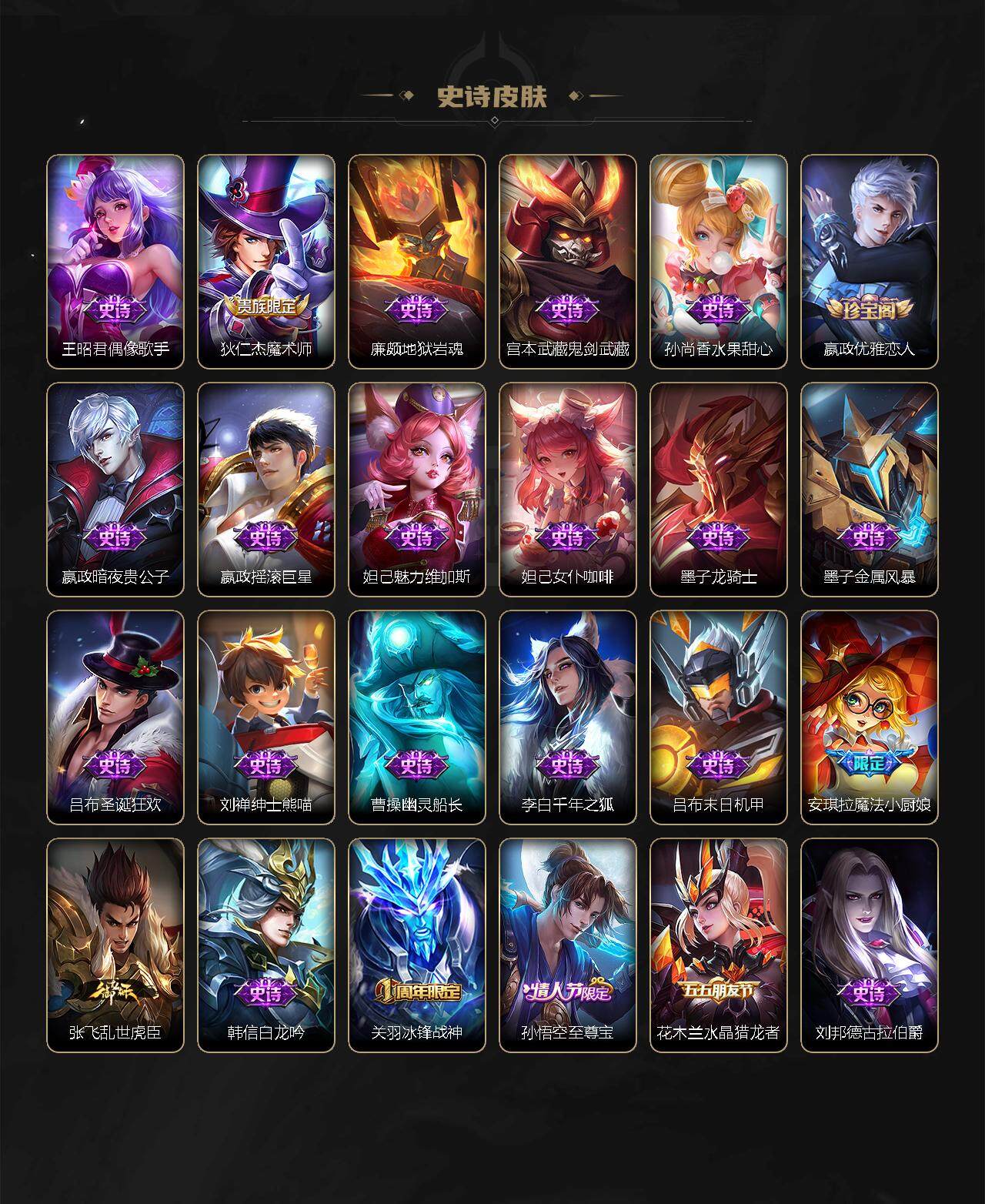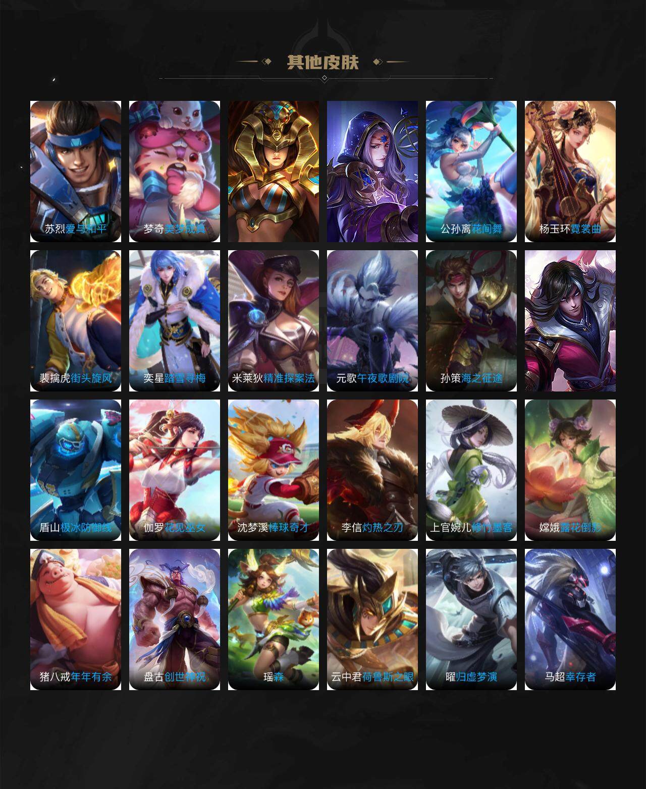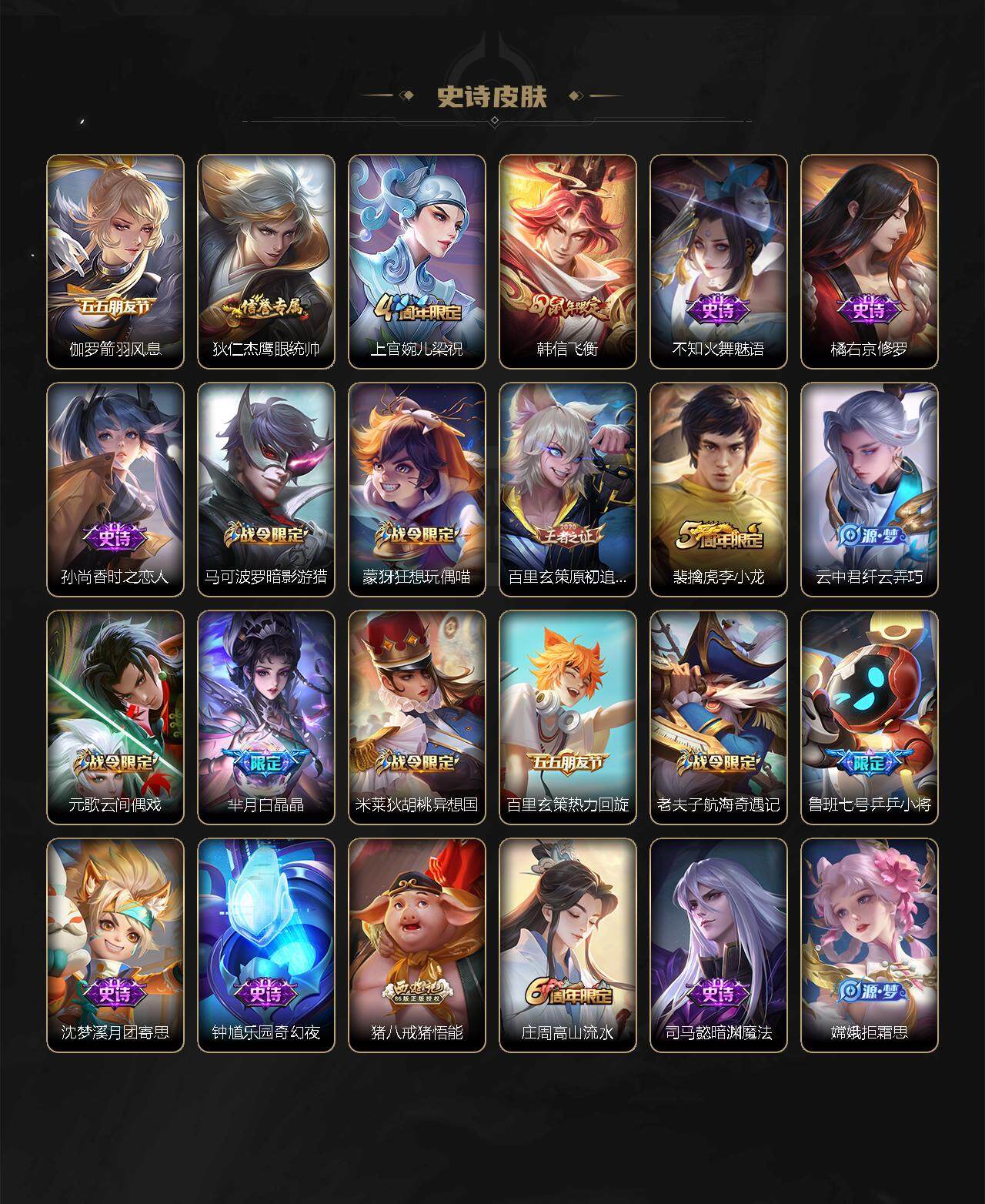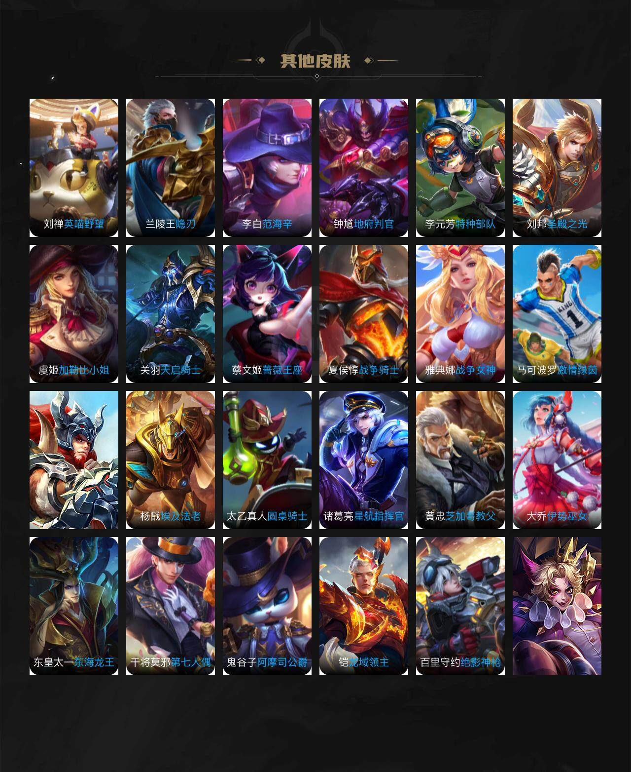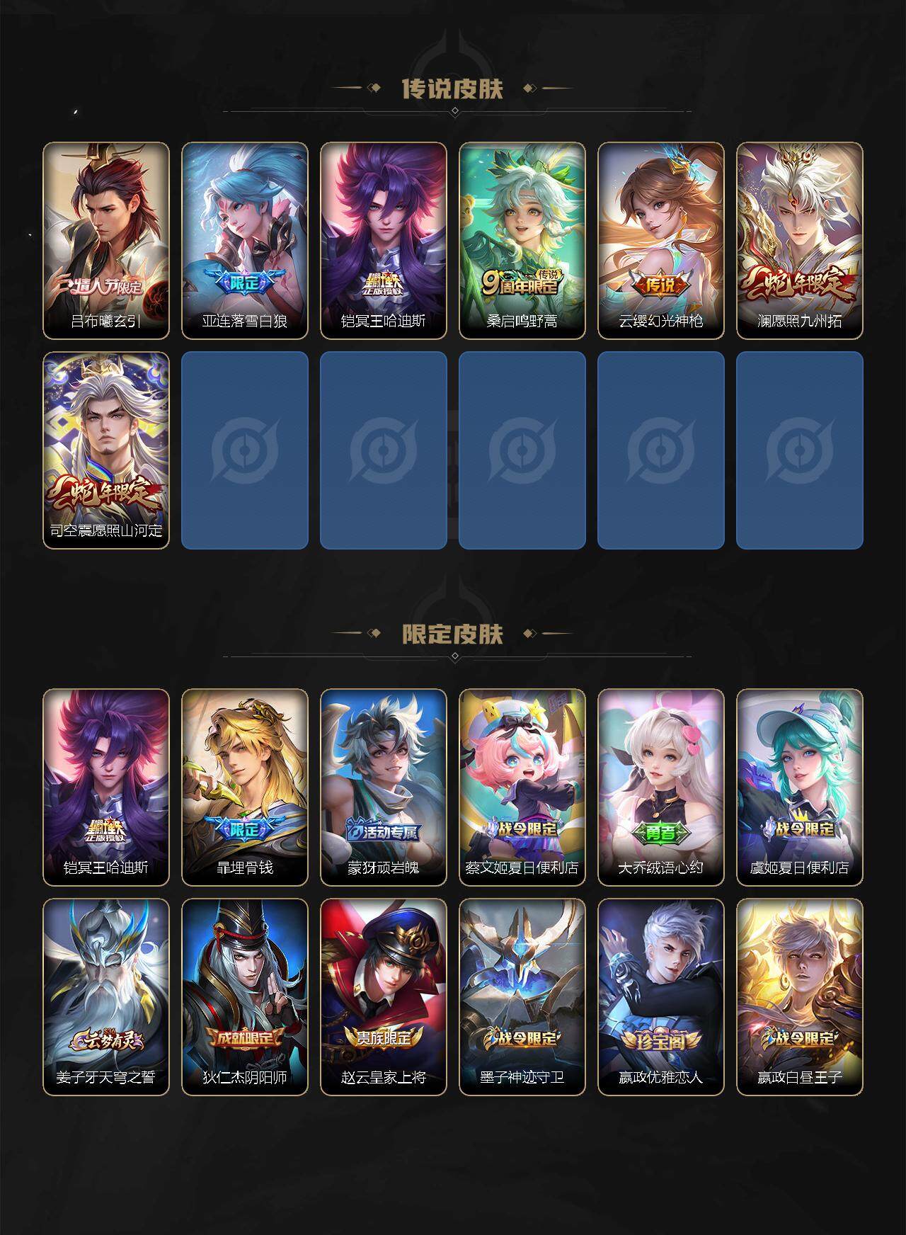 【限定皮肤】:铠冥王哈迪斯,暃埋骨钱,蒙犽顽岩魄,蔡文姬夏日便利店,大乔绒语心约,虞姬夏日便利店,姜子牙天穹之誓,狄仁杰阴阳师,赵云皇家上将,墨子神迹守卫,嬴政优雅恋人,嬴政白昼王子,鲁班七号乒乒小将,庄周高山流水,扁鹊奇幻香踪,芈月白晶晶,芈月幻夜卜梦,周瑜赤莲之焰,元歌云间偶戏,元歌无心,甄姬游园惊梦,典韦蓝屏警告,马可波罗暗影游猎,狄仁杰魔术师,狄仁杰万华元夜,达摩星际陆战队,达摩沙漠行僧,项羽海滩派对,老夫子醍醐杖,老夫子航海奇遇记,关羽冰锋战神,安琪拉魔法小厨娘,程咬金演武夺筹,韩信逐梦之影,韩信飞衡,韩信傲雪梅枪,兰陵王金庭之子,亚瑟潮玩骑士王,孙悟空至尊宝,孙悟空大圣娶亲,李元芳云中旅人,虞姬启明星使,钟馗驱傩正仪,杨玉环寅虎心曲,杨戬潮玩骑兵,雅典娜单词大作战,雅典娜黎明之约,太乙真人华丽摇滚,鬼谷子原初探秘者,鬼谷子五谷丰年,诸葛亮时雨天司,黄忠火炮绅士,铠青龙志,苏烈千军破阵,百里玄策白虎志,百里玄策原初追逐者,弈星混沌棋,梦奇顽趣,公孙离蜜橘之夏,沈梦溪大漠名商,明世隐疑决卦,明世隐吟游魔法,裴擒虎李小龙,裴擒虎寅虎赤拳,裴擒虎擒涛扼浪,米莱狄胡桃异想国,云中君纤云弄巧,李信山海炽霜斩,盾山御銮,猪八戒猪悟能,上官婉儿梁祝,嫦娥拒霜思,嫦娥暖冬兔眠,曜李逍遥 ,蒙犽狂想玩偶喵,鲁班大师探海日志,桑启海盐诗旅,夏洛特浮生妄,暃星界游侠,艾琳女武神,艾琳流音漫舞,司空震地狱燃心,