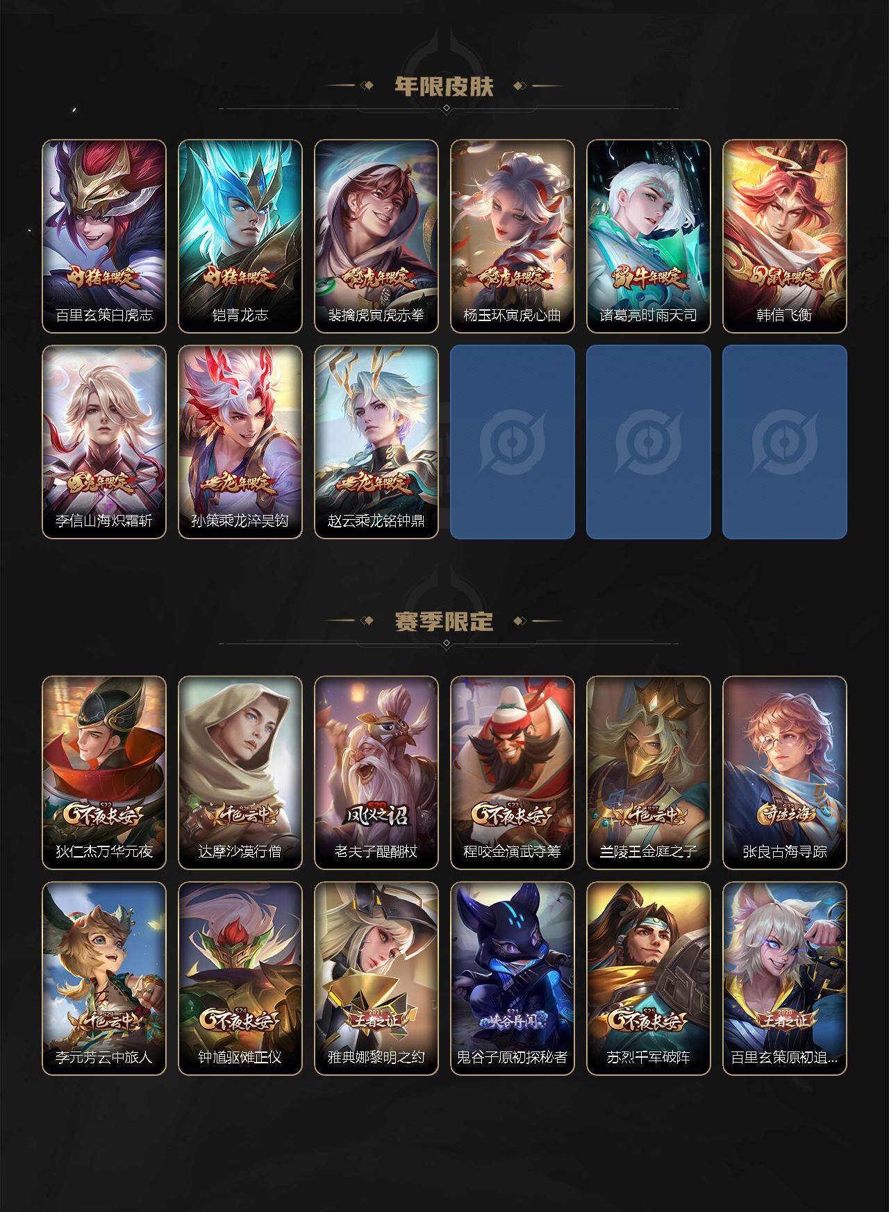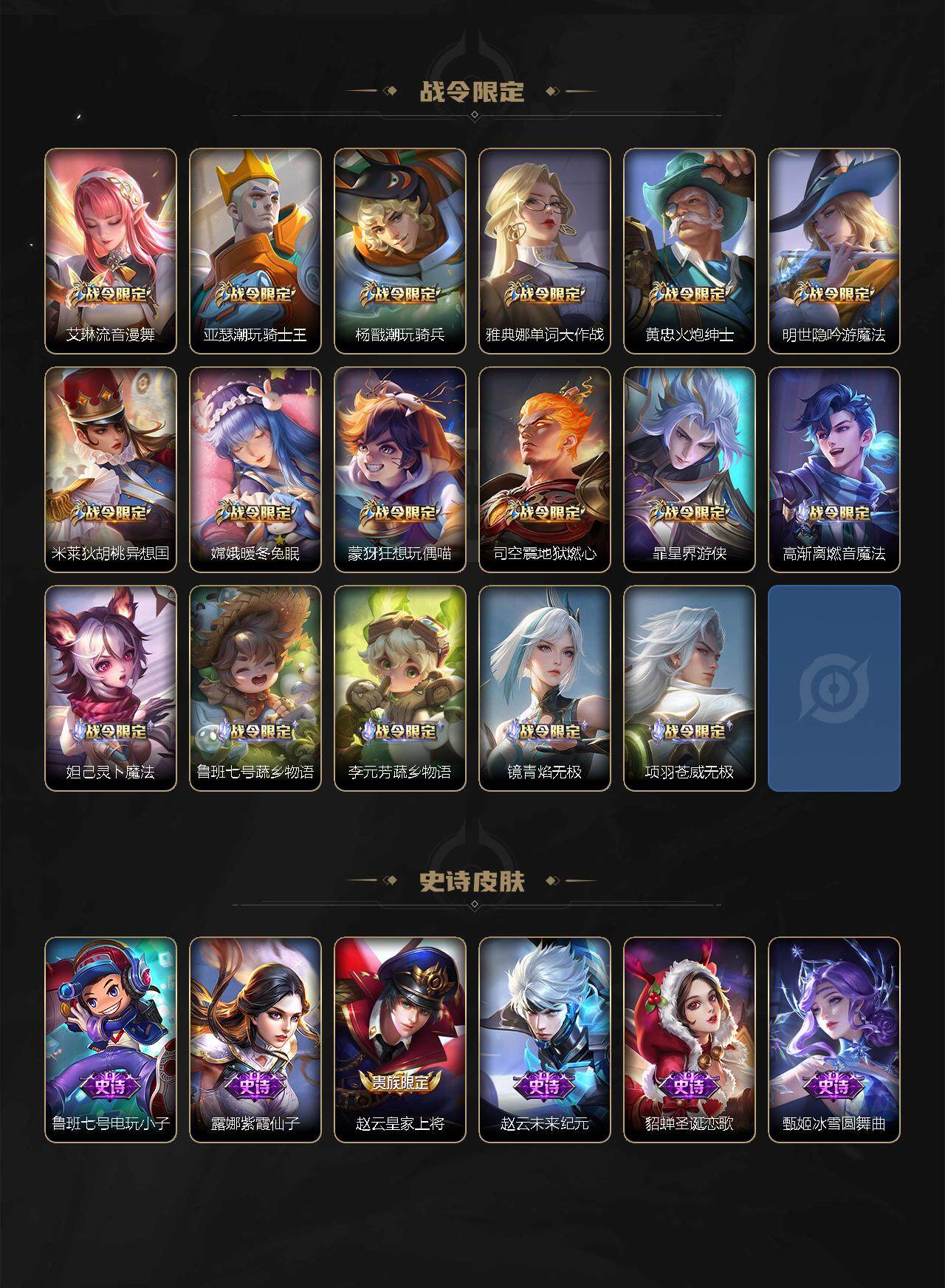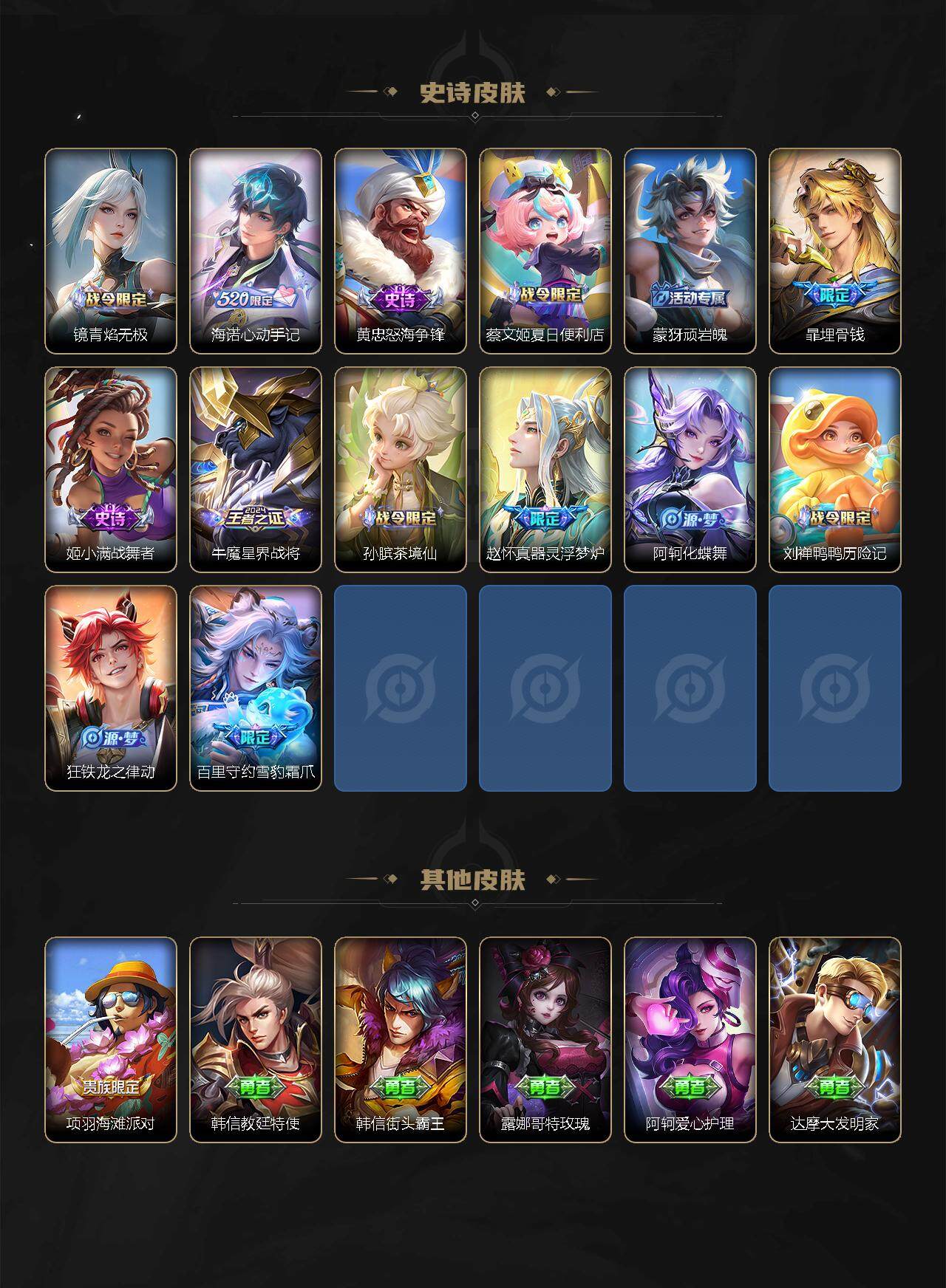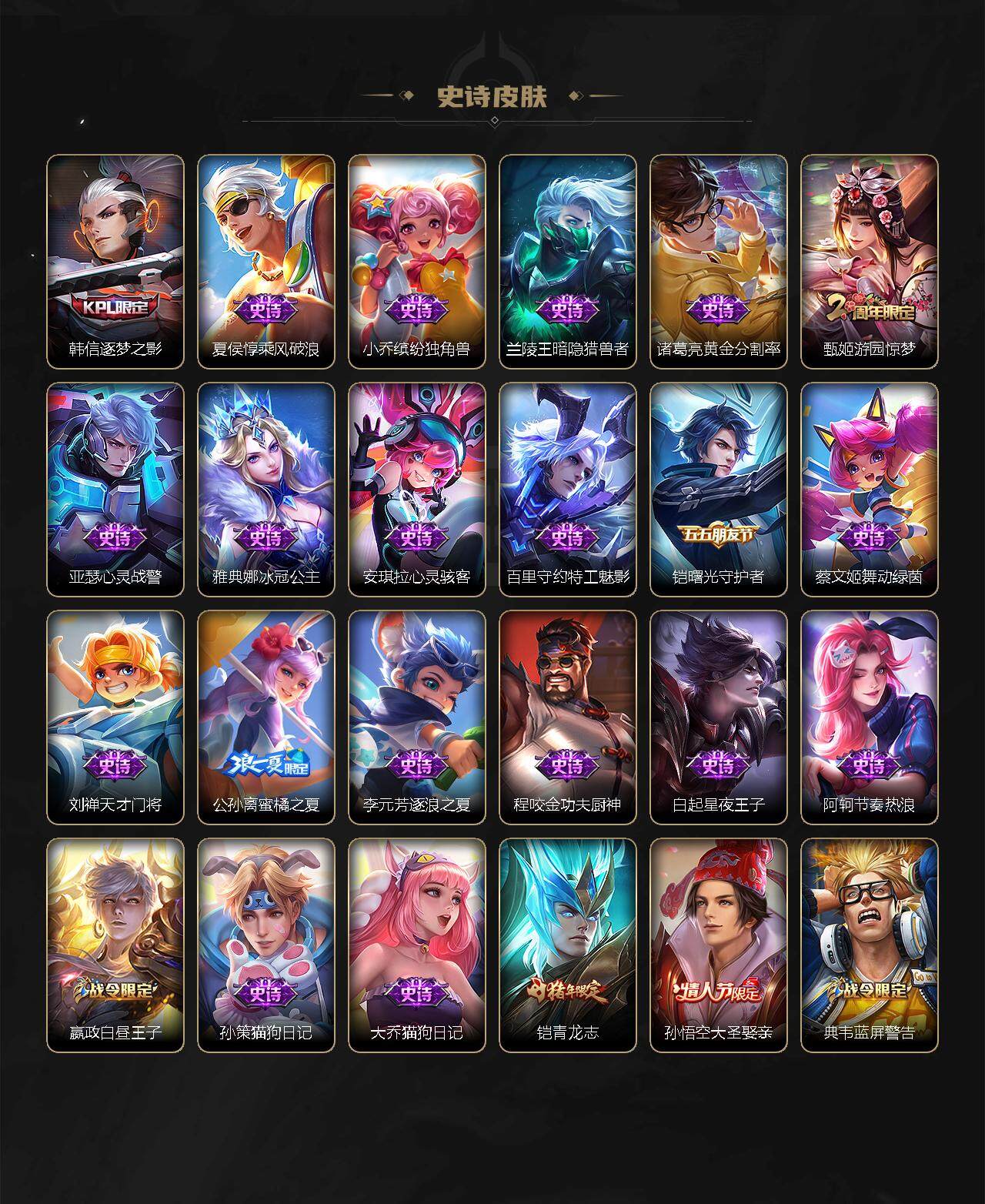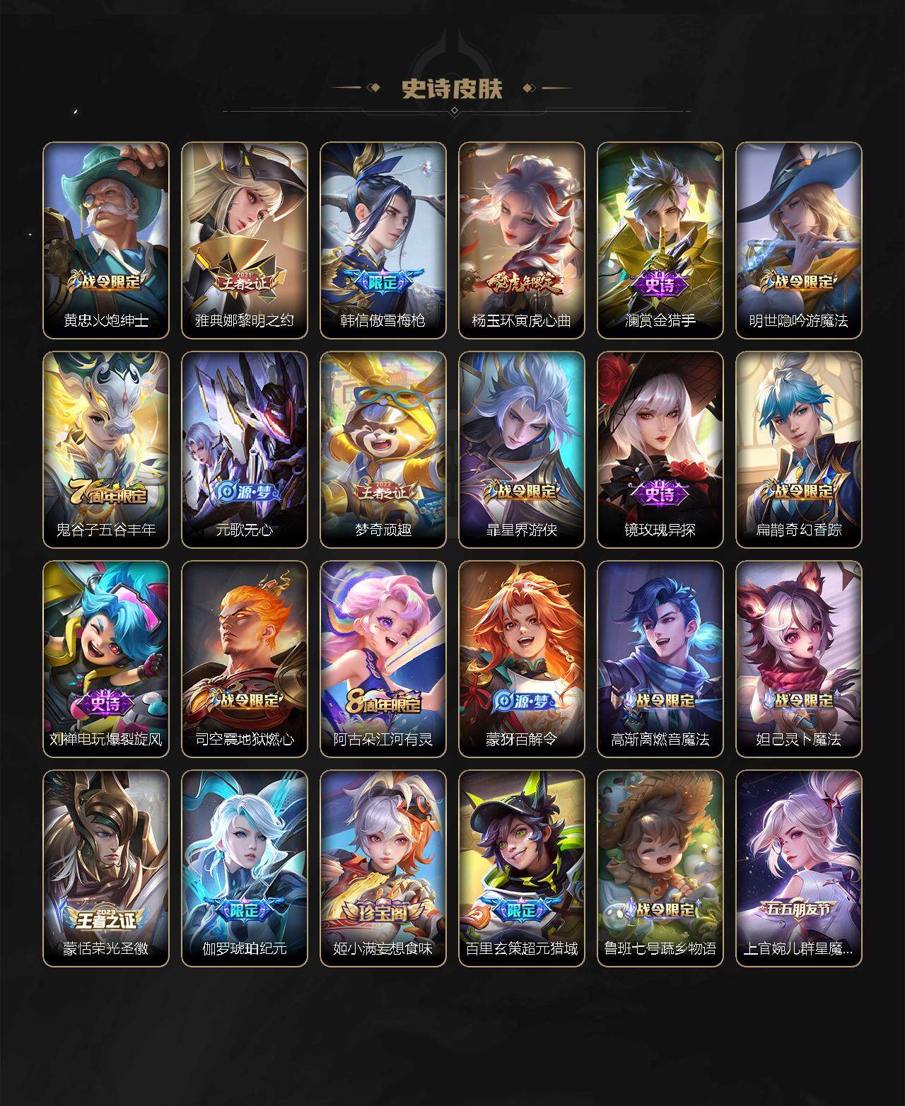 【限定皮肤】:铠冥王哈迪斯,暃埋骨钱,蒙犽顽岩魄,蔡文姬夏日便利店,大乔绒语心约,虞姬夏日便利店,姜子牙天穹之誓,狄仁杰阴阳师,赵云皇家上将,墨子神迹守卫,嬴政优雅恋人,嬴政白昼王子,鲁班七号乒乒小将,庄周高山流水,扁鹊奇幻香踪,芈月白晶晶,芈月幻夜卜梦,周瑜赤莲之焰,元歌云间偶戏,元歌无心,甄姬游园惊梦,典韦蓝屏警告,马可波罗暗影游猎,狄仁杰魔术师,狄仁杰万华元夜,达摩星际陆战队,达摩沙漠行僧,项羽海滩派对,老夫子醍醐杖,老夫子航海奇遇记,关羽冰锋战神,安琪拉魔法小厨娘,程咬金演武夺筹,韩信逐梦之影,韩信飞衡,韩信傲雪梅枪,兰陵王金庭之子,亚瑟潮玩骑士王,孙悟空至尊宝,孙悟空大圣娶亲,李元芳云中旅人,虞姬启明星使,钟馗驱傩正仪,杨玉环寅虎心曲,杨戬潮玩骑兵,雅典娜单词大作战,雅典娜黎明之约,太乙真人华丽摇滚,鬼谷子原初探秘者,鬼谷子五谷丰年,诸葛亮时雨天司,黄忠火炮绅士,铠青龙志,苏烈千军破阵,百里玄策白虎志,百里玄策原初追逐者,弈星混沌棋,梦奇顽趣,公孙离蜜橘之夏,沈梦溪大漠名商,明世隐疑决卦,明世隐吟游魔法,裴擒虎李小龙,裴擒虎寅虎赤拳,裴擒虎擒涛扼浪,米莱狄胡桃异想国,云中君纤云弄巧,李信山海炽霜斩,盾山御銮,猪八戒猪悟能,上官婉儿梁祝,嫦娥拒霜思,嫦娥暖冬兔眠,曜李逍遥 ,蒙犽狂想玩偶喵,鲁班大师探海日志,桑启海盐诗旅,夏洛特浮生妄,暃星界游侠,艾琳女武神,艾琳流音漫舞,司空震地狱燃心,