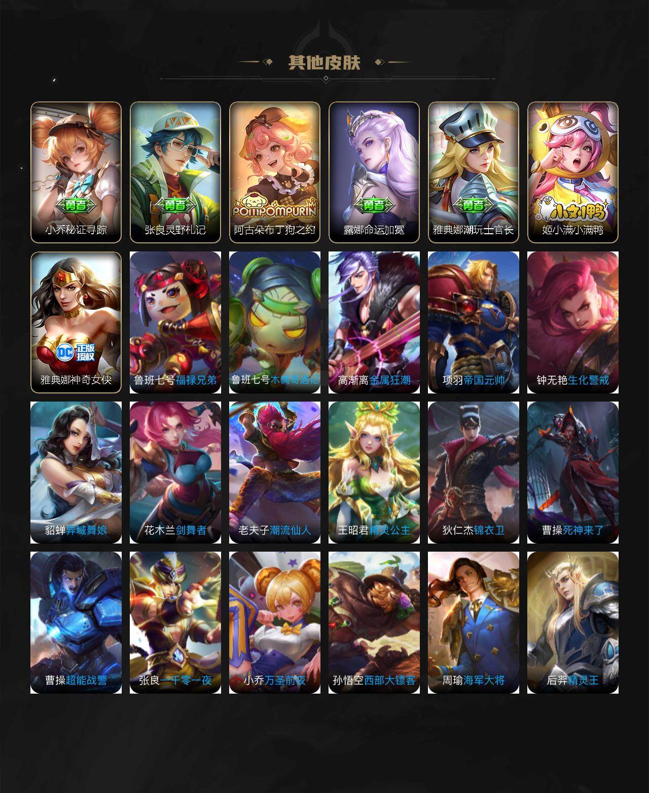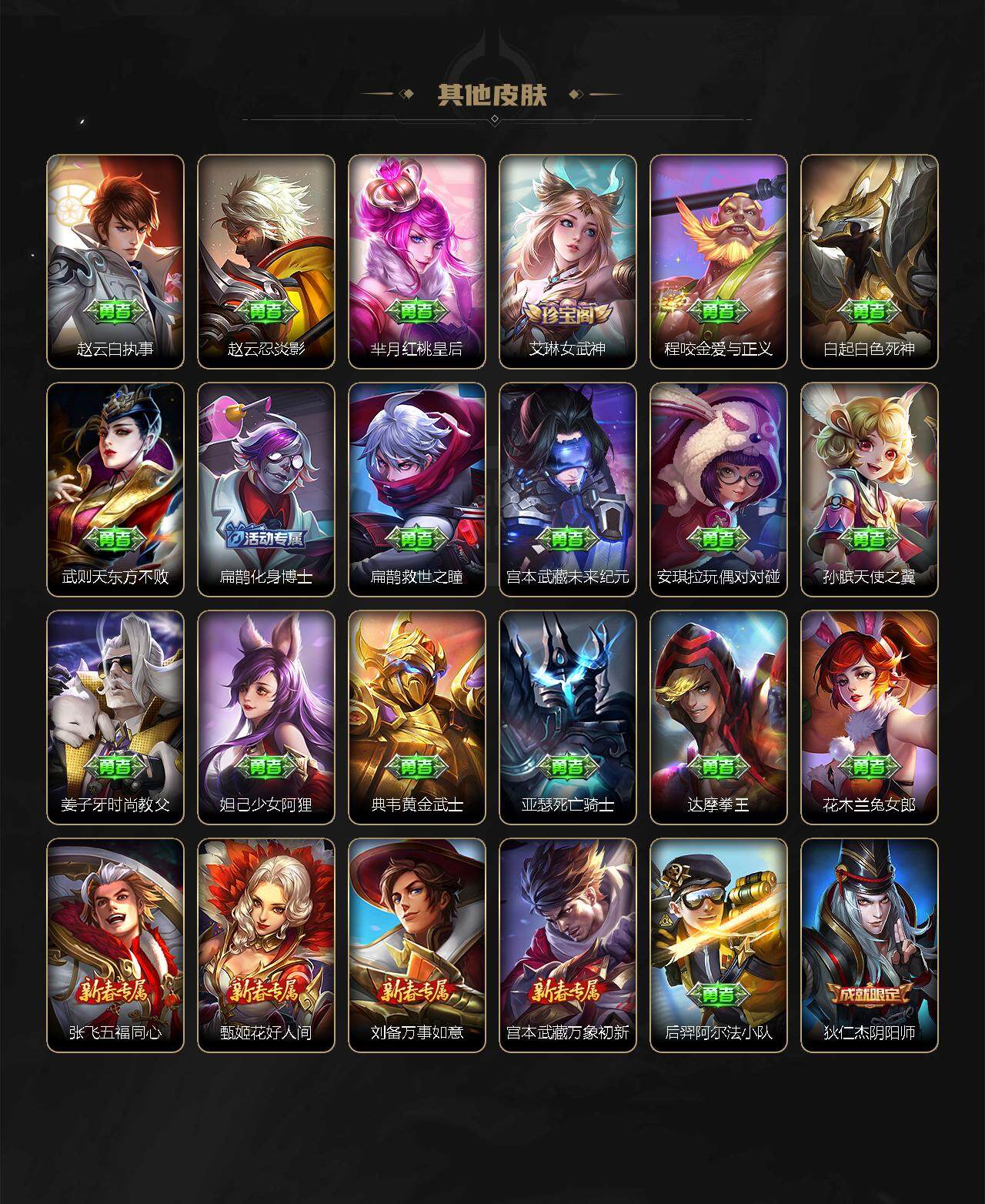 关羽冰锋战神,裴擒虎李小龙,上官婉儿梁祝,诸葛亮时雨天司,韩信飞衡,韩信逐梦之影,铠青龙志,百里玄策白虎志,孙悟空大圣娶亲,孙悟空至尊宝,雅典娜神奇女侠,公孙离蜜橘之夏,芈月白晶晶,安琪拉魔法小厨娘,鲁班七号乒乒小将,猪八戒猪悟能,韩信傲雪梅枪,杨玉环寅虎·心曲,裴擒虎寅虎·赤拳,桑启鸣野蒿,澜愿照·九州拓,司空震愿照·山河定