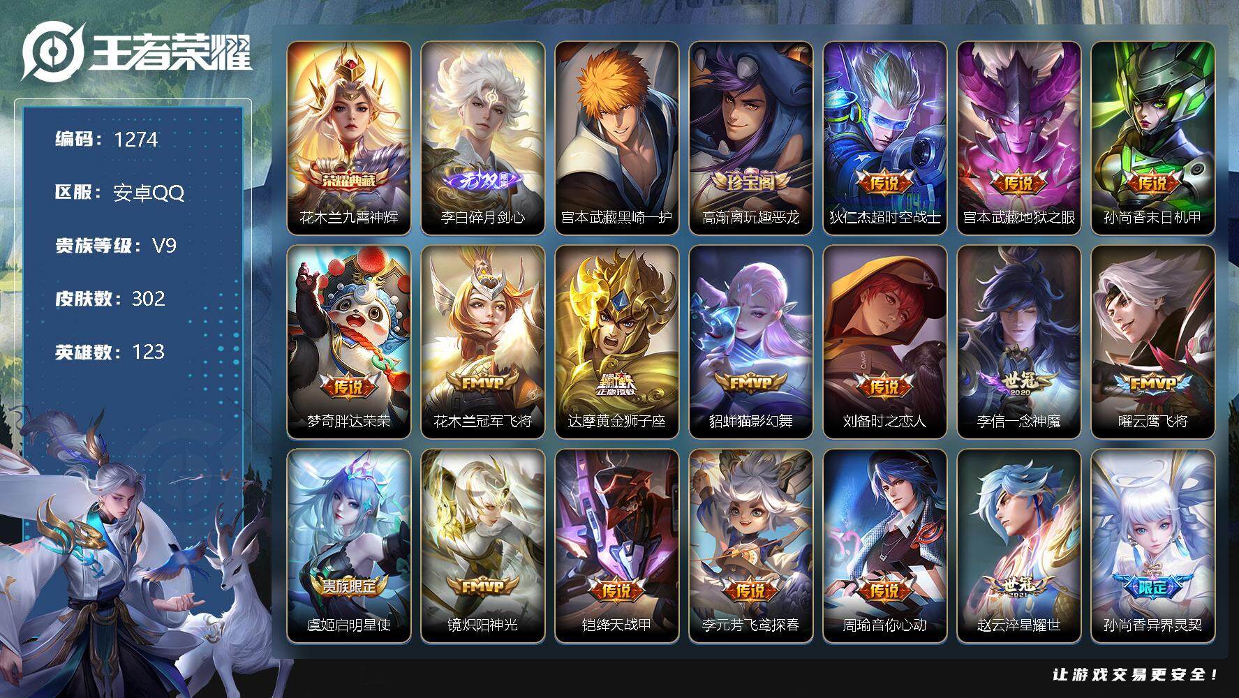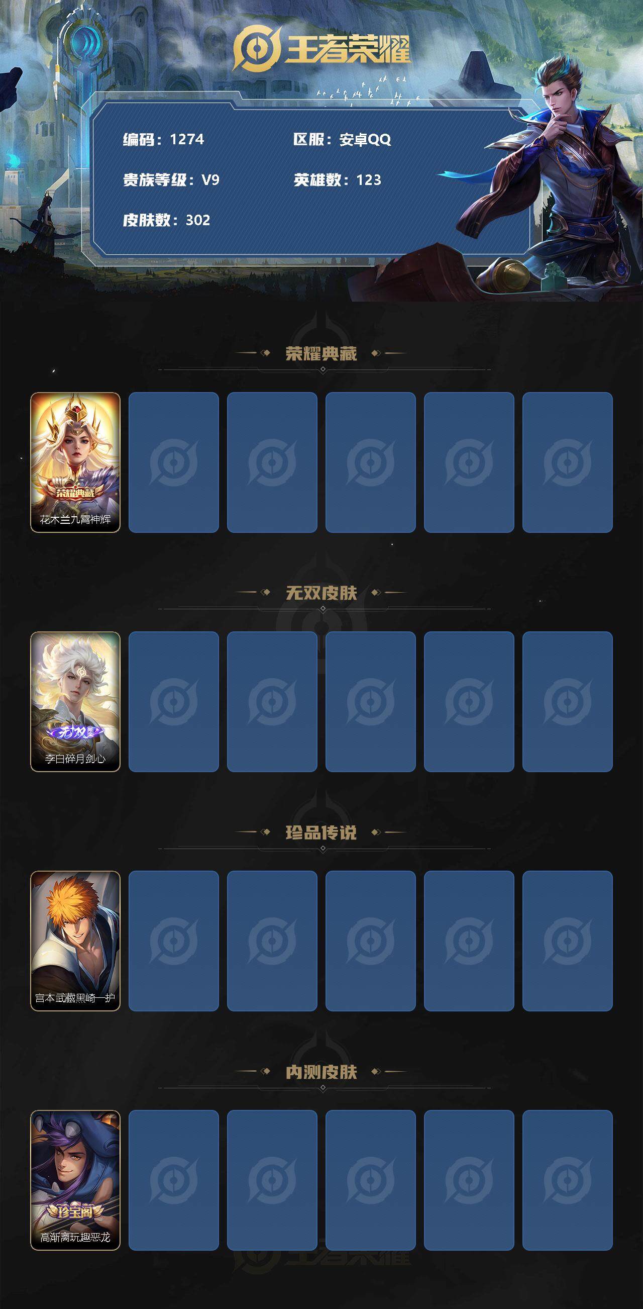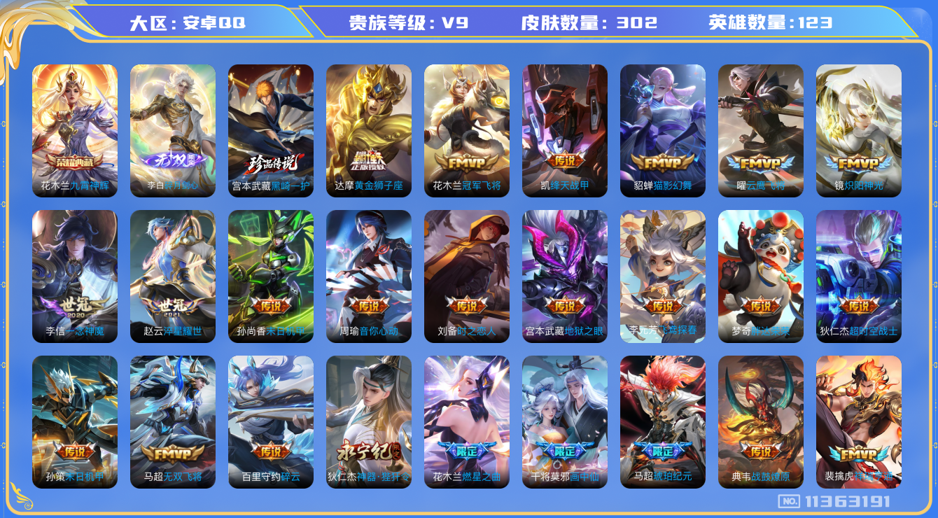 [11363191]【商品标题】:安卓Q-V9-最强王者段位-123英雄-302皮肤-1典藏-0珍品无双-1无双-1珍品传说-36传说-74史诗
