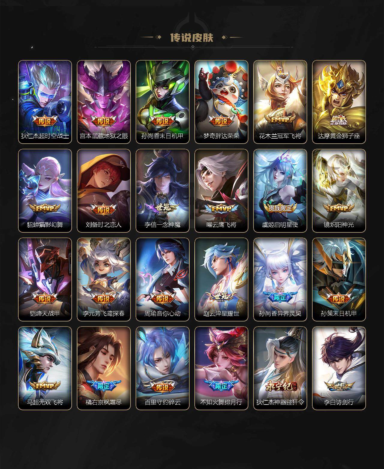 【传说皮肤】:公孙离云诺千山,杨玉环星之鸣奏,司空震愿照山河定,女娲愿照千秋盛,澜愿照九州拓,裴擒虎祥瑞亨通,典韦战鼓燎原,马超琥珀纪元,干将莫邪画中仙,花木兰燃星之曲,孙悟空齐天大圣,吕布怒海麟威,李白诗剑行,狄仁杰神器狴犴令,不知火舞绯月行,百里守约碎云,橘右京枫霜尽,马超无双飞将,孙策末日机甲,孙尚香异界灵契,赵云淬星耀世,周瑜音你心动,李元芳飞鸢探春,铠绛天战甲,镜炽阳神光,虞姬启明星使,曜云鹰飞将,李信一念神魔,刘备时之恋人,貂蝉猫影幻舞,达摩黄金狮子座,花木兰冠军飞将,梦奇胖达荣荣,孙尚香末日机甲,宫本武藏地狱之眼,狄仁杰超时空战士