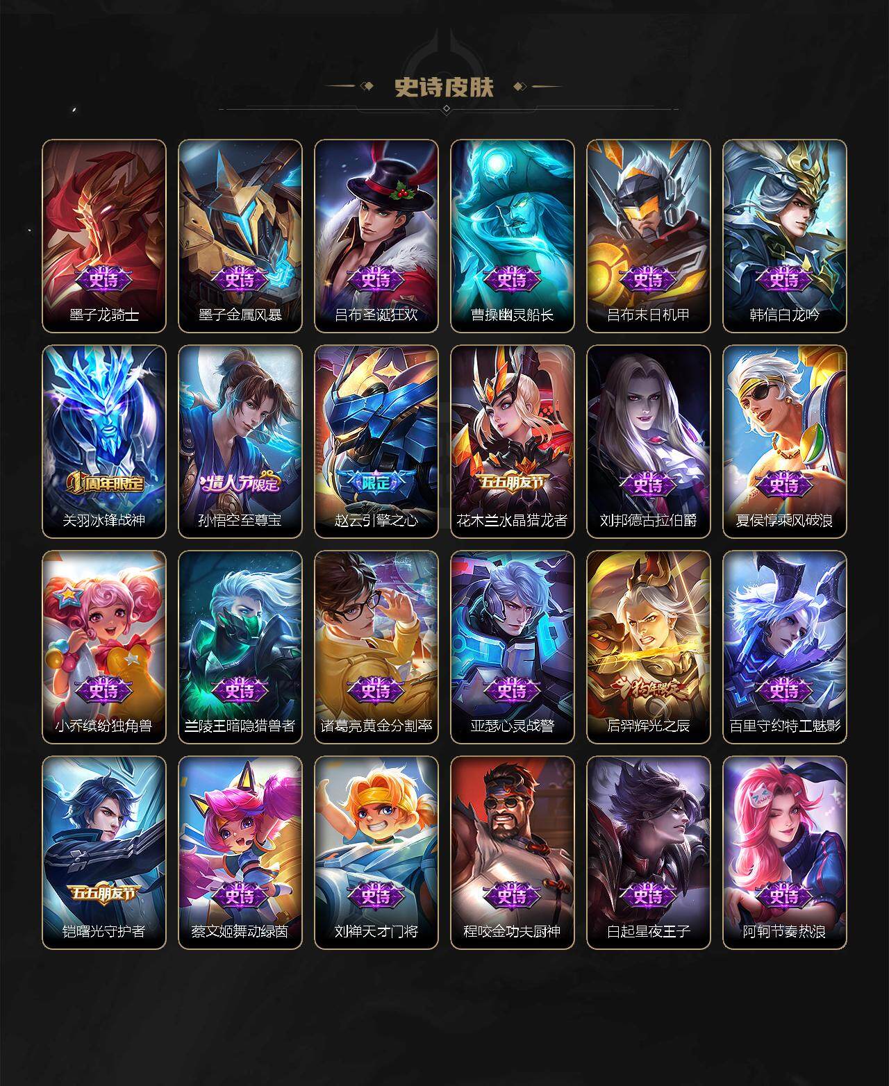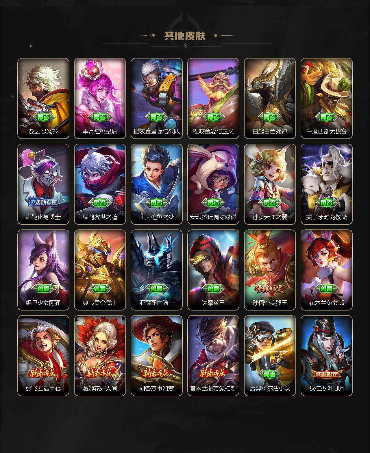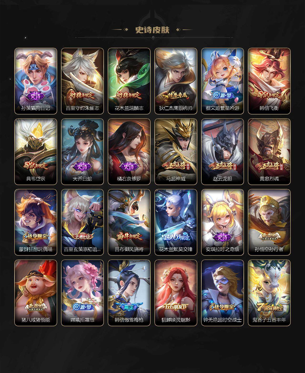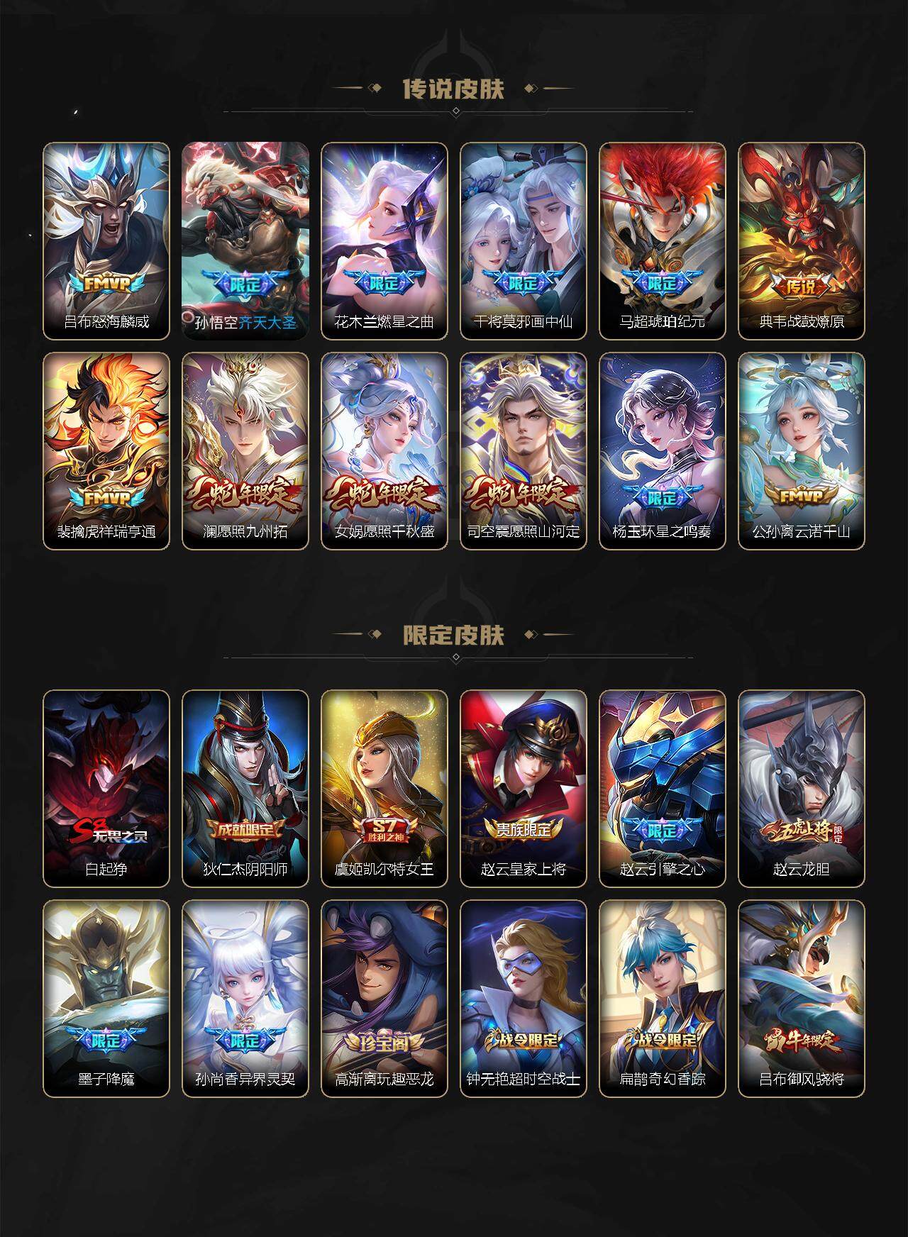 关羽冰锋战神,吕布御风骁将,赵云龙胆,黄忠烈魂,马超神威,后羿辉光之辰,典韦岱宗,韩信飞衡,花木兰瑞麟志,百里守约朱雀志,花木兰默契交锋,孙悟空至尊宝,赵云引擎之心,孙悟空美猴王,猪八戒猪悟能,孙尚香异界灵契,孙悟空孙行者,韩信傲雪梅枪,橘右京枫霜尽,不知火舞绯月行,墨子降魔,李白诗剑行,马可波罗山海·玄木吟,澜愿照·九州拓,司空震愿照·山河定,女娲愿照·千秋盛