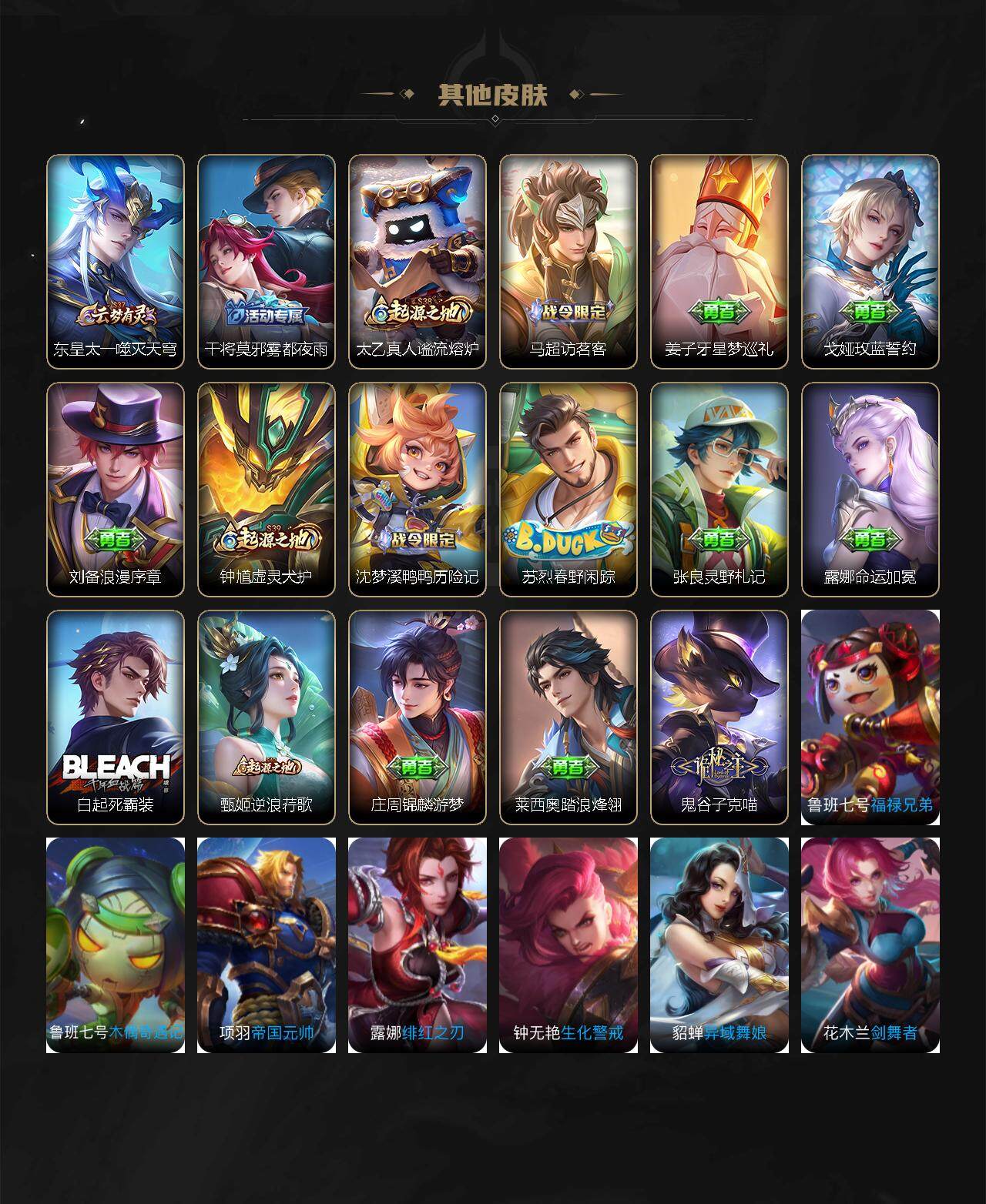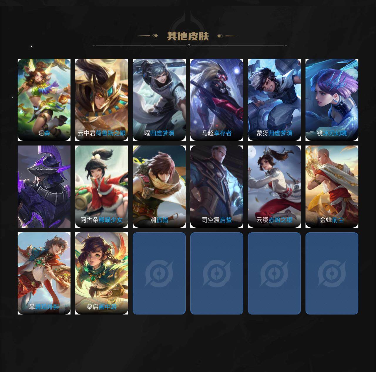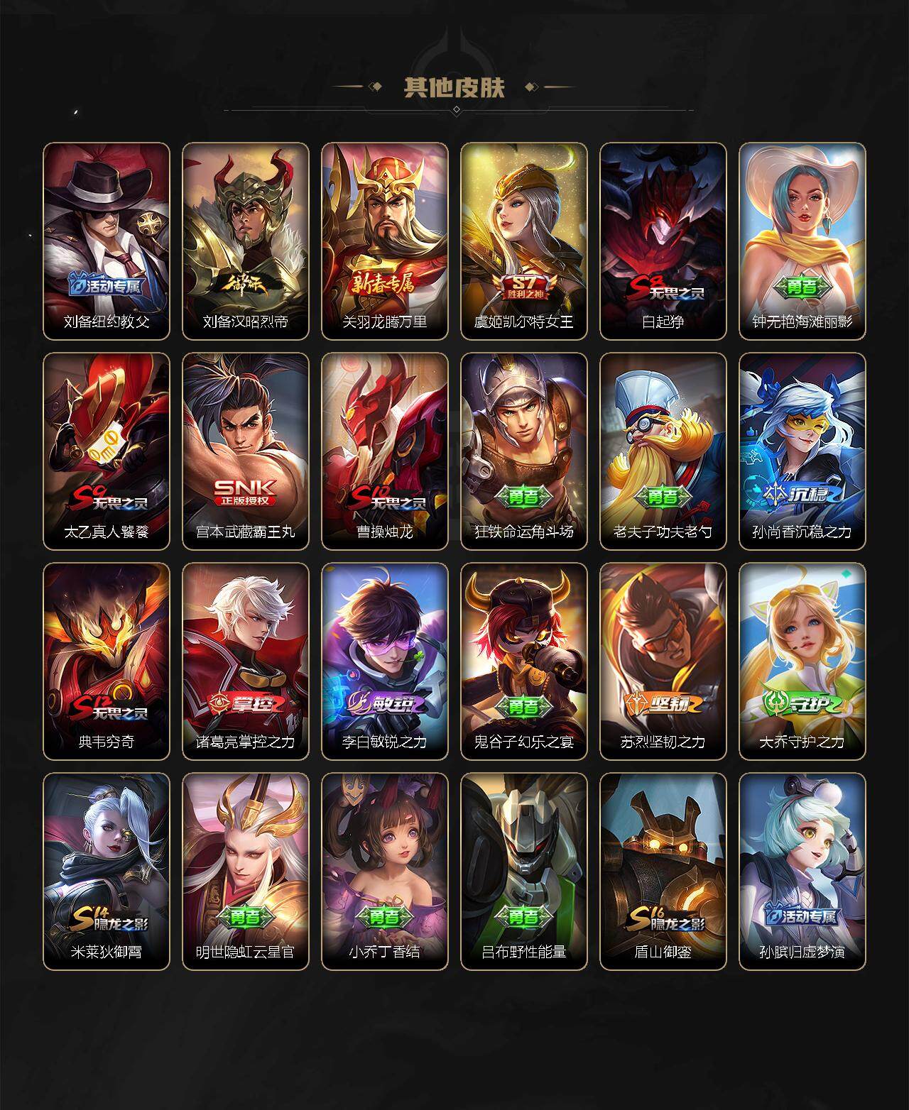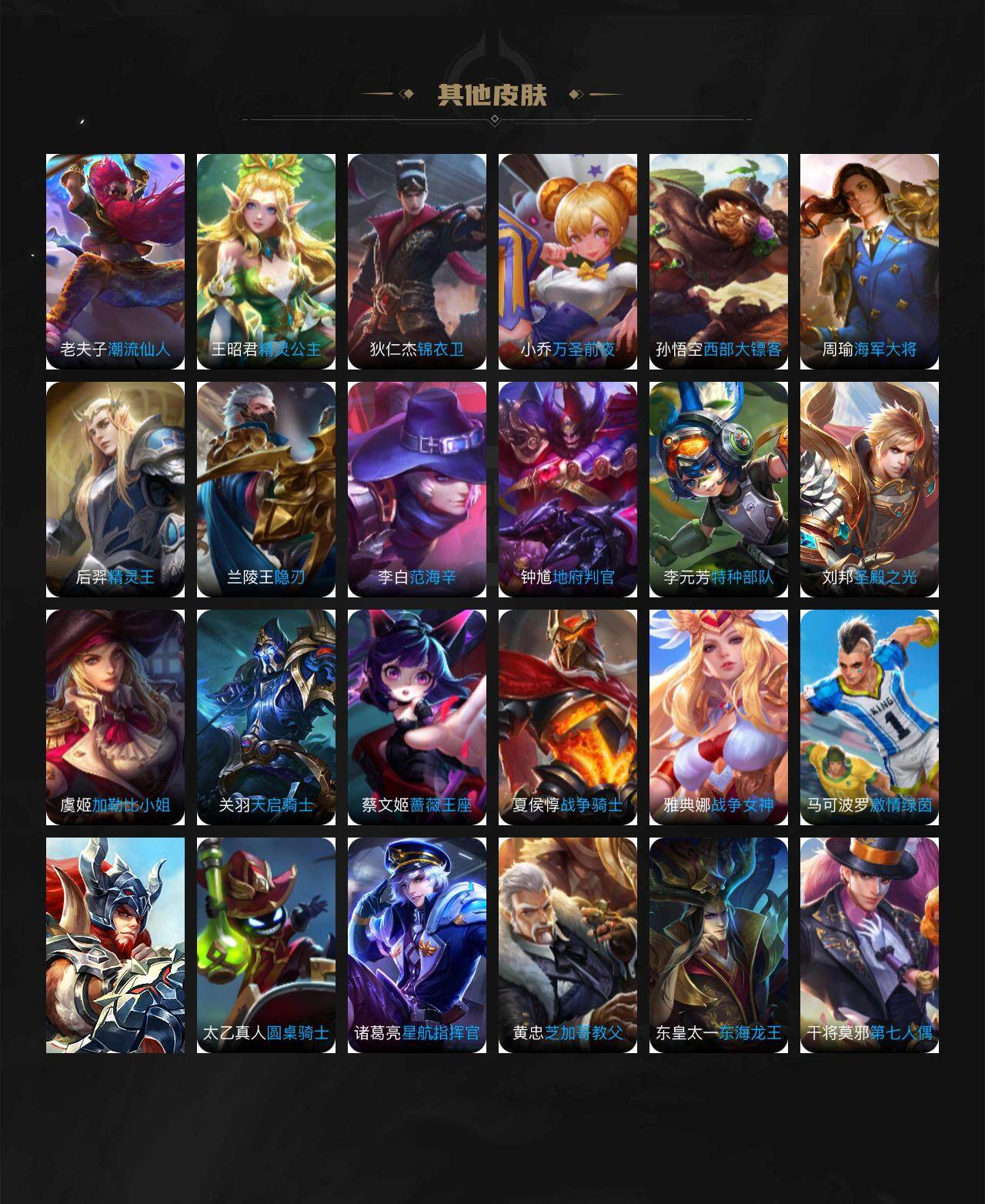 关羽冰锋战神,吕布御风骁将,赵云龙胆,黄忠烈魂,马超神威,后羿辉光之辰,典韦岱宗,韩信飞衡,花木兰瑞麟志,百里守约朱雀志,花木兰默契交锋,孙悟空至尊宝,赵云引擎之心,孙悟空美猴王,猪八戒猪悟能,孙尚香异界灵契,孙悟空孙行者,韩信傲雪梅枪,橘右京枫霜尽,不知火舞绯月行,墨子降魔,李白诗剑行,马可波罗山海·玄木吟,澜愿照·九州拓,司空震愿照·山河定,女娲愿照·千秋盛