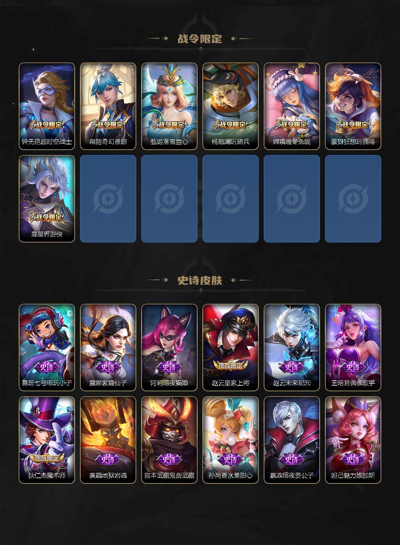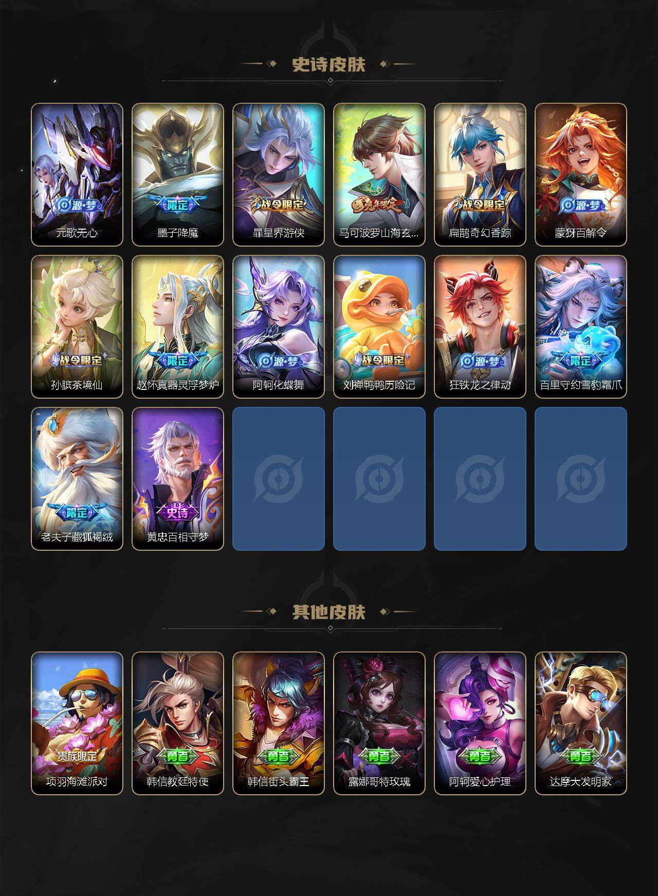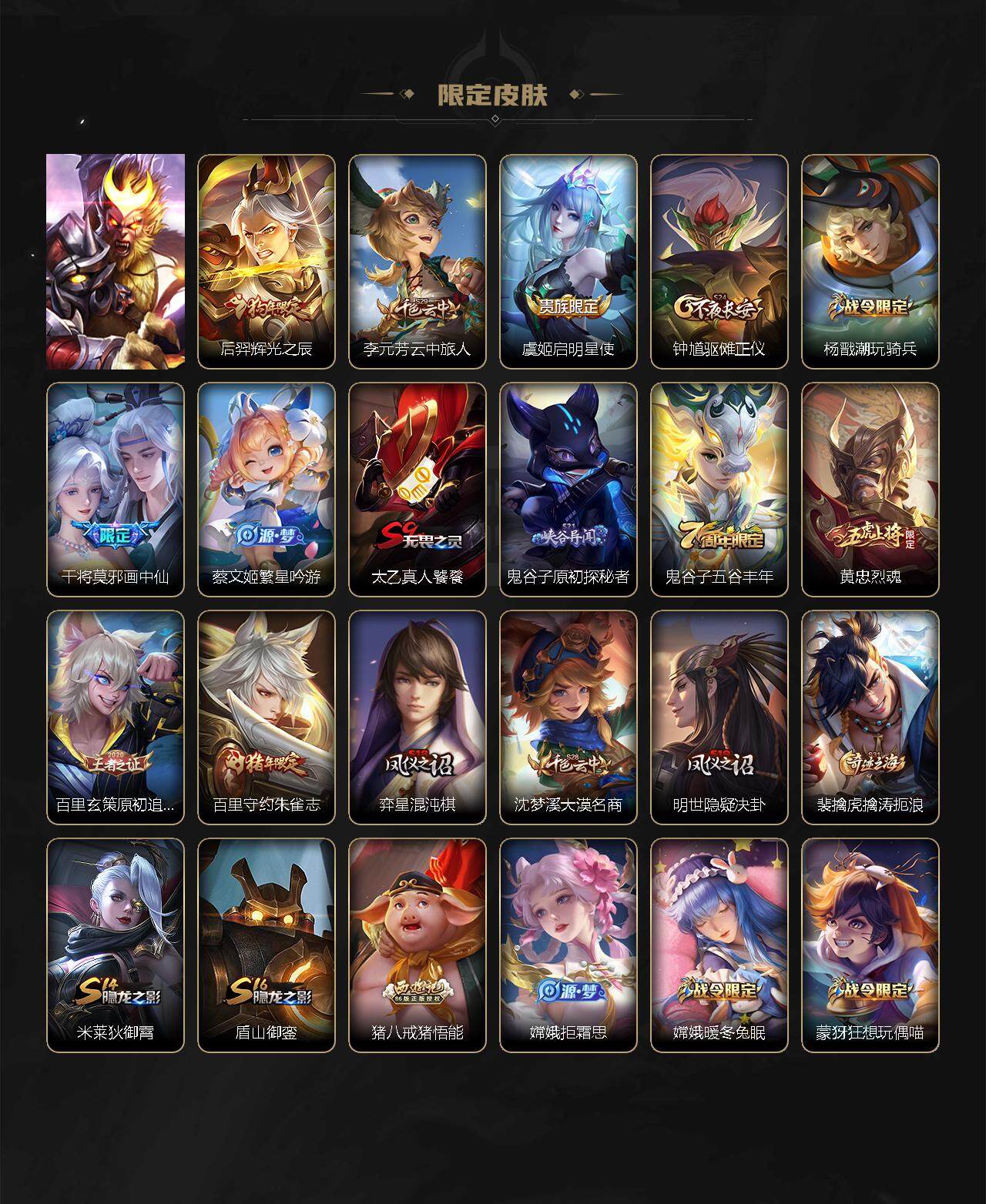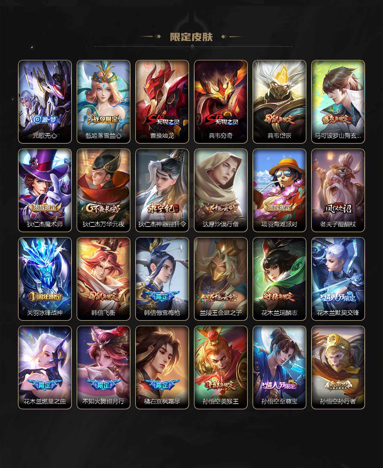 【限定皮肤】:白起狰,狄仁杰阴阳师,虞姬凯尔特女王,赵云皇家上将,赵云引擎之心,赵云龙胆,墨子降魔,孙尚香异界灵契,高渐离玩趣恶龙,钟无艳超时空战士,扁鹊奇幻香踪,吕布御风骁将,元歌无心,甄姬落雪兰心,曹操烛龙,典韦穷奇,典韦岱宗,马可波罗山海玄木吟,狄仁杰魔术师,狄仁杰万华元夜,狄仁杰神器狴犴令,达摩沙漠行僧,项羽海滩派对,老夫子醍醐杖,关羽冰锋战神,韩信飞衡,韩信傲雪梅枪,兰陵王金庭之子,花木兰瑞麟志,花木兰默契交锋,花木兰燃星之曲,不知火舞绯月行,橘右京枫霜尽,孙悟空美猴王,孙悟空至尊宝,孙悟空孙行者,孙悟空齐天大圣,后羿辉光之辰,李元芳云中旅人,虞姬启明星使,钟馗驱傩正仪,杨戬潮玩骑兵,干将莫邪画中仙,蔡文姬繁星吟游,太乙真人饕餮,鬼谷子原初探秘者,鬼谷子五谷丰年,黄忠烈魂,百里玄策原初追逐者,百里守约朱雀志,弈星混沌棋,沈梦溪大漠名商,明世隐疑决卦,裴擒虎擒涛扼浪,米莱狄御霄,盾山御銮,猪八戒猪悟能,嫦娥拒霜思,嫦娥暖冬兔眠,蒙犽狂想玩偶喵,鲁班大师探海日志,桑启海盐诗旅,暃星界游侠,张良古海寻踪,蒙犽百解令,鬼谷子天穹祈灯,李白碎月剑心,马超琥珀纪元,刘邦剑破天穹