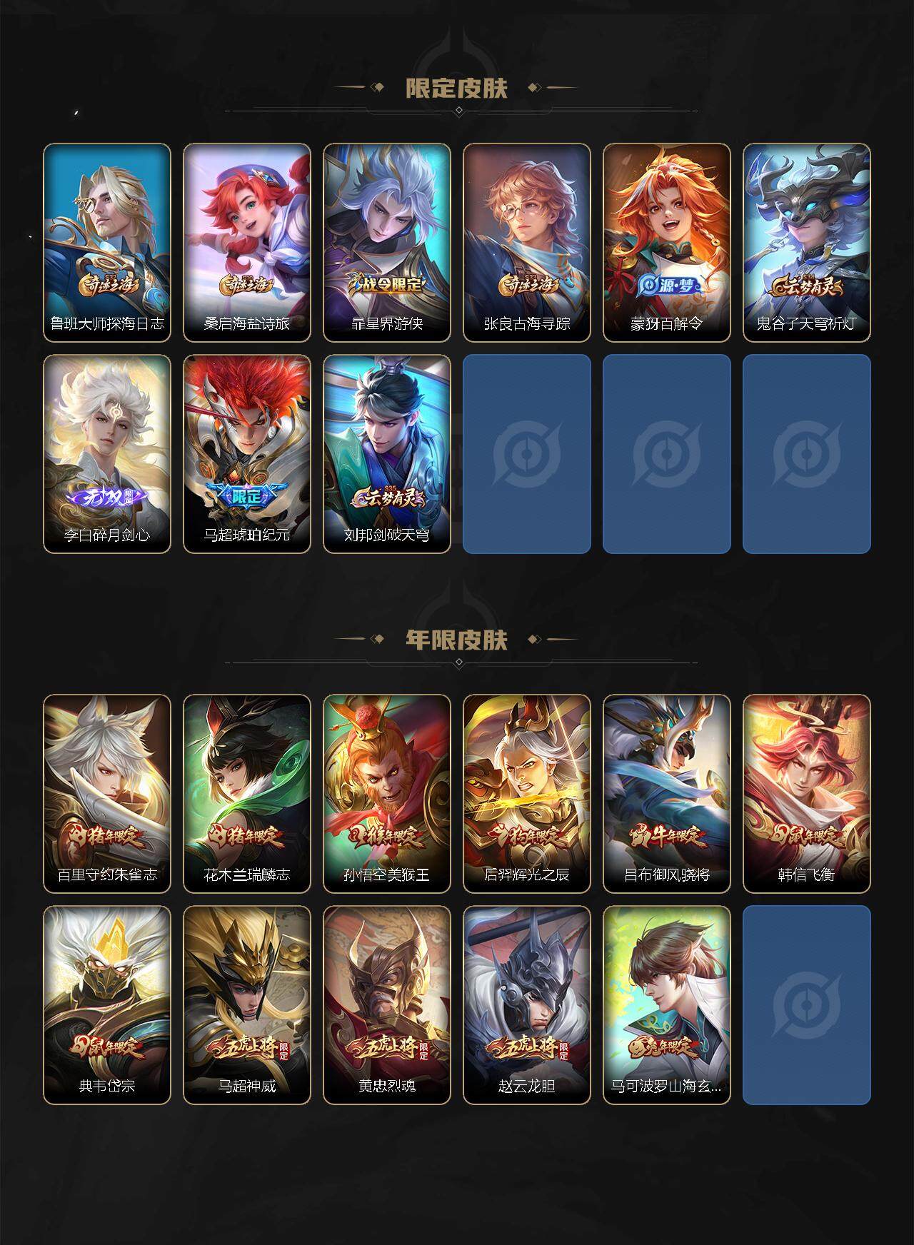 【年限皮肤】:百里守约朱雀志,花木兰瑞麟志,孙悟空美猴王,后羿辉光之辰,吕布御风骁将,韩信飞衡,典韦岱宗,马超神威,黄忠烈魂,赵云龙胆,马可波罗山海玄木吟