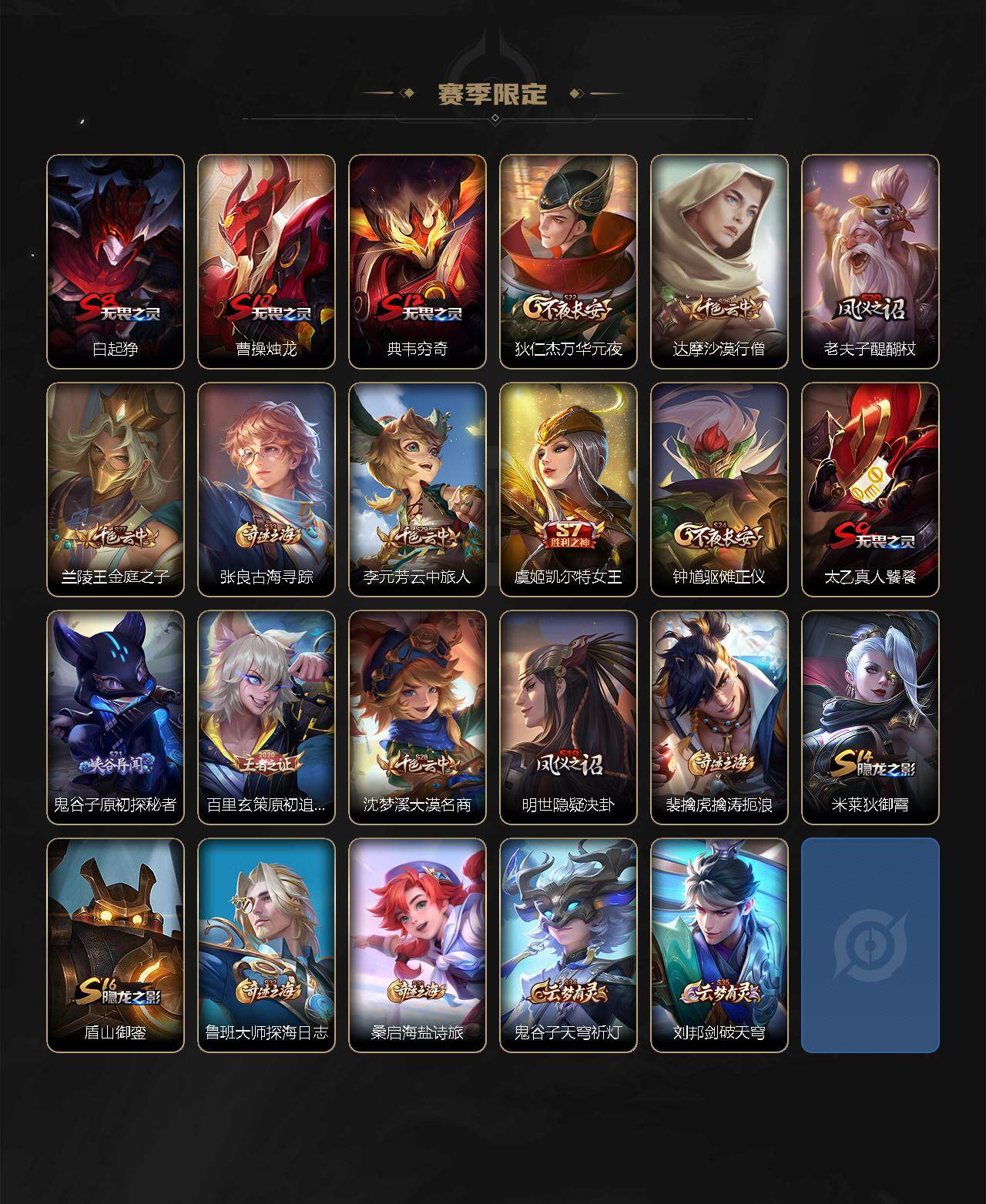 【赛季限定】:白起狰,曹操烛龙,典韦穷奇,狄仁杰万华元夜,达摩沙漠行僧,老夫子醍醐