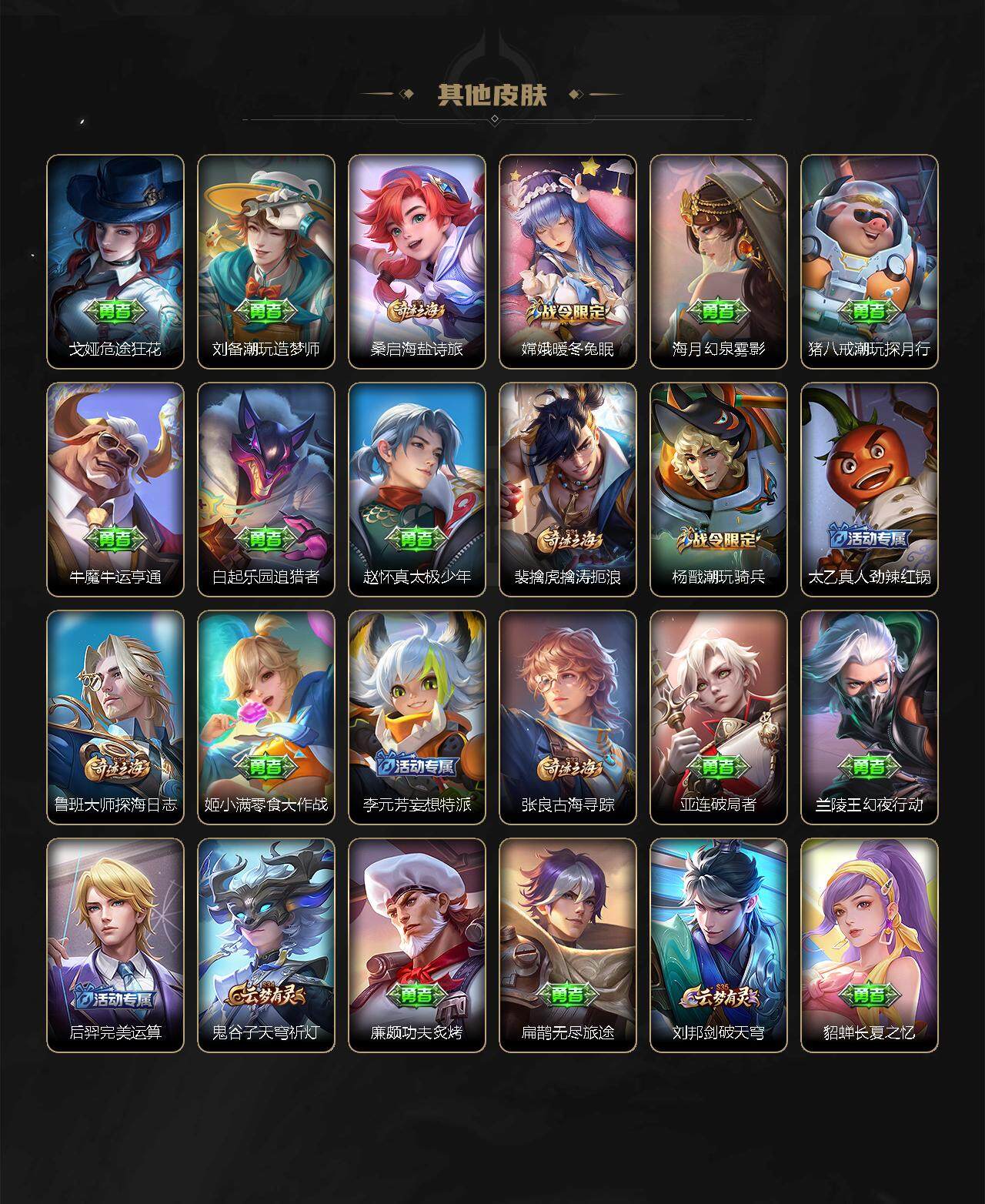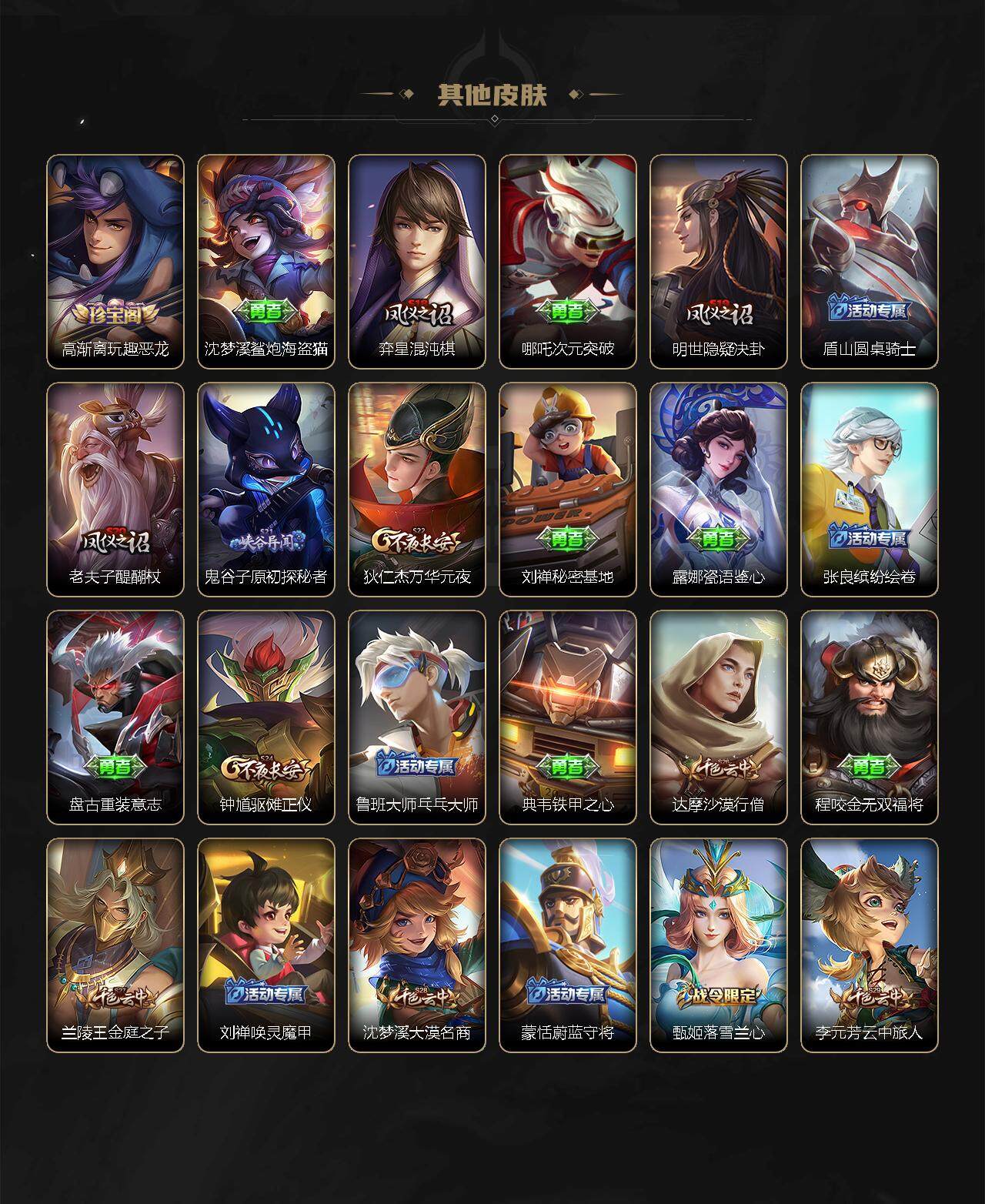 虞姬凯尔特女王,白起狰,太乙真人饕餮,曹操烛龙,典韦穷奇,米莱狄御霄,盾山御銮,明世隐疑决卦,老夫子醍醐杖,鬼谷子原初探秘者,狄仁杰万华元夜,钟馗驱傩正仪,蒙犽狂想玩偶喵,弈星混沌棋,达摩沙漠行僧,兰陵王金庭之子,沈梦溪大漠名商,李元芳云中旅人,桑启海盐诗旅,裴擒虎擒涛扼浪,鲁班大师探海日志,张良古海寻踪