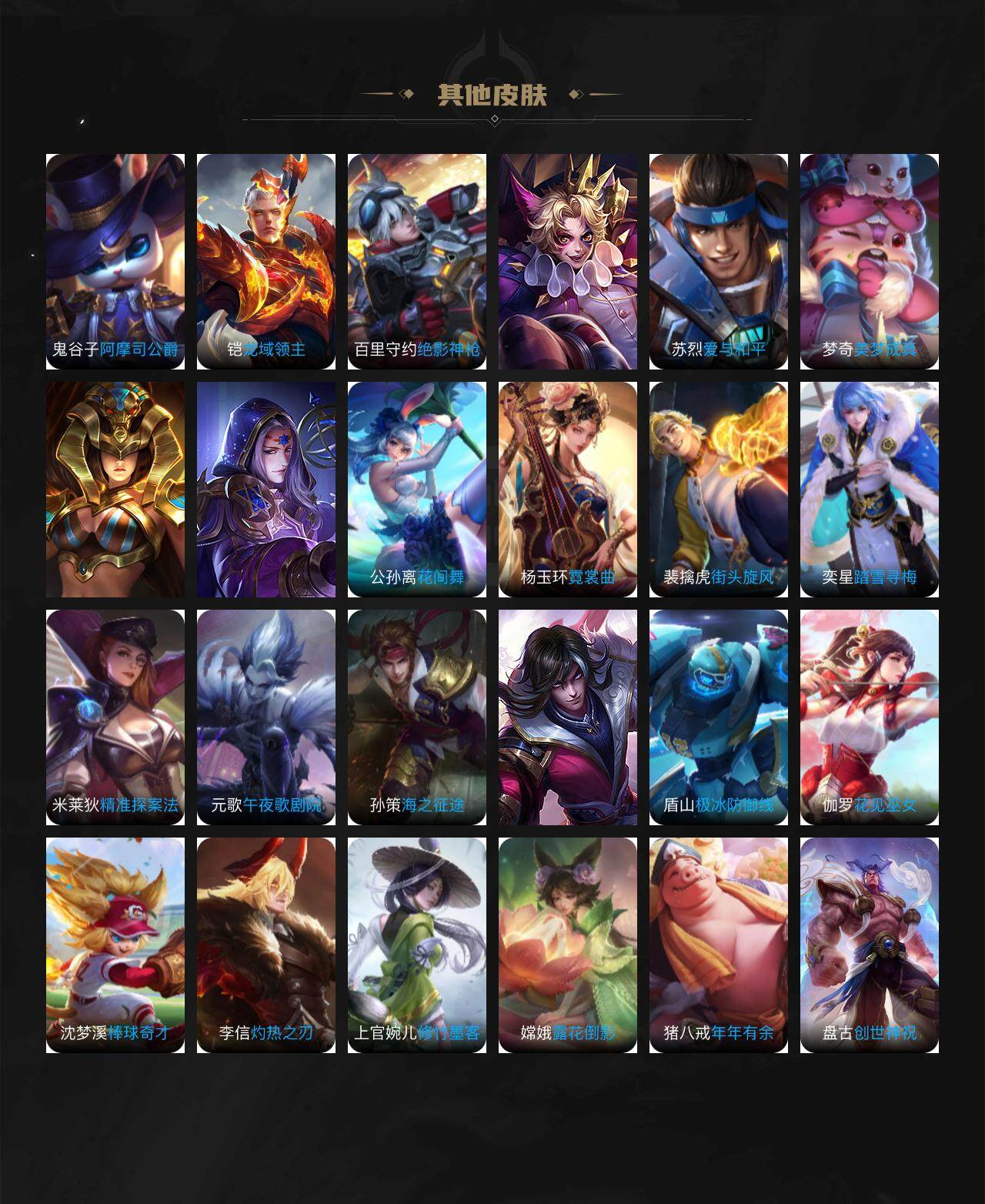 大乔白蛇,孙策猫狗日记,阿轲节奏热浪,露娜紫霞仙子,诸葛亮黄金分割率,王昭君偶像歌手,韩信白龙吟,阿轲暗夜猫娘,吕布末日机甲,鲁班七号电玩小子,橘右京修罗,墨子龙骑士,刘禅天才门将,白起星夜王子,安琪拉时之奇旅,程咬金功夫厨神,刘邦德古拉伯爵,兰陵王暗隐猎兽者,曹操幽灵船长,宫本武藏鬼剑武藏,亚瑟心灵战警,蔡文姬舞动绿茵,廉颇地狱岩魂,小乔缤纷独角兽,夏侯惇乘风破浪,花木兰水晶猎龙者,铠曙光守护者,墨子金属风暴,百里玄策原初追逐者,吕布圣诞狂欢,百里守约特工魅影,嬴政暗夜贵公子,嫦娥拒霜思,貂蝉唤灵魅影,蒙犽百解令,赵怀真器灵·浮梦炉