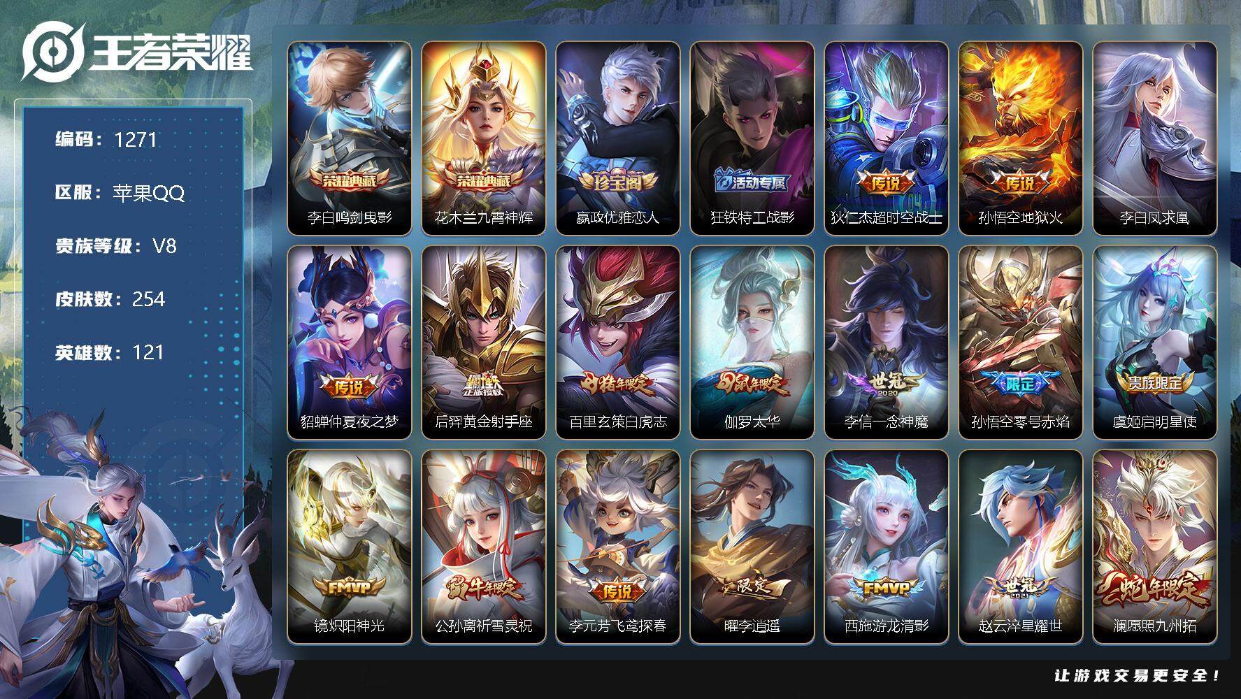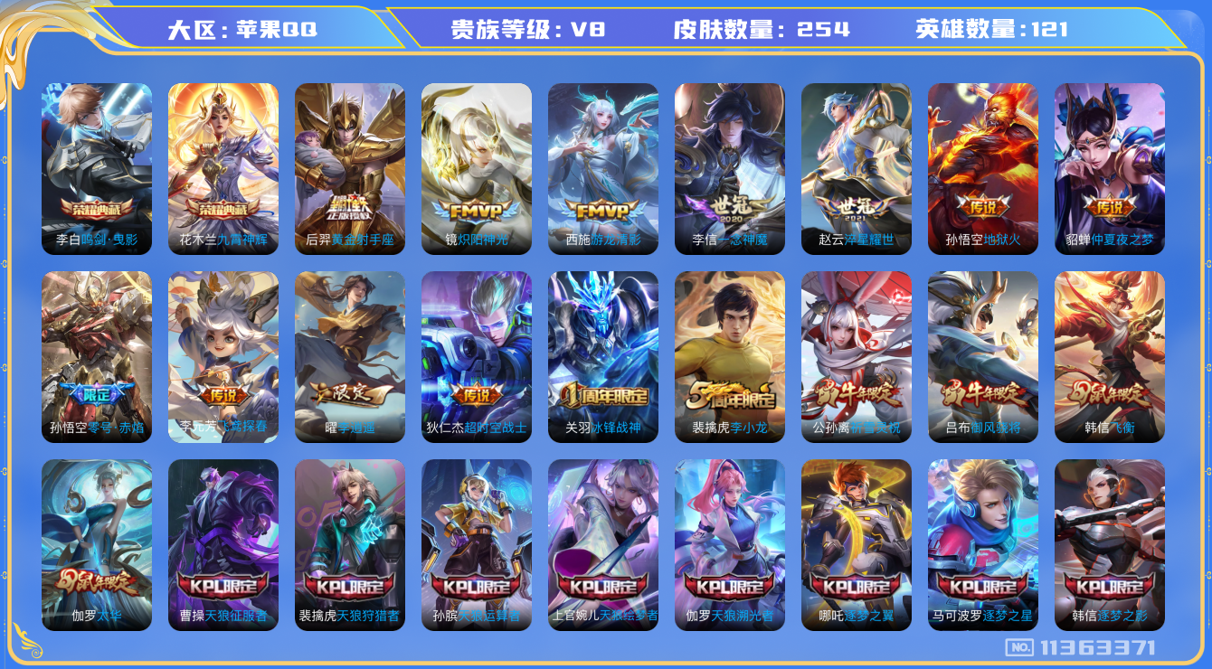 [11363371]【商品标题】:苹果Q-V5-永恒钻石IV段位-121英雄-254皮肤-2典藏-0珍品无双-0无双-0珍品传说-17传说-77史诗