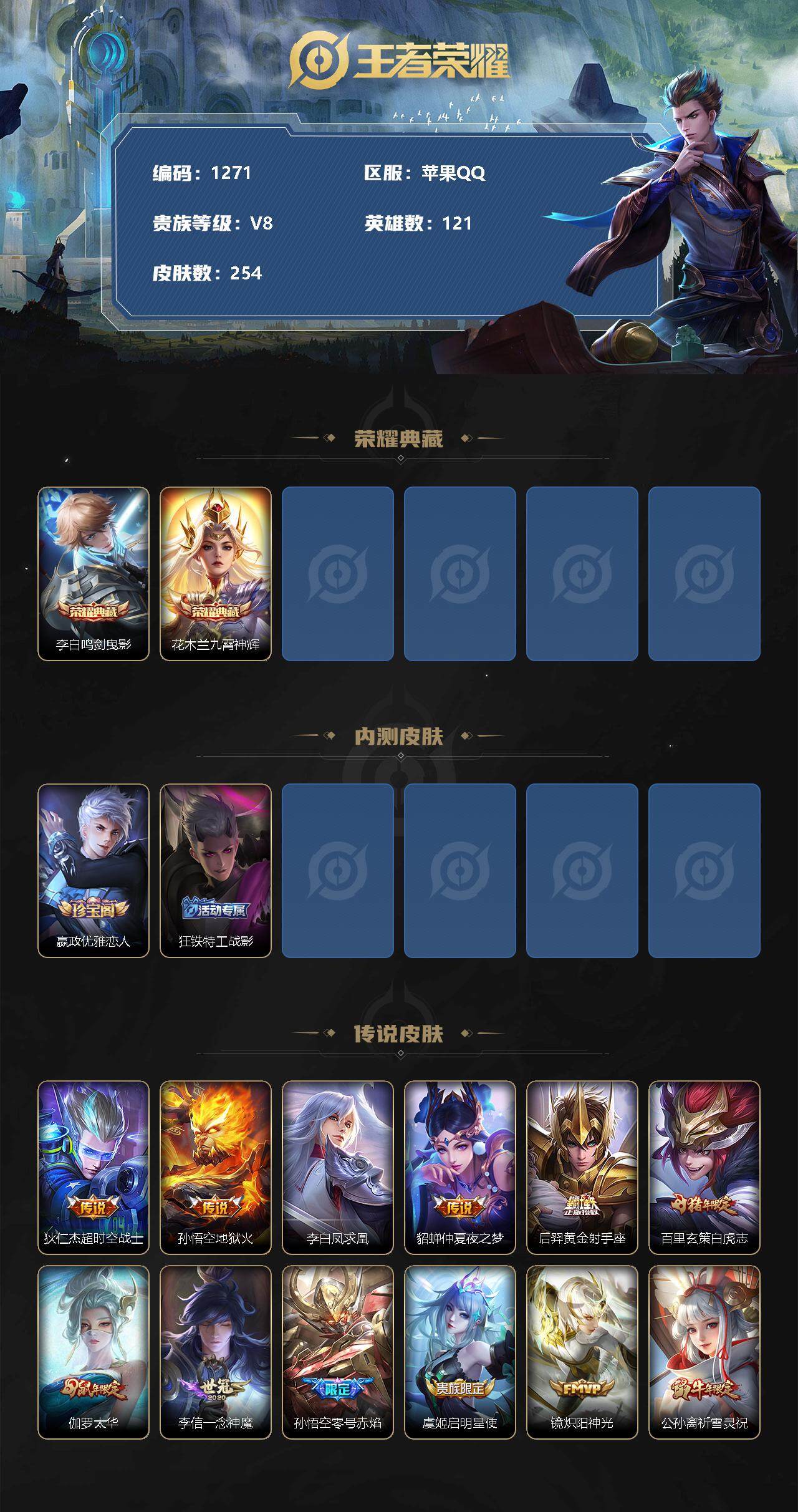 - [12175629]V7 1典藏 1珍品传说 13传说 122英雄 262皮肤 可修改实名 优质装备:全息碎影(猴子典藏),怪盗基德,黄金射手座,炽阳神光,云霓雀翎,地狱火,地狱之眼,游龙清影(小青龙),淬星耀世,琥珀纪元铠 传说皮:乘龙·铭钟鼎(赵云年限),幻光神枪 珍宝阁皮:妄想食味,胡桃夹子 限定皮:愿照·九州拓(澜年限),愿照·山河定(司空震年限),逐霄战戟,鸣野蒿,傲雪梅枪,五谷丰年,李小龙,孙行者,大圣娶亲 史诗皮:鸭鸭历险记-刘禅,化蝶舞,龙之律动,茶境仙,破空之剑,东方月初,蒙犽顽岩魄,蔬乡物语(鲁班七号),乘龙·聚宝船(安琪拉年限),乘龙·忆丹青(大乔年限),紫霞仙子,特工魅影,永昼,江河有灵,魅语,百解令(蒙犽),高渐离燃音魔法,无限星赏官,冰冠公主,青蛇,偶像歌手,末日机甲-吕布,猫狗日记-孙策,猫狗日记-大乔,女仆咖啡,摇滚巨星,水果甜心,天才门将,功夫厨神,幽灵船长,鬼剑武藏,心灵战警,地狱岩魂,纤云弄巧,拒霜思,乘风破浪,逐浪之夏,水晶猎龙者,曙光守护者,原初追逐者,圣诞恋歌,鹰眼统帅,魅力维加斯,赏金猎手,未来纪元-赵云