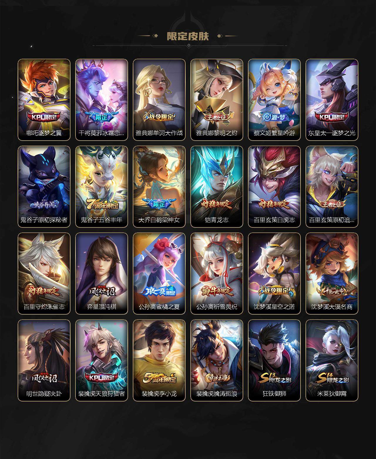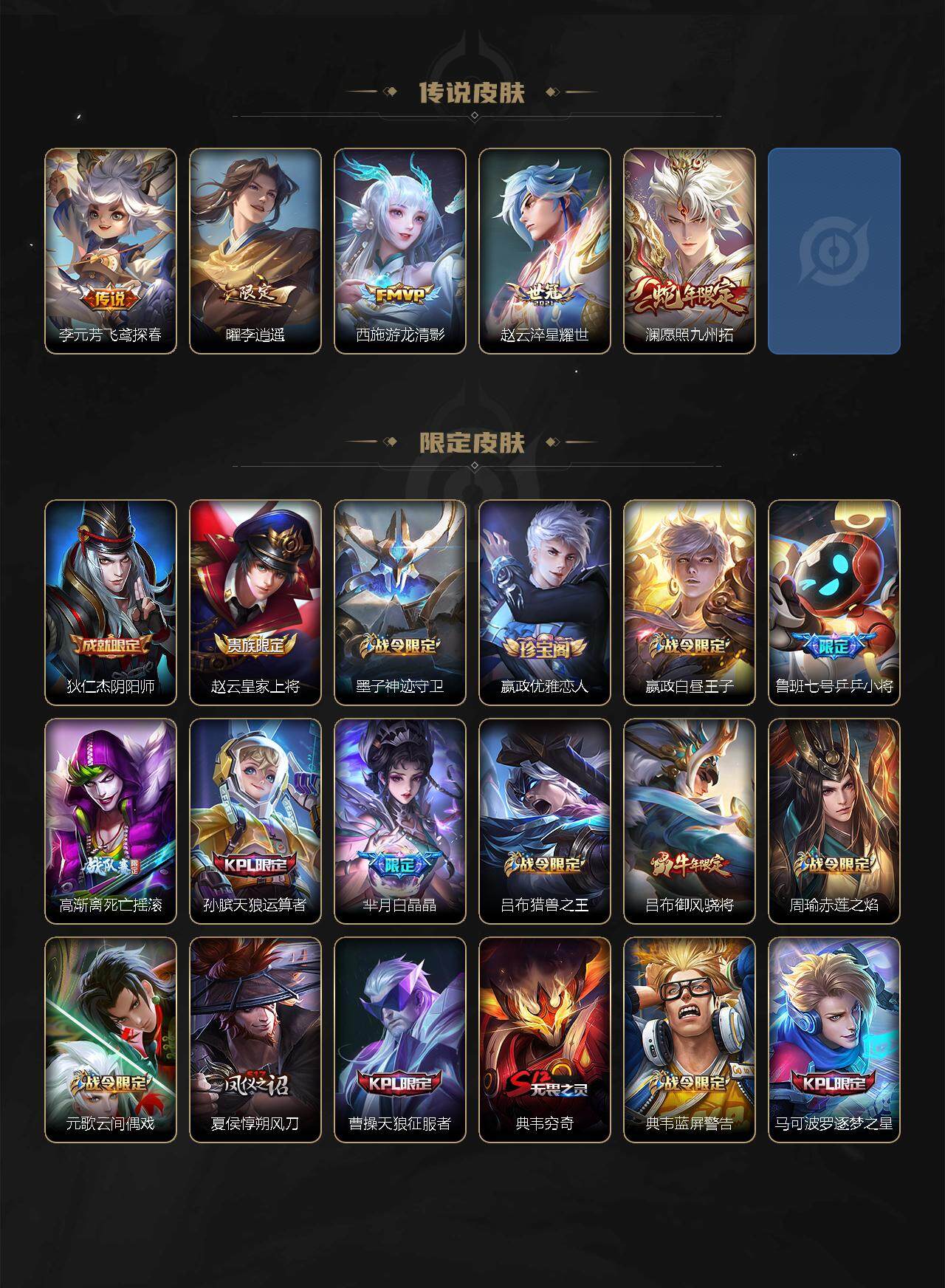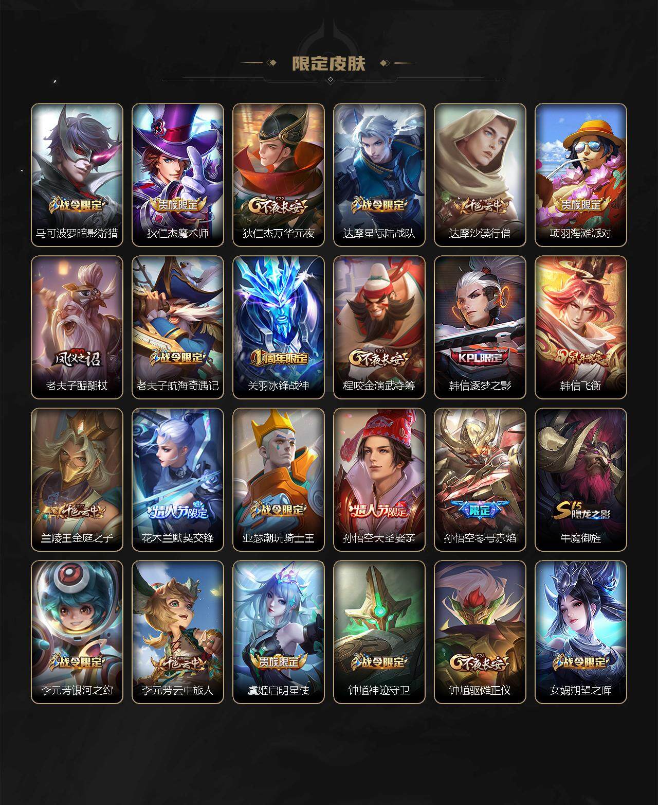 【限定皮肤】:狄仁杰阴阳师,赵云皇家上将,墨子神迹守卫,嬴政优雅恋人,嬴政白昼王子,鲁班七号乒乒小将,高渐离死亡摇滚,孙膑天狼运算者,芈月白晶晶,吕布猎兽之王,吕布御风骁将,周瑜赤莲之焰,元歌云间偶戏,夏侯惇朔风刀,曹操天狼征服者,典韦穷奇,典韦蓝屏警告,马可波罗逐梦之星,马可波罗暗影游猎,狄仁杰魔术师,狄仁杰万华元夜,达摩星际陆战队,达摩沙漠行僧,项羽海滩派对,老夫子醍醐杖,老夫子航海奇遇记,关羽冰锋战神,程咬金演武夺筹,韩信逐梦之影,韩信飞衡,兰陵王金庭之子,花木兰默契交锋,亚瑟潮玩骑士王,孙悟空大圣娶亲,孙悟空零号赤焰,牛魔御旌,李元芳银河之约,李元芳云中旅人,虞姬启明星使,钟馗神迹守卫,钟馗驱傩正仪,女娲朔望之晖,哪吒逐梦之翼,干将莫邪冰霜恋舞曲,雅典娜单词大作战,雅典娜黎明之约,蔡文姬繁星吟游,东皇太一逐梦之光,鬼谷子原初探秘者,鬼谷子五谷丰年,大乔白鹤梁神女,铠青龙志,百里玄策白虎志,百里玄策原初追逐者,百里守约朱雀志,弈星混沌棋,公孙离蜜橘之夏,公孙离祈雪灵祝,沈梦溪星空之诺,沈梦溪大漠名商,明世隐疑决卦,裴擒虎天狼狩猎者,裴擒虎李小龙,裴擒虎擒涛扼浪,狂铁御狮,米莱狄御霄,米莱狄胡桃异想国,云中君纤云弄巧,伽罗太华,伽罗天狼溯光者,盾山御銮,猪八戒西部大镖客,上官婉儿天狼绘梦者,曜李逍遥 ,蒙犽狂想玩偶喵,鲁班大师探海日志,桑启海盐诗旅,阿古朵江河有灵,张良古海寻踪