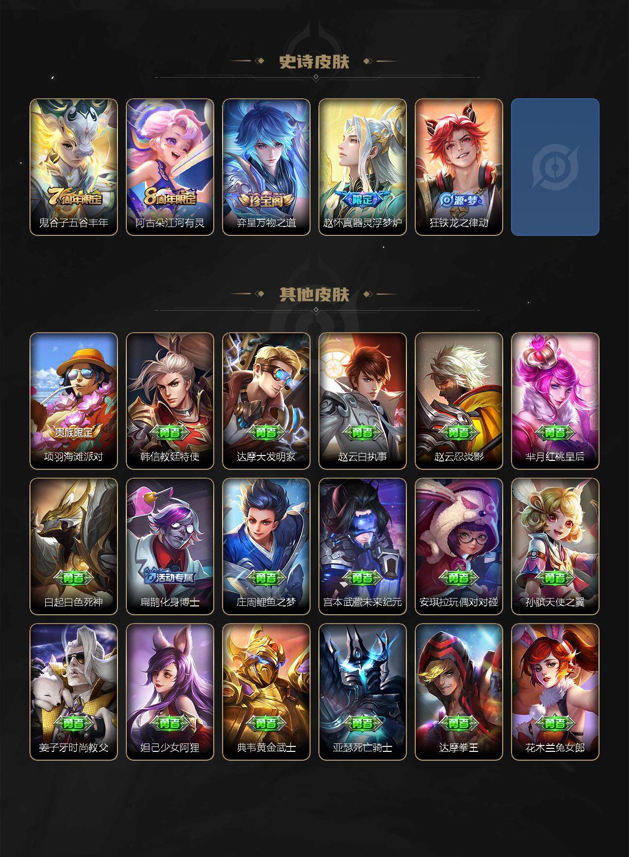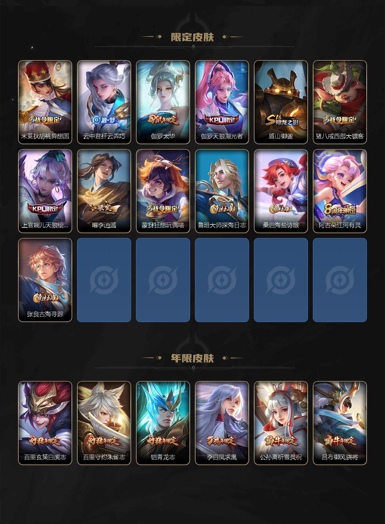 【年限皮肤】:百里玄策白虎志,百里守约朱雀志,铠青龙志,李白凤求凰,公孙离祈雪灵祝,吕布御风骁将,伽罗太华,韩信飞衡
