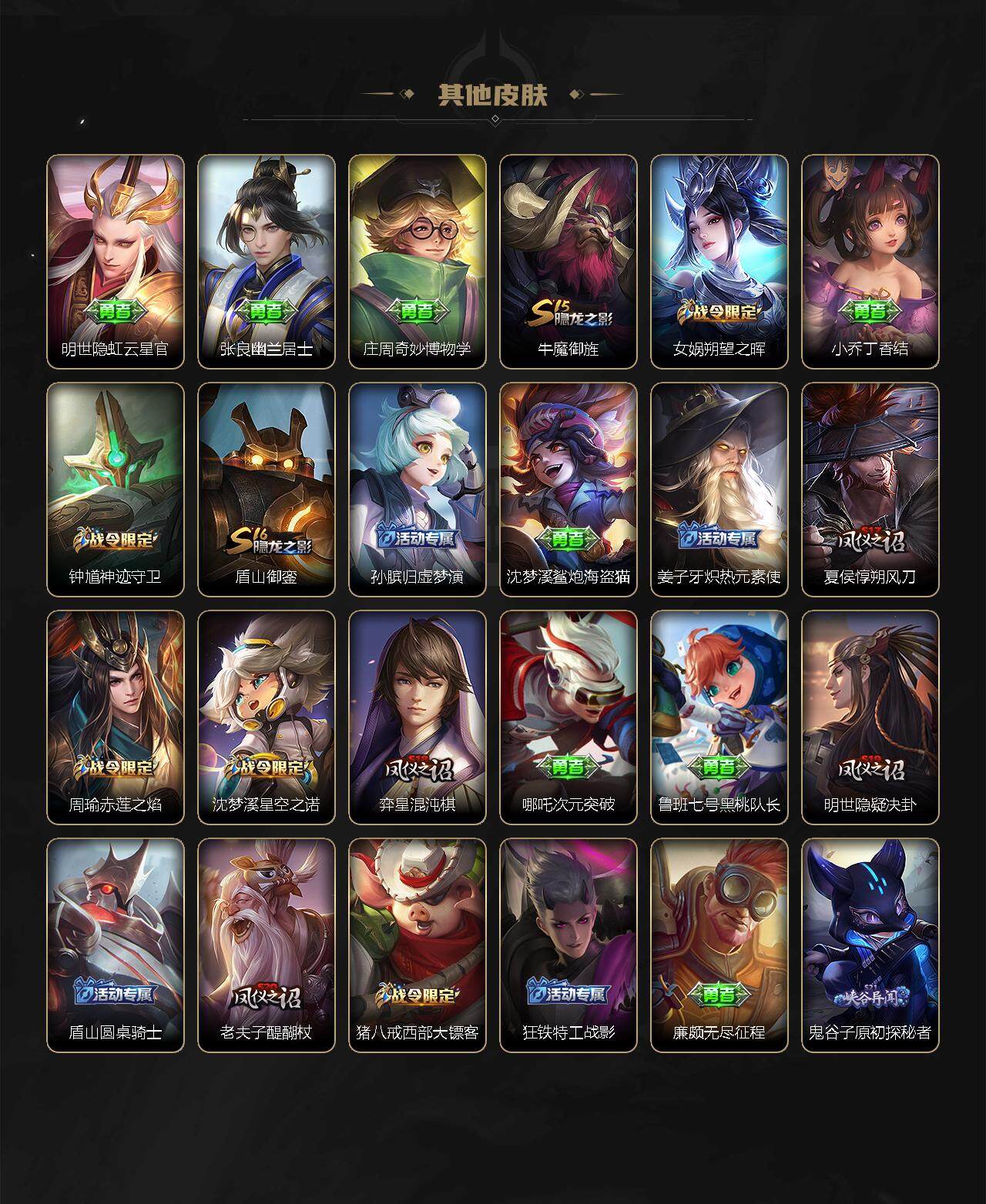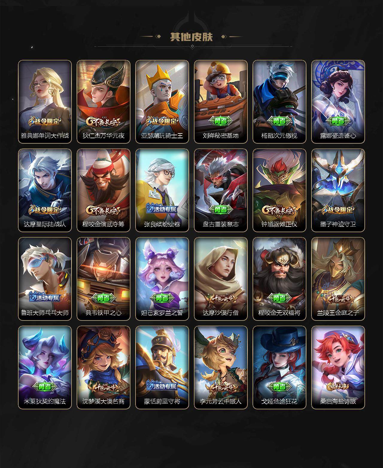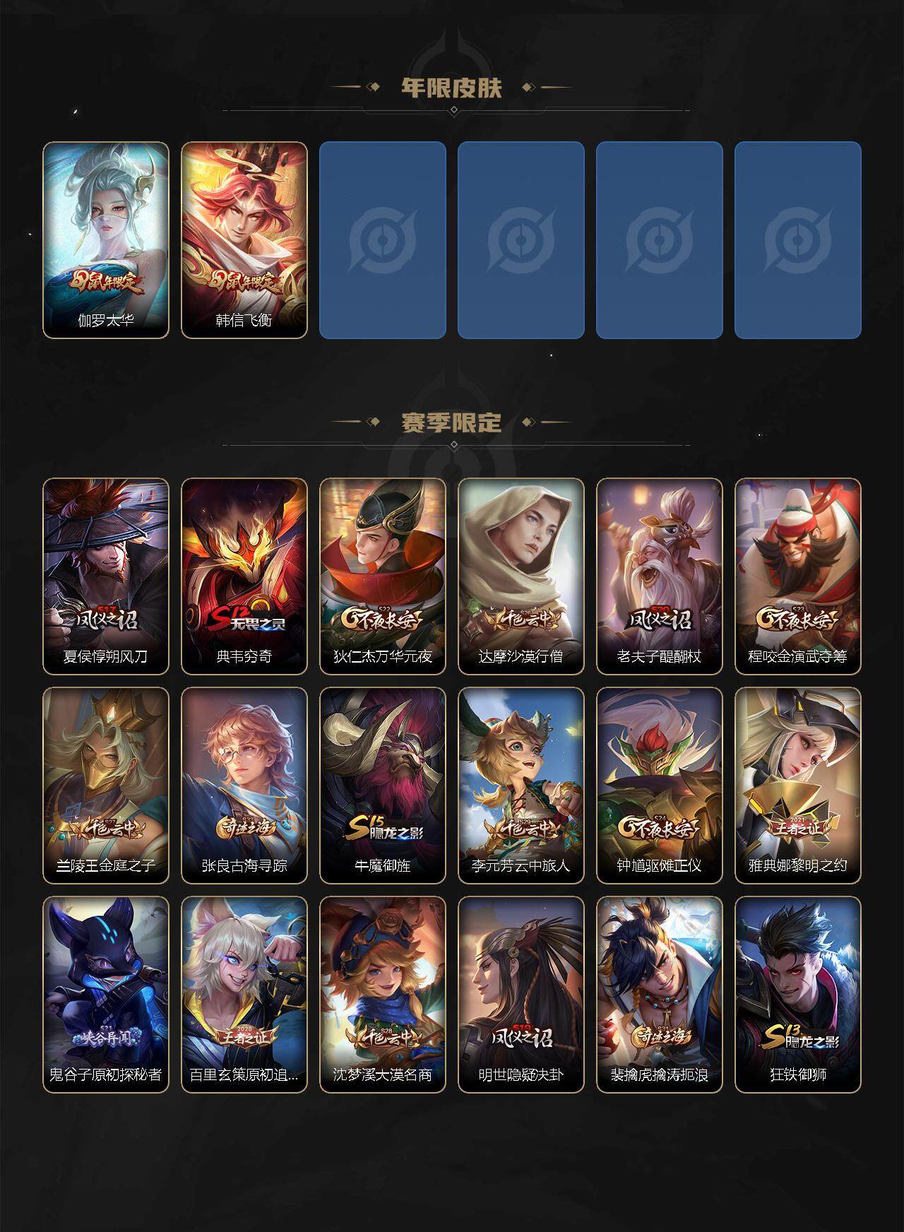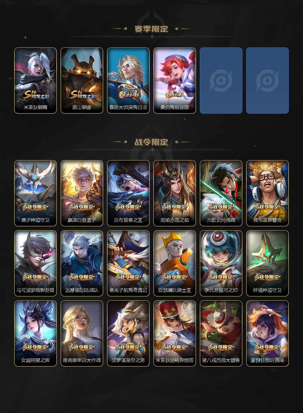 【赛季限定】:夏侯惇朔风刀,典韦穷奇,狄仁杰万华元夜,达摩沙漠行僧,老夫子醍醐杖,程咬金演武夺筹,兰陵王金庭之子,张良古海寻踪,牛魔御旌,李元芳云中旅人,钟馗驱傩正仪,雅典娜黎明之约,鬼谷子原初探秘者,百里玄策原初追逐者,弈星混沌棋,沈梦溪大漠名
