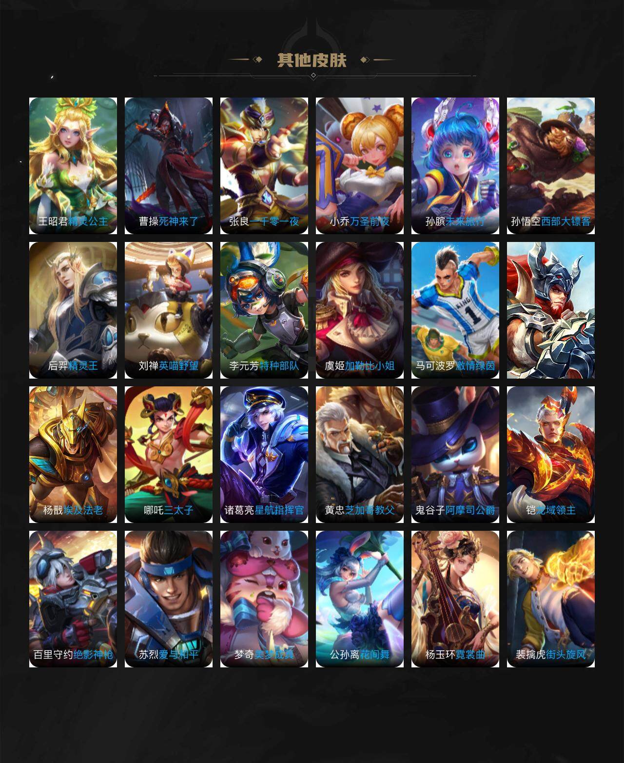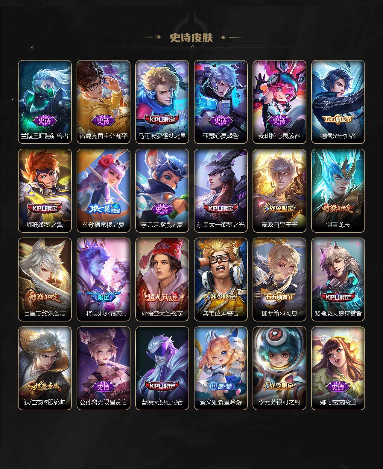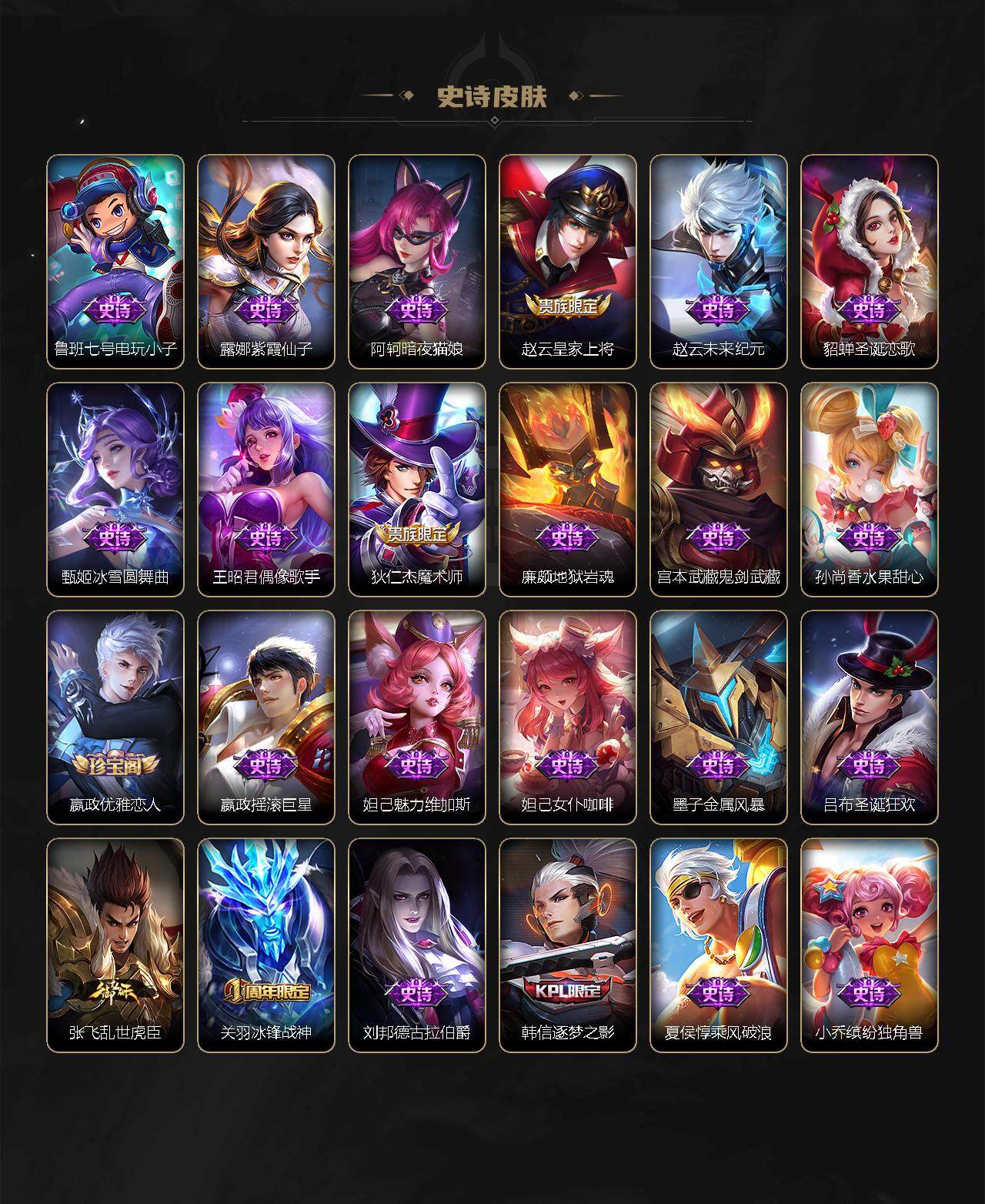 娜可露露晚萤,伽罗箭羽风息,李元芳逐浪之夏,公孙离无限星赏官,露娜紫霞仙子,诸葛亮黄金分割率,王昭君偶像歌手,孙尚香时之恋人,阿轲暗夜猫娘,鲁班七号电玩小子,蒙犽龙鼓争鸣,橘右京修罗,嬴政摇滚巨星,安琪拉心灵骇客,刘邦德古拉伯爵,兰陵王暗隐猎兽者,宫本武藏鬼剑武藏,亚瑟心灵战警,杨戬天秀·启明,廉颇地狱岩魂,西施诗语江南,小乔缤纷独角兽,夏侯惇乘风破浪,铠曙光守护者,百里玄策热力回旋,墨子金属风暴,百里玄策原初追逐者,吕布圣诞狂欢,貂蝉圣诞恋歌,雅典娜黎明之约,赵怀真器灵·浮梦炉