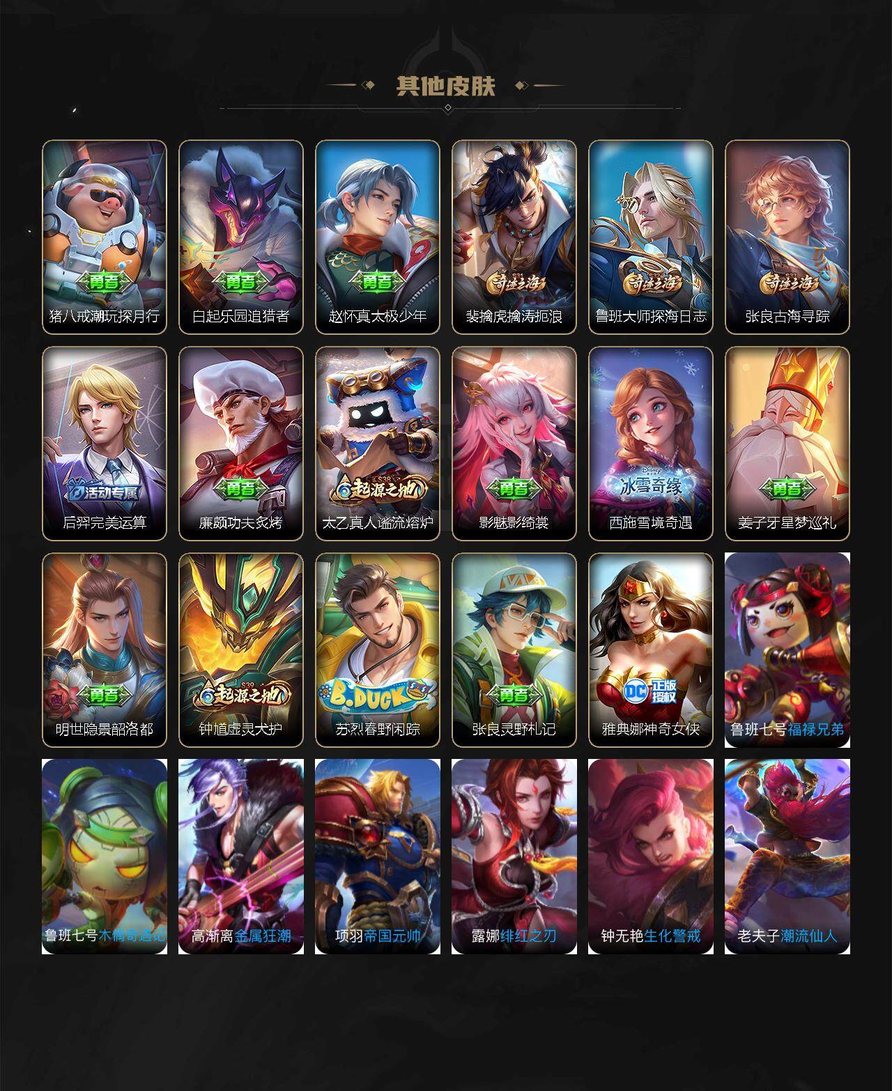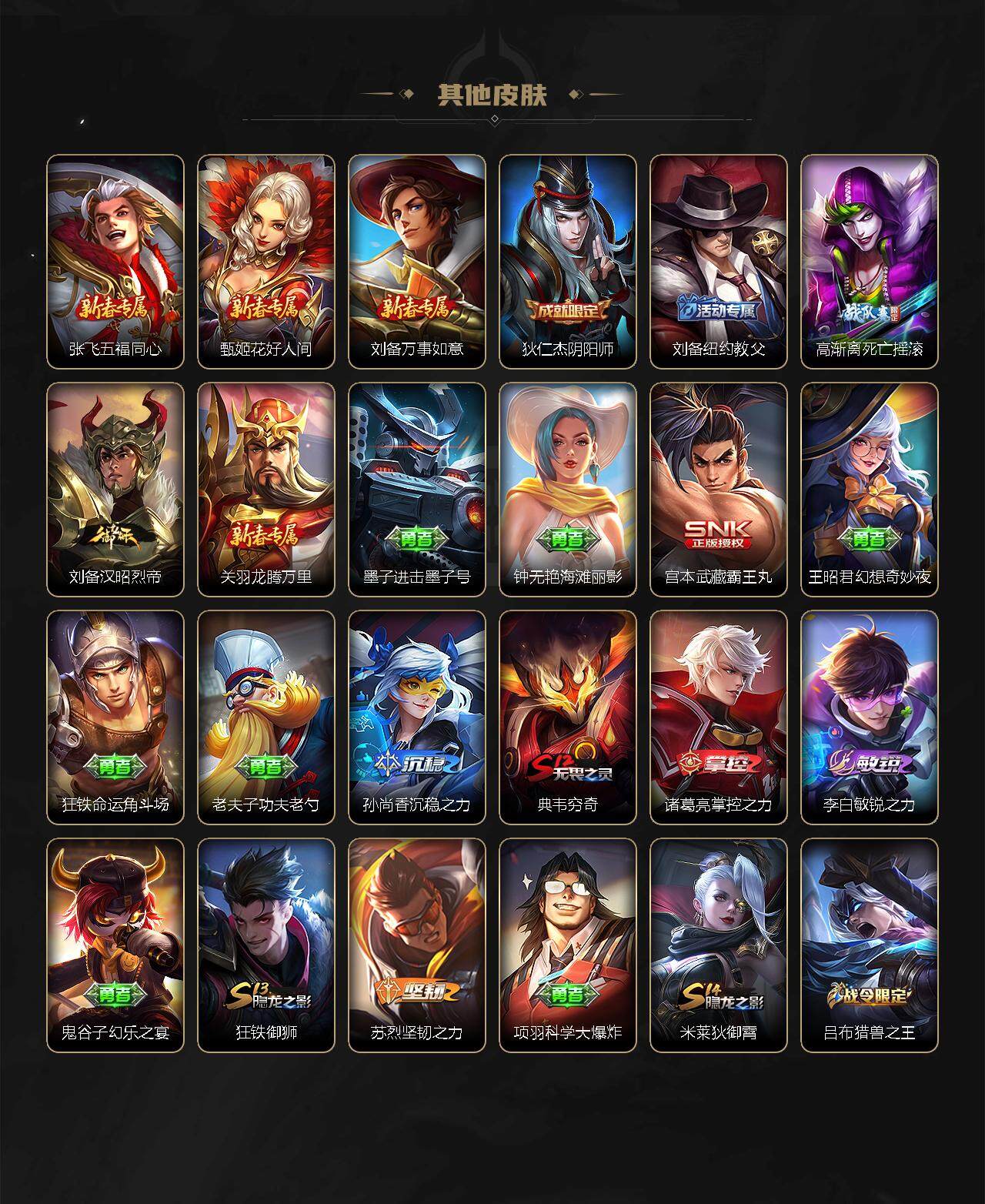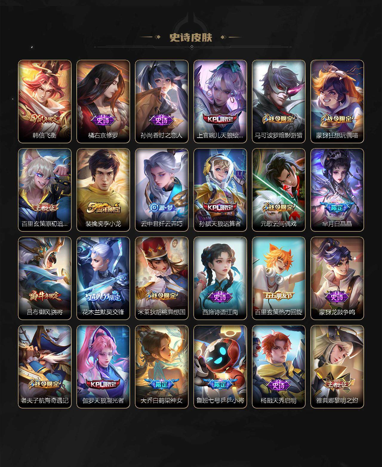 关羽冰锋战神,裴擒虎李小龙,公孙离祈雪灵祝,吕布御风骁将,韩信飞衡,伽罗太华,曹操天狼征服者,裴擒虎天狼狩猎者,孙膑天狼运算者,上官婉儿天狼绘梦者,伽罗天狼溯光者,哪吒逐梦之翼,马可波罗逐梦之星,韩信逐梦之影,东皇太一逐梦之光,铠青龙志,百里玄策白虎志,百里守约朱雀志,孙悟空大圣娶亲,花木兰默契交锋,雅典娜神奇女侠,干将莫邪冰霜恋舞曲,公孙离蜜橘之夏,芈月白晶晶,鲁班七号乒乒小将,大乔白鹤梁神女,澜愿照·九州拓