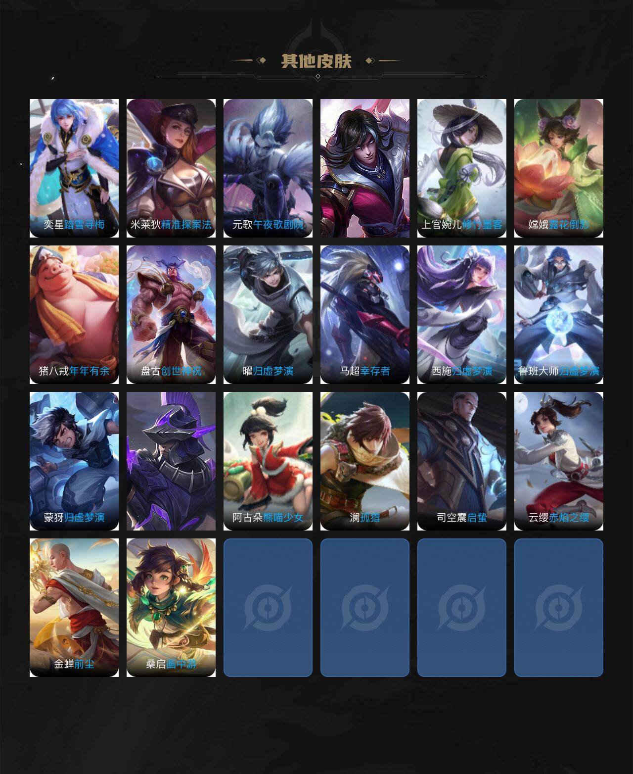 典韦穷奇,狂铁御狮,米莱狄御霄,牛魔御旌,盾山御銮,夏侯惇朔风刀,明世隐疑决卦,老夫子醍醐杖,鬼谷子原初探秘者,狄仁杰万华元夜,程咬金演武夺筹,钟馗驱傩正仪,吕布猎兽之王,嬴政白昼王子,女娲朔望之晖,典韦蓝屏警告,钟馗神迹守卫,沈梦溪星空之诺,李元芳银河之约,马可波罗暗影游猎,蒙犽狂想玩偶喵,元歌云间偶戏,弈星混沌棋,达摩沙漠行僧,兰陵王金庭之子,沈梦溪大漠名商,李元芳云中旅人,桑启海盐诗旅,裴擒虎擒涛扼浪,鲁班大师探海日志,张良古海寻踪