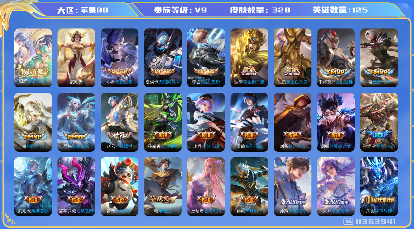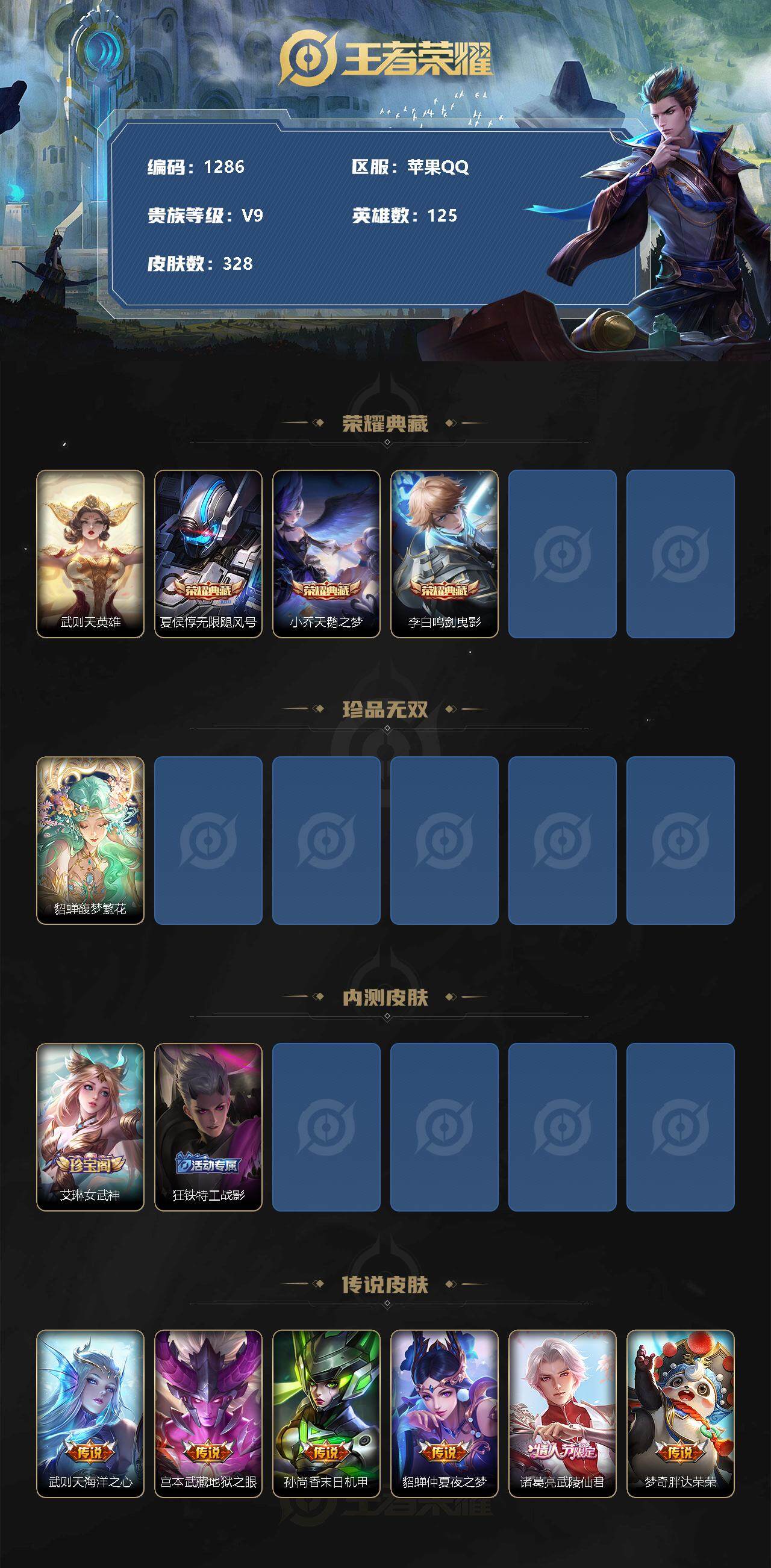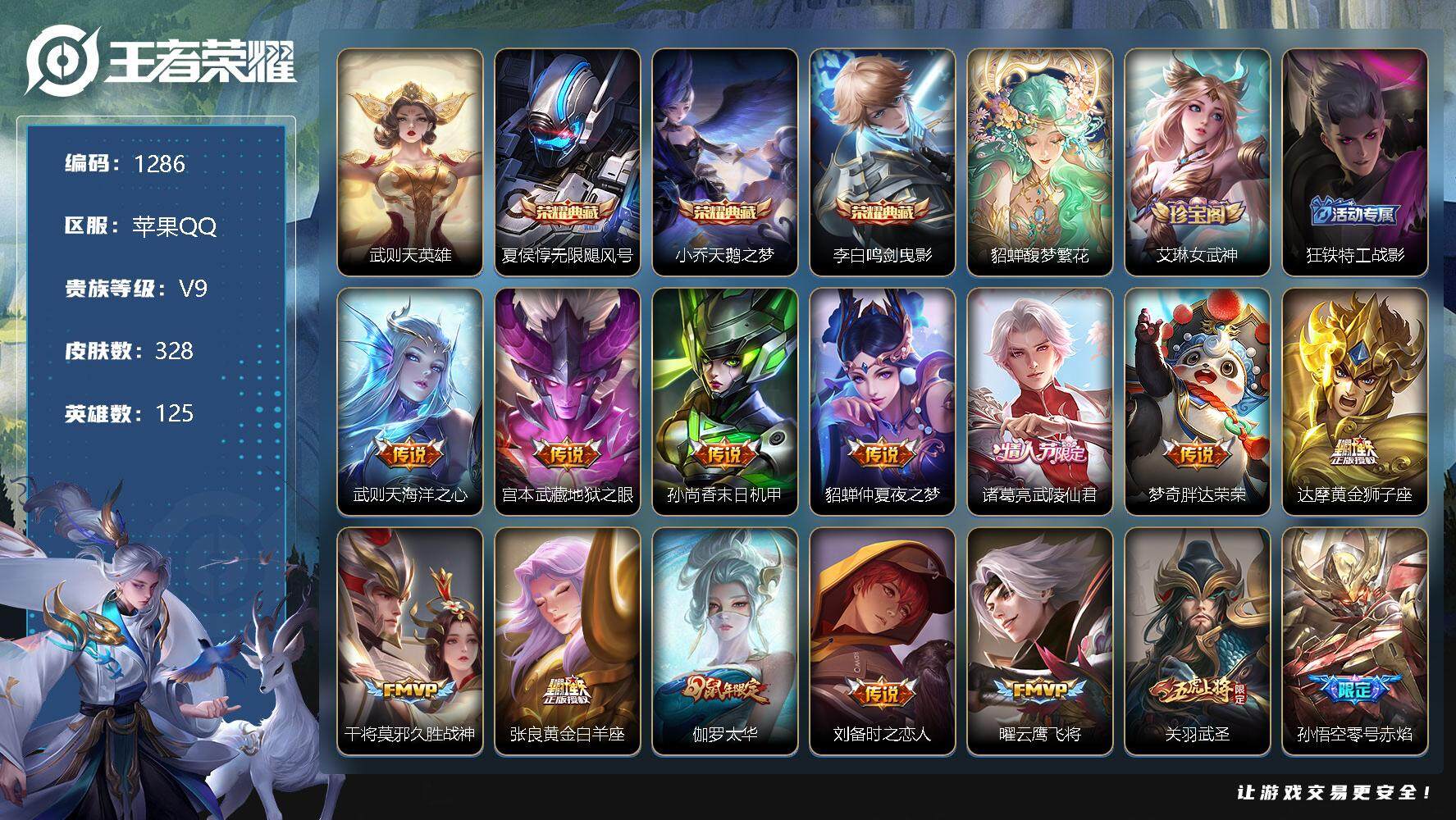 [11363941]【商品标题】:苹果Q-V9-最强王者段位-125英雄-328皮肤-3典藏-1珍品无双-0无双-0珍品传说-31传说-99史诗