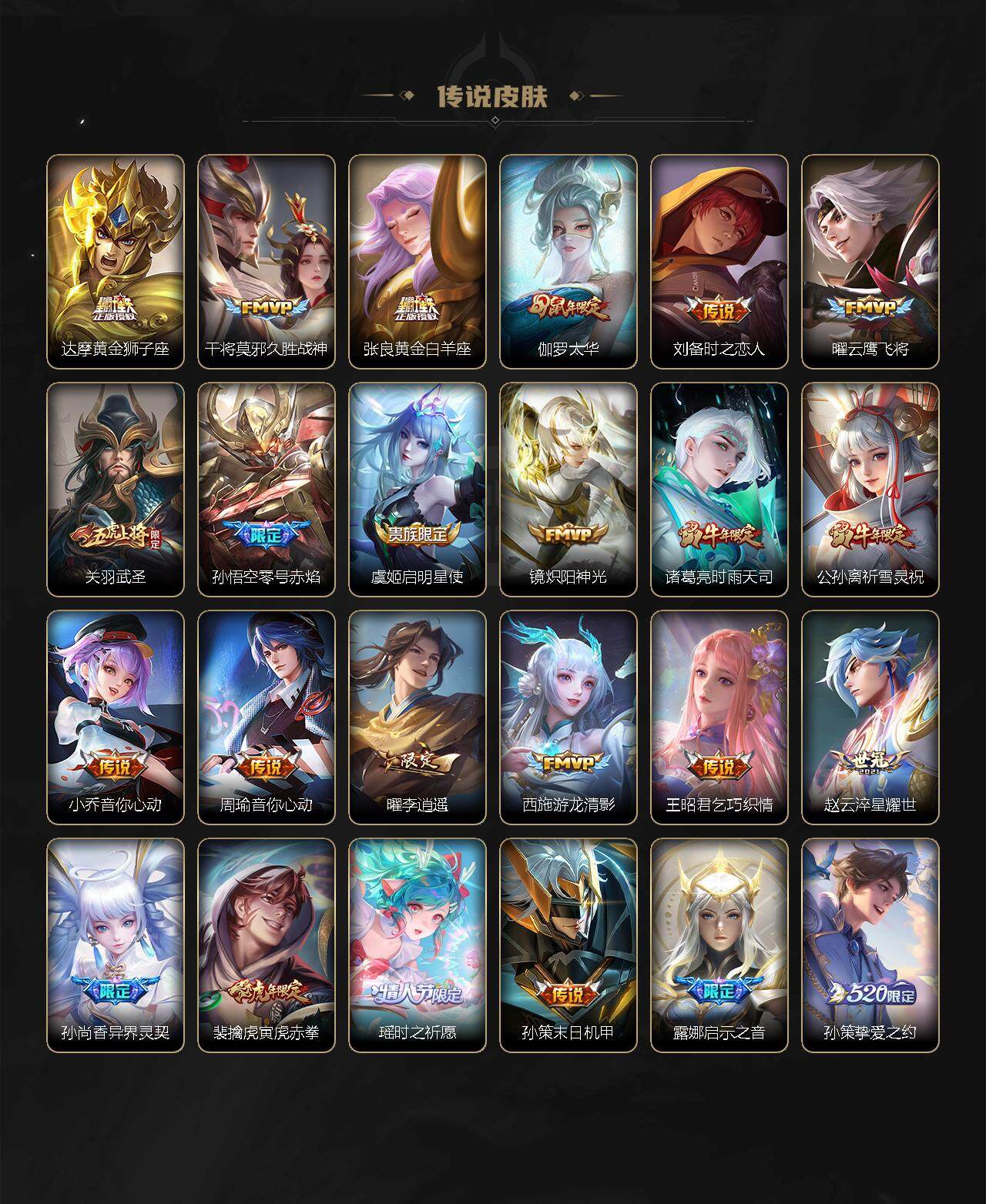 【传说皮肤】:大乔挚爱花嫁,孙策挚爱之约,露娜启示之音,孙策末日机甲,瑶时之祈愿,裴擒虎寅虎赤拳,孙尚香异界灵契,赵云淬星耀世,王昭君乞巧织情,西施游龙清影,曜李逍遥 ,周瑜音你心动,小乔音你心动,公孙离祈雪灵祝,诸葛亮时雨天司,镜炽阳神光,虞姬启明星使,孙悟空零号赤焰,关羽武圣,曜云鹰飞将,刘备时之恋人,伽罗太华,张良黄金白羊座,干将莫邪久胜战神,达摩黄金狮子座,梦奇胖达荣荣,诸葛亮武陵仙君,貂蝉仲夏夜之梦,孙尚香末日机甲,宫本武藏地狱之眼,武则天海洋之心