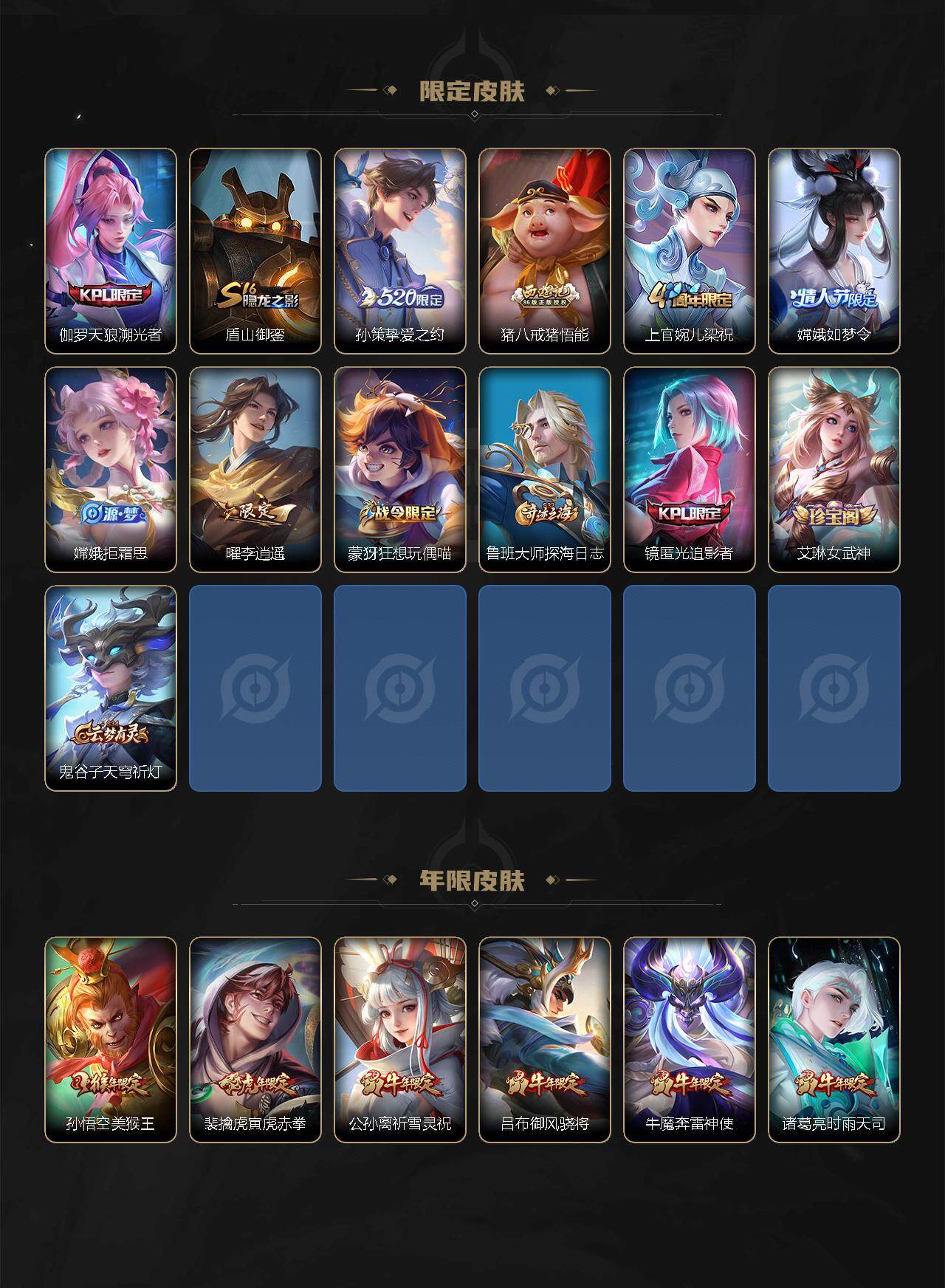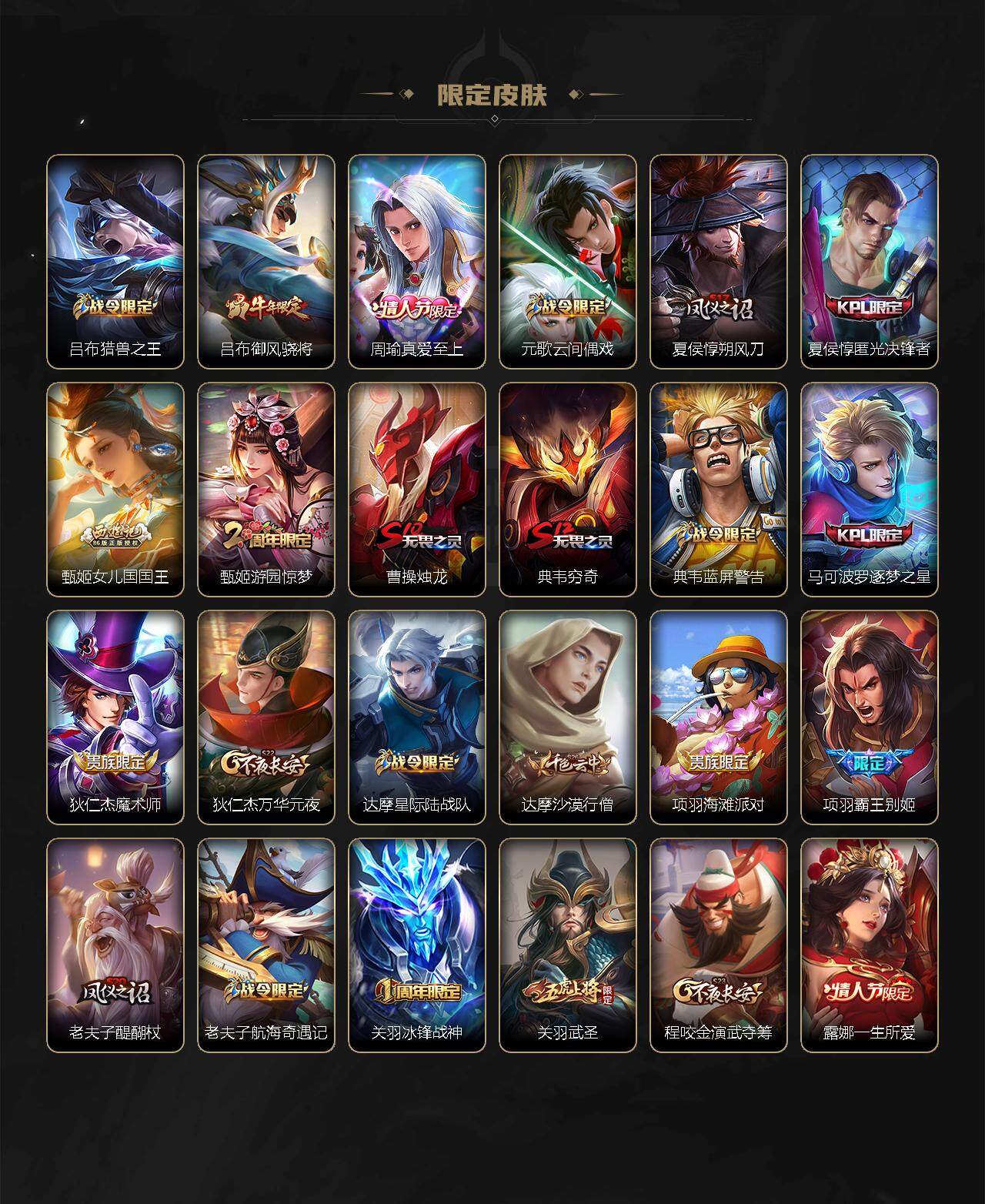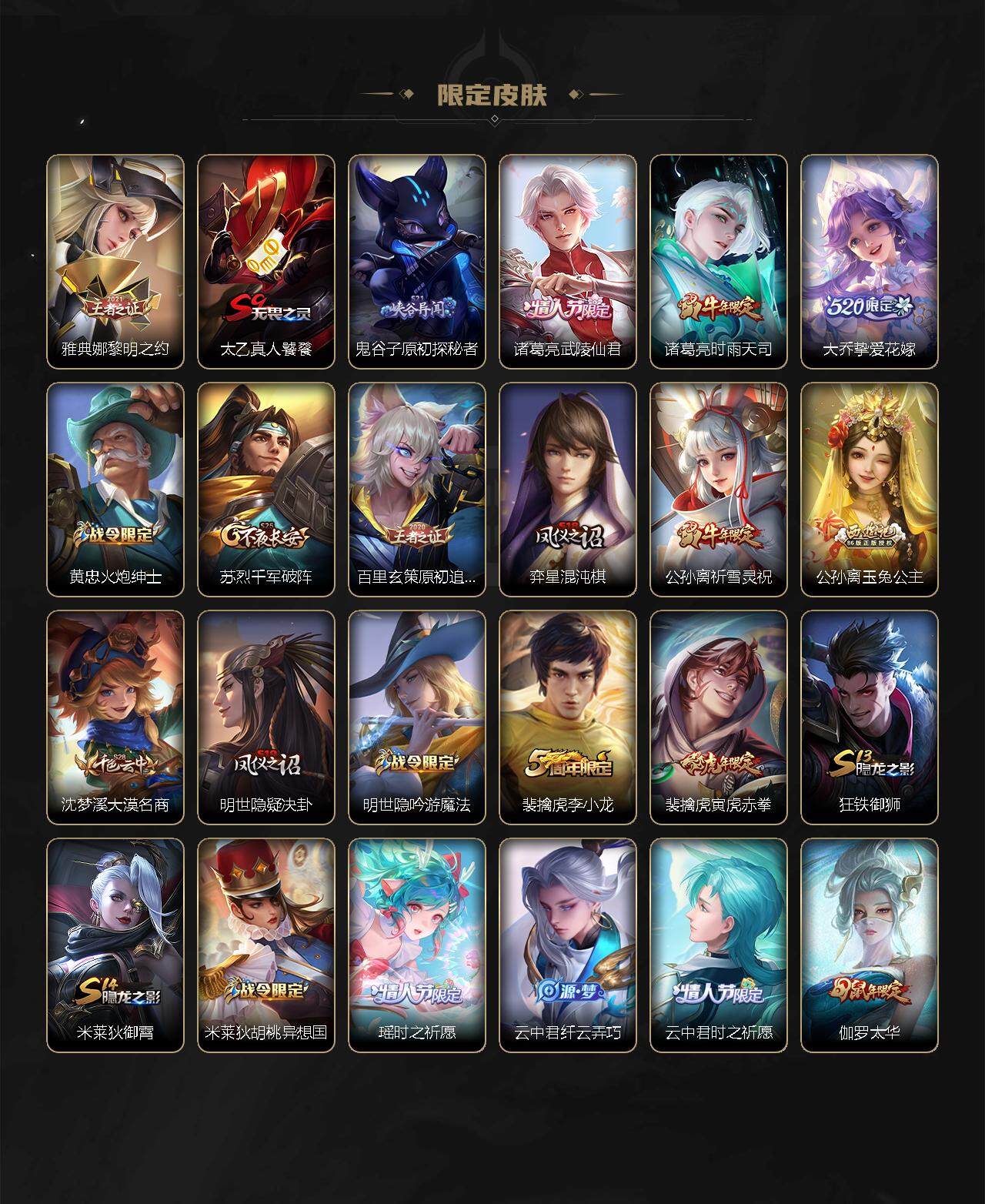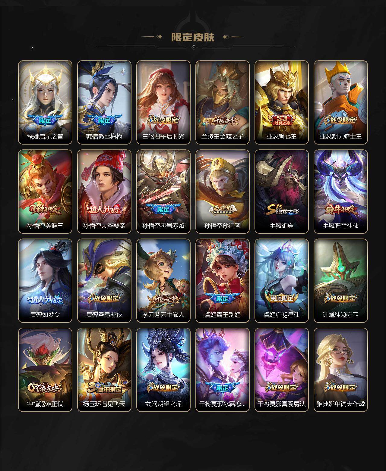 【限定皮肤】:白起狰,狄仁杰阴阳师,小乔纯白花嫁,虞姬凯尔特女王,赵云皇家上将,墨子神迹守卫,妲己时之彼端,嬴政白昼王子,孙尚香异界灵契,鲁班七号狮舞东方,庄周蜃楼王,庄周高山流水,孙膑妖精王,扁鹊炼金王,白起夜都怪侠,芈月重明,芈月白晶晶,芈月幻夜卜梦,吕布猎兽之王,吕布御风骁将,周瑜真爱至上,元歌云间偶戏,夏侯惇朔风刀,夏侯惇匿光决锋者,甄姬女儿国国王,甄姬游园惊梦,曹操烛龙,典韦穷奇,典韦蓝屏警告,马可波罗逐梦之星,狄仁杰魔术师,狄仁杰万华元夜,达摩星际陆战队,达摩沙漠行僧,项羽海滩派对,项羽霸王别姬,老夫子醍醐杖,老夫子航海奇遇记,关羽冰锋战神,关羽武圣,程咬金演武夺筹,露娜一生所爱,露娜启示之音,韩信傲雪梅枪,王昭君午后时光,兰陵王金庭之子,亚瑟狮心王,亚瑟潮玩骑士王,孙悟空美猴王,孙悟空大圣娶亲,孙悟空零号赤焰,孙悟空孙行者,牛魔御旌,牛魔奔雷神使,后羿如梦令,后羿圣弓游侠,李元芳云中旅人,虞姬霸王别姬,虞姬启明星使,钟馗神迹守卫,钟馗驱傩正仪,杨玉环遇见飞天,女娲朔望之晖,干将莫邪冰霜恋舞曲,干将莫邪真爱魔法,雅典娜单词大作战,雅典娜黎明之约,太乙真人饕餮,鬼谷子原初探秘者,诸葛亮武陵仙君,诸葛亮时雨天司,大乔挚爱花嫁,黄忠火炮绅士,苏烈千军破阵,百里玄策原初追逐者,弈星混沌棋,公孙离祈雪灵祝,公孙离玉兔公主,沈梦溪大漠名商,明世隐疑决卦,明世隐吟游魔法,裴擒虎李小龙,裴擒虎寅虎赤拳,狂铁御狮,米莱狄御霄,米莱狄胡桃异想国,瑶时之祈愿,云中君纤云弄巧,云中君时之祈愿,伽罗太