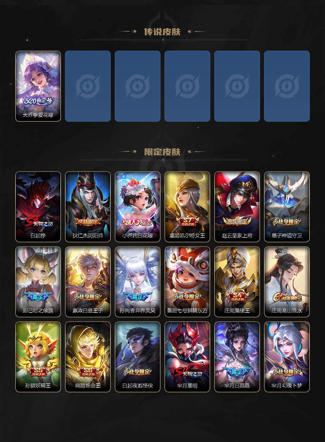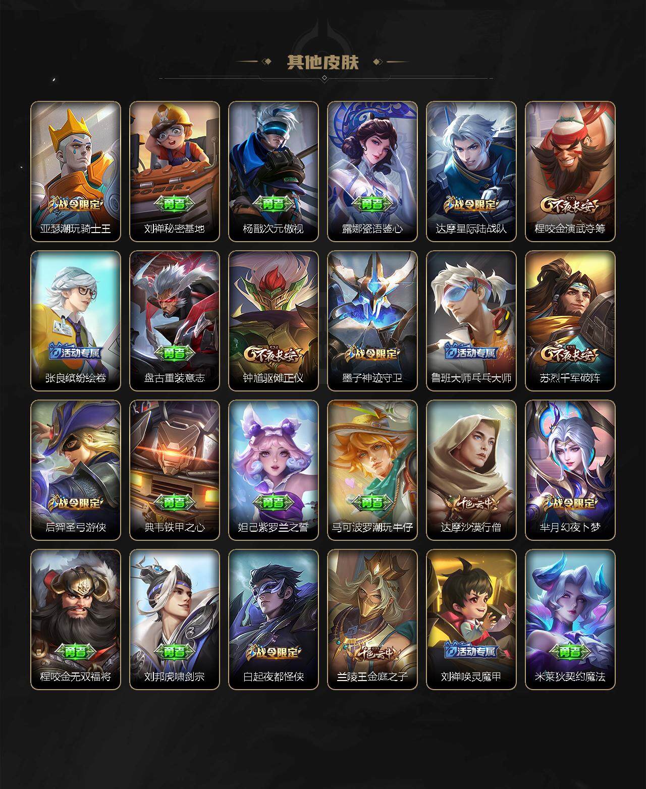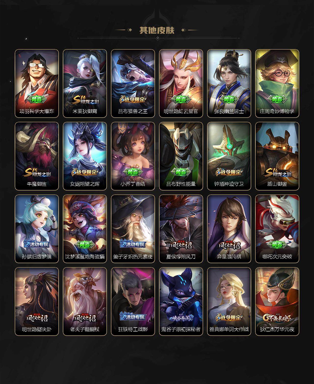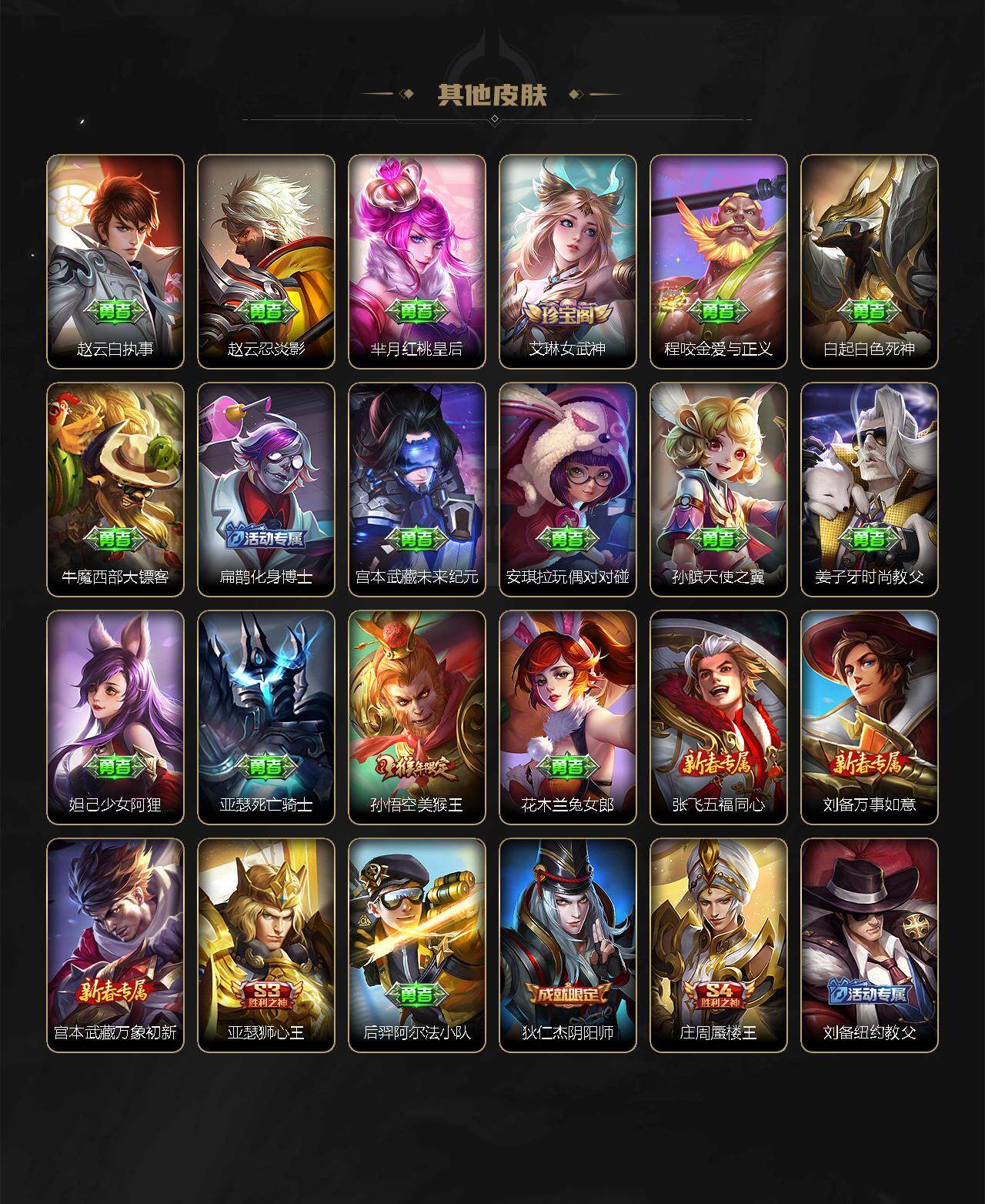【限定皮肤】:白起狰,狄仁杰阴阳师,小乔纯白花嫁,虞姬凯尔特女王,赵云皇家上将,墨子神迹守卫,妲己时之彼端,嬴政白昼王子,孙尚香异界灵契,鲁班七号狮舞东方,庄周蜃楼王,庄周高山流水,孙膑妖精王,扁鹊炼金王,白起夜都怪侠,芈月重明,芈月白晶晶,芈月幻夜卜梦,吕布猎兽之王,吕布御风骁将,周瑜真爱至上,元歌云间偶戏,夏侯惇朔风刀,夏侯惇匿光决锋者,甄姬女儿国国王,甄姬游园惊梦,曹操烛龙,典韦穷奇,典韦蓝屏警告,马可波罗逐梦之星,狄仁杰魔术师,狄仁杰万华元夜,达摩星际陆战队,达摩沙漠行僧,项羽海滩派对,项羽霸王别姬,老夫子醍醐杖,老夫子航海奇遇记,关羽冰锋战神,关羽武圣,程咬金演武夺筹,露娜一生所爱,露娜启示之音,韩信傲雪梅枪,王昭君午后时光,兰陵王金庭之子,亚瑟狮心王,亚瑟潮玩骑士王,孙悟空美猴王,孙悟空大圣娶亲,孙悟空零号赤焰,孙悟空孙行者,牛魔御旌,牛魔奔雷神使,后羿如梦令,后羿圣弓游侠,李元芳云中旅人,虞姬霸王别姬,虞姬启明星使,钟馗神迹守卫,钟馗驱傩正仪,杨玉环遇见飞天,女娲朔望之晖,干将莫邪冰霜恋舞曲,干将莫邪真爱魔法,雅典娜单词大作战,雅典娜黎明之约,太乙真人饕餮,鬼谷子原初探秘者,诸葛亮武陵仙君,诸葛亮时雨天司,大乔挚爱花嫁,黄忠火炮绅士,苏烈千军破阵,百里玄策原初追逐者,弈星混沌棋,公孙离祈雪灵祝,公孙离玉兔公主,沈梦溪大漠名商,明世隐疑决卦,明世隐吟游魔法,裴擒虎李小龙,裴擒虎寅虎赤拳,狂铁御狮,米莱狄御霄,米莱狄胡桃异想国,瑶时之祈愿,云中君纤云弄巧,云中君时之祈愿,伽罗太