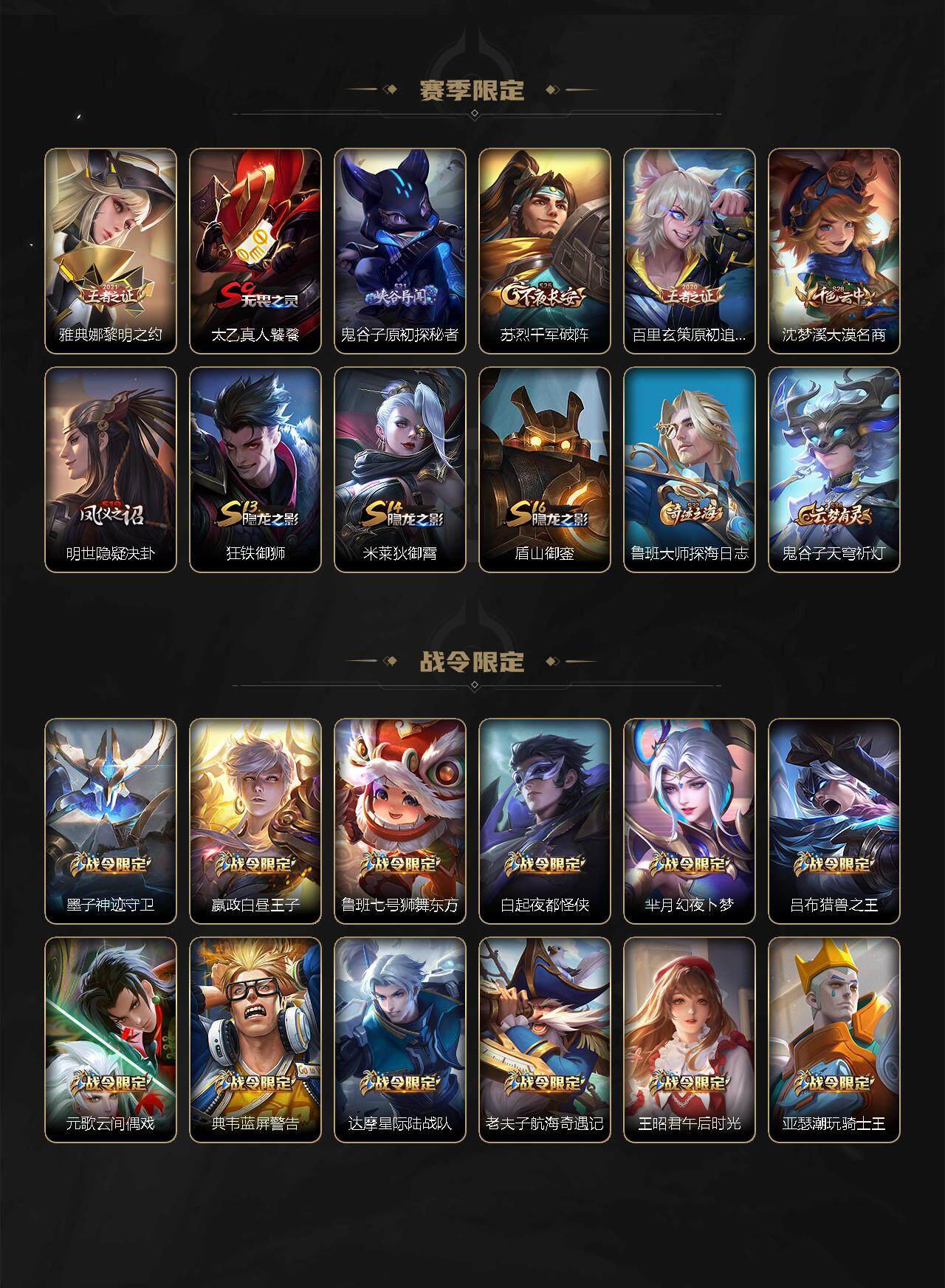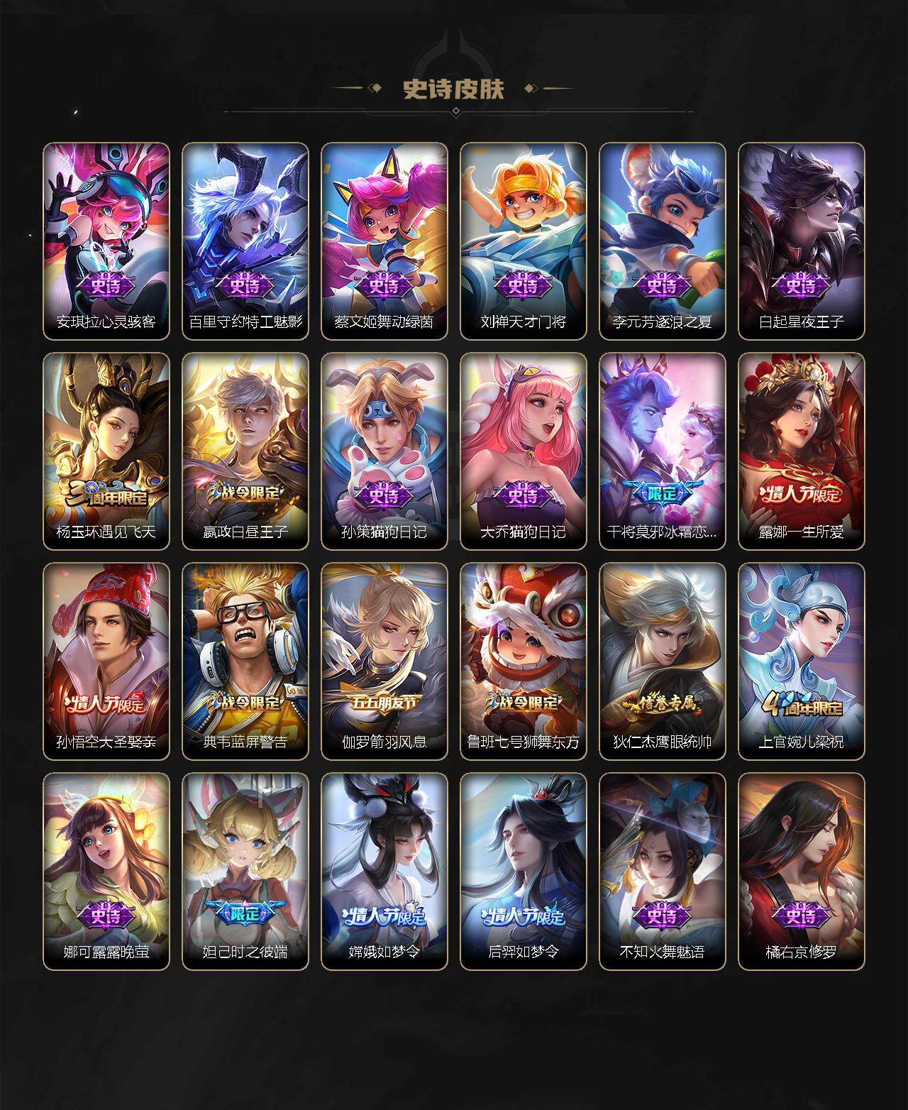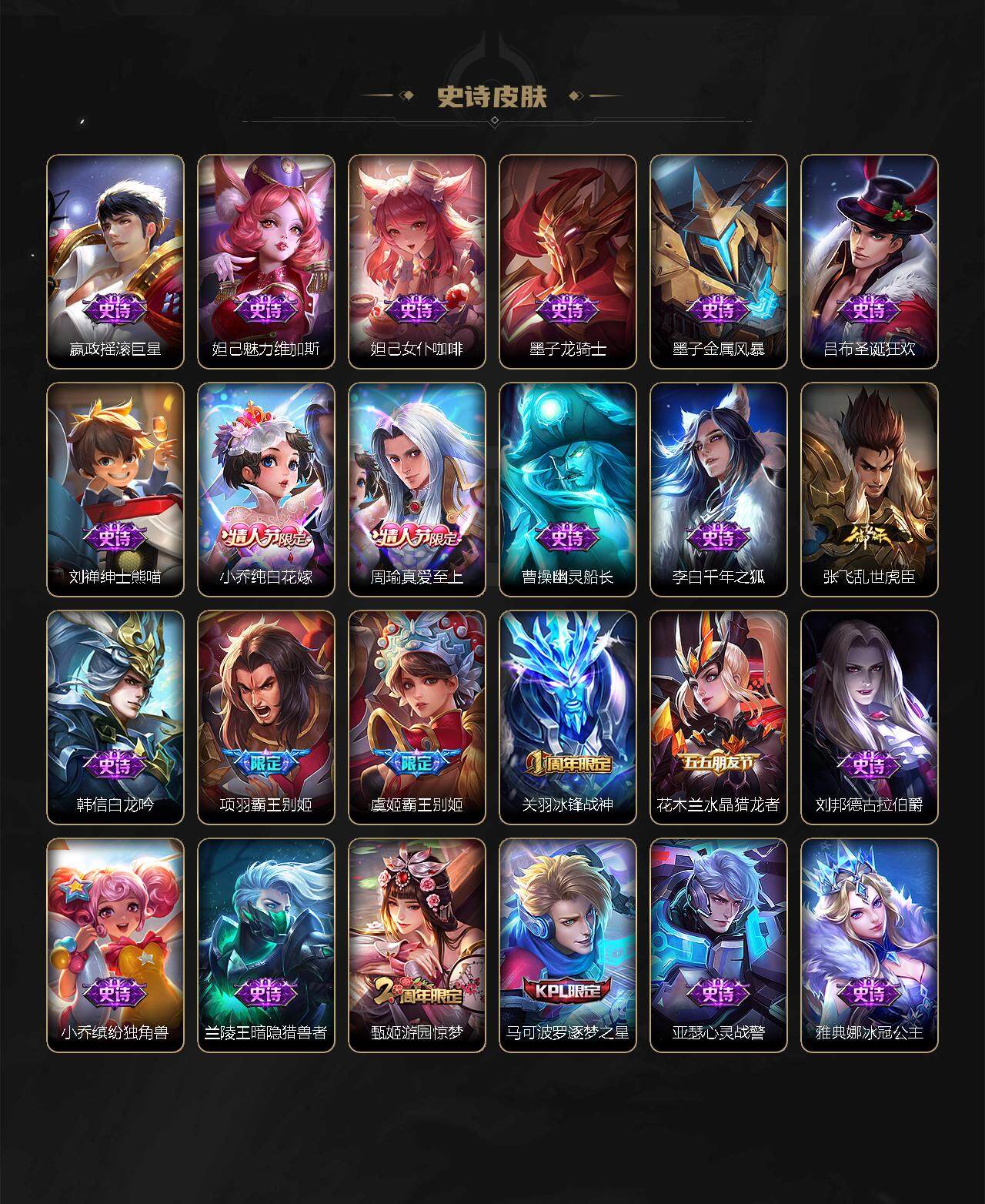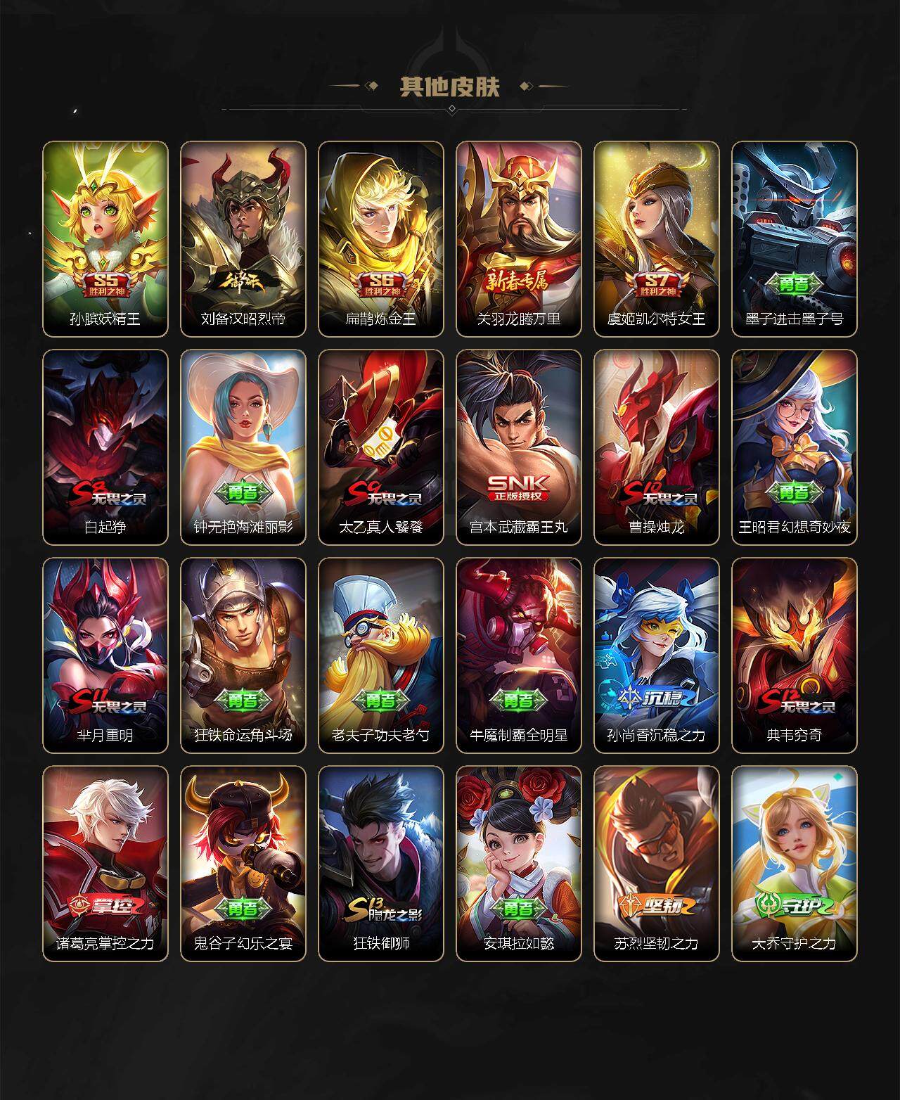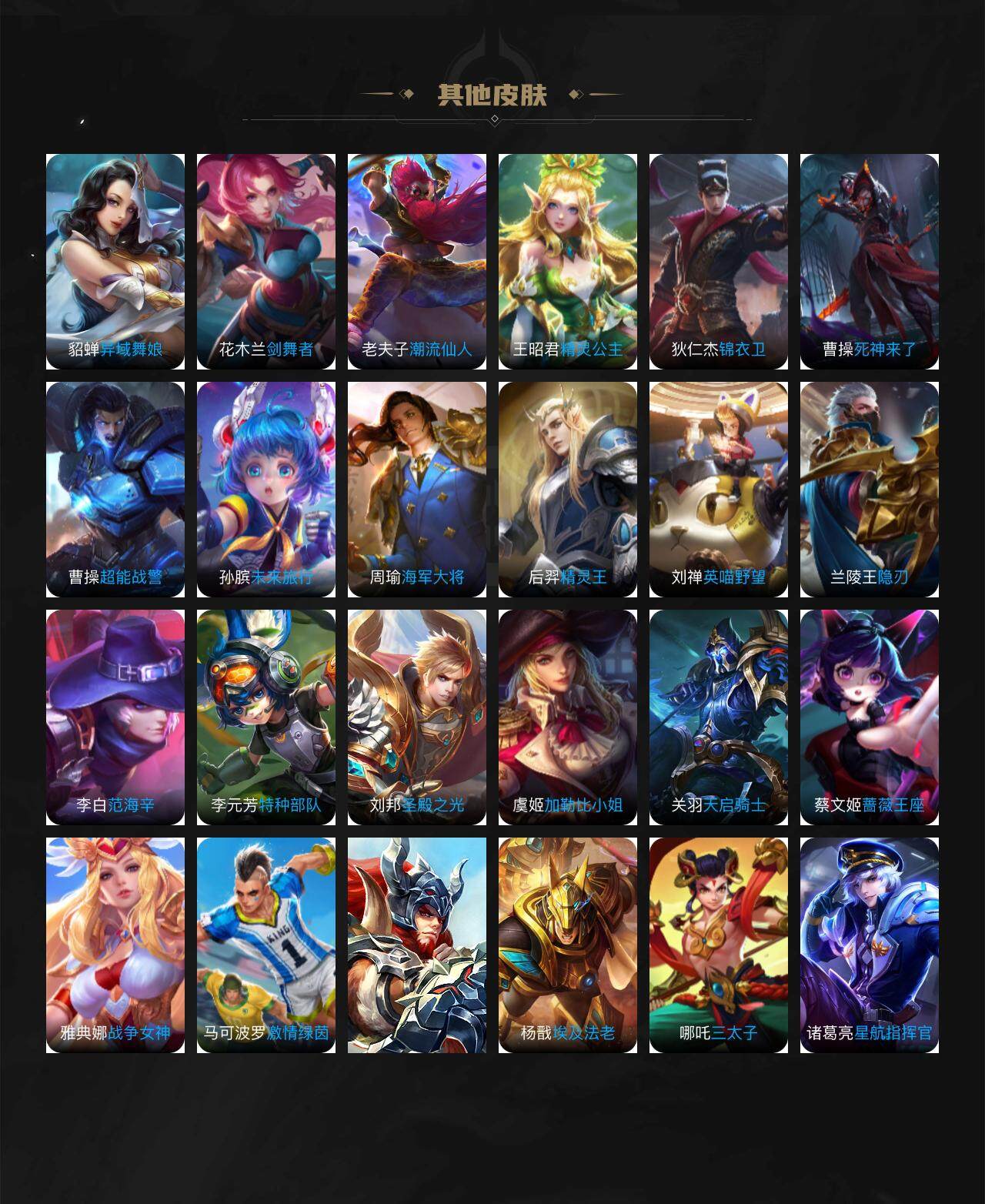 【限定皮肤】:白起狰,狄仁杰阴阳师,小乔纯白花嫁,虞姬凯尔特女王,赵云皇家上将,墨子神迹守卫,妲己时之彼端,嬴政白昼王子,孙尚香异界灵契,鲁班七号狮舞东方,庄周蜃楼王,庄周高山流水,孙膑妖精王,扁鹊炼金王,白起夜都怪侠,芈月重明,芈月白晶晶,芈月幻夜卜梦,吕布猎兽之王,吕布御风骁将,周瑜真爱至上,元歌云间偶戏,夏侯惇朔风刀,夏侯惇匿光决锋者,甄姬女儿国国王,甄姬游园惊梦,曹操烛龙,典韦穷奇,典韦蓝屏警告,马可波罗逐梦之星,狄仁杰魔术师,狄仁杰万华元夜,达摩星际陆战队,达摩沙漠行僧,项羽海滩派对,项羽霸王别姬,老夫子醍醐杖,老夫子航海奇遇记,关羽冰锋战神,关羽武圣,程咬金演武夺筹,露娜一生所爱,露娜启示之音,韩信傲雪梅枪,王昭君午后时光,兰陵王金庭之子,亚瑟狮心王,亚瑟潮玩骑士王,孙悟空美猴王,孙悟空大圣娶亲,孙悟空零号赤焰,孙悟空孙行者,牛魔御旌,牛魔奔雷神使,后羿如梦令,后羿圣弓游侠,李元芳云中旅人,虞姬霸王别姬,虞姬启明星使,钟馗神迹守卫,钟馗驱傩正仪,杨玉环遇见飞天,女娲朔望之晖,干将莫邪冰霜恋舞曲,干将莫邪真爱魔法,雅典娜单词大作战,雅典娜黎明之约,太乙真人饕餮,鬼谷子原初探秘者,诸葛亮武陵仙君,诸葛亮时雨天司,大乔挚爱花嫁,黄忠火炮绅士,苏烈千军破阵,百里玄策原初追逐者,弈星混沌棋,公孙离祈雪灵祝,公孙离玉兔公主,沈梦溪大漠名商,明世隐疑决卦,明世隐吟游魔法,裴擒虎李小龙,裴擒虎寅虎赤拳,狂铁御狮,米莱狄御霄,米莱狄胡桃异想国,瑶时之祈愿,云中君纤云弄巧,云中君时之祈愿,伽罗太