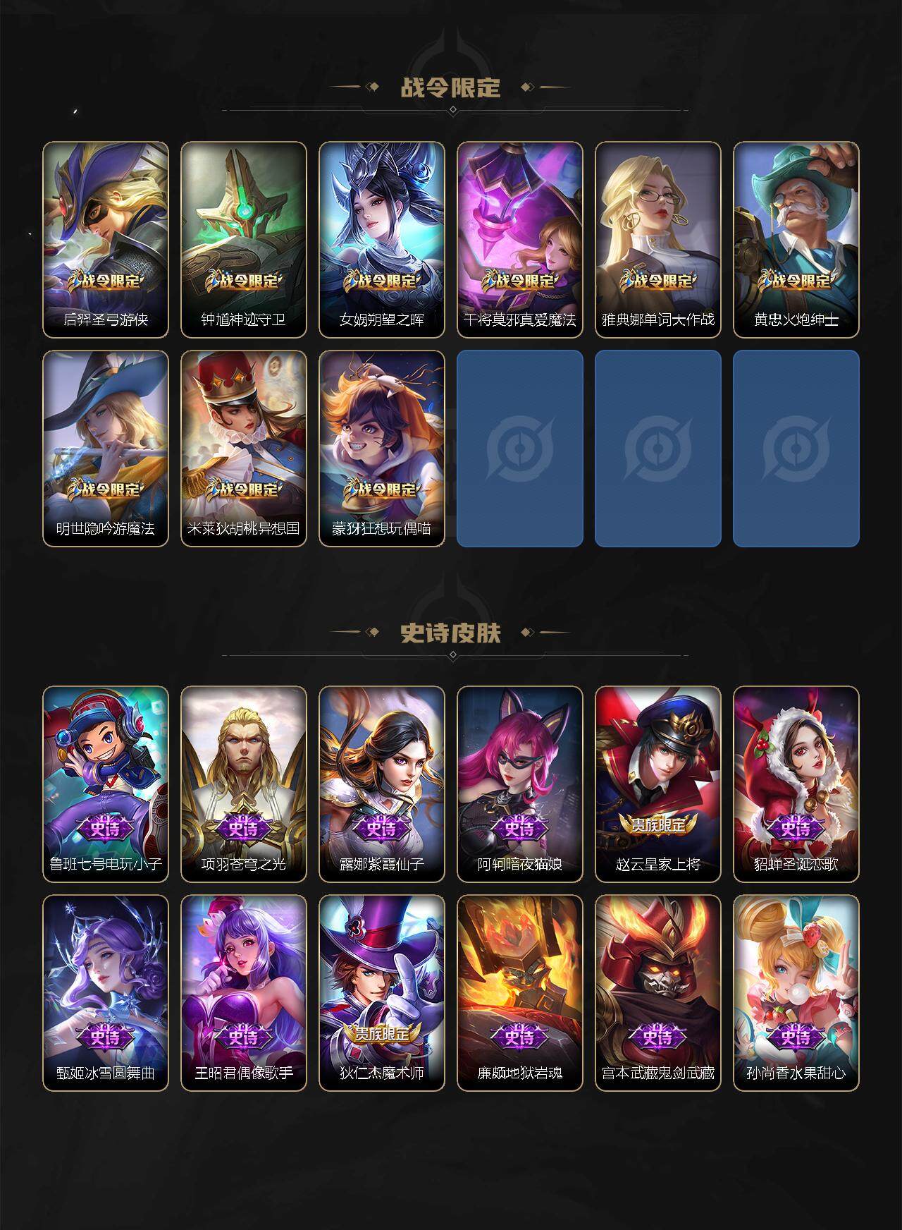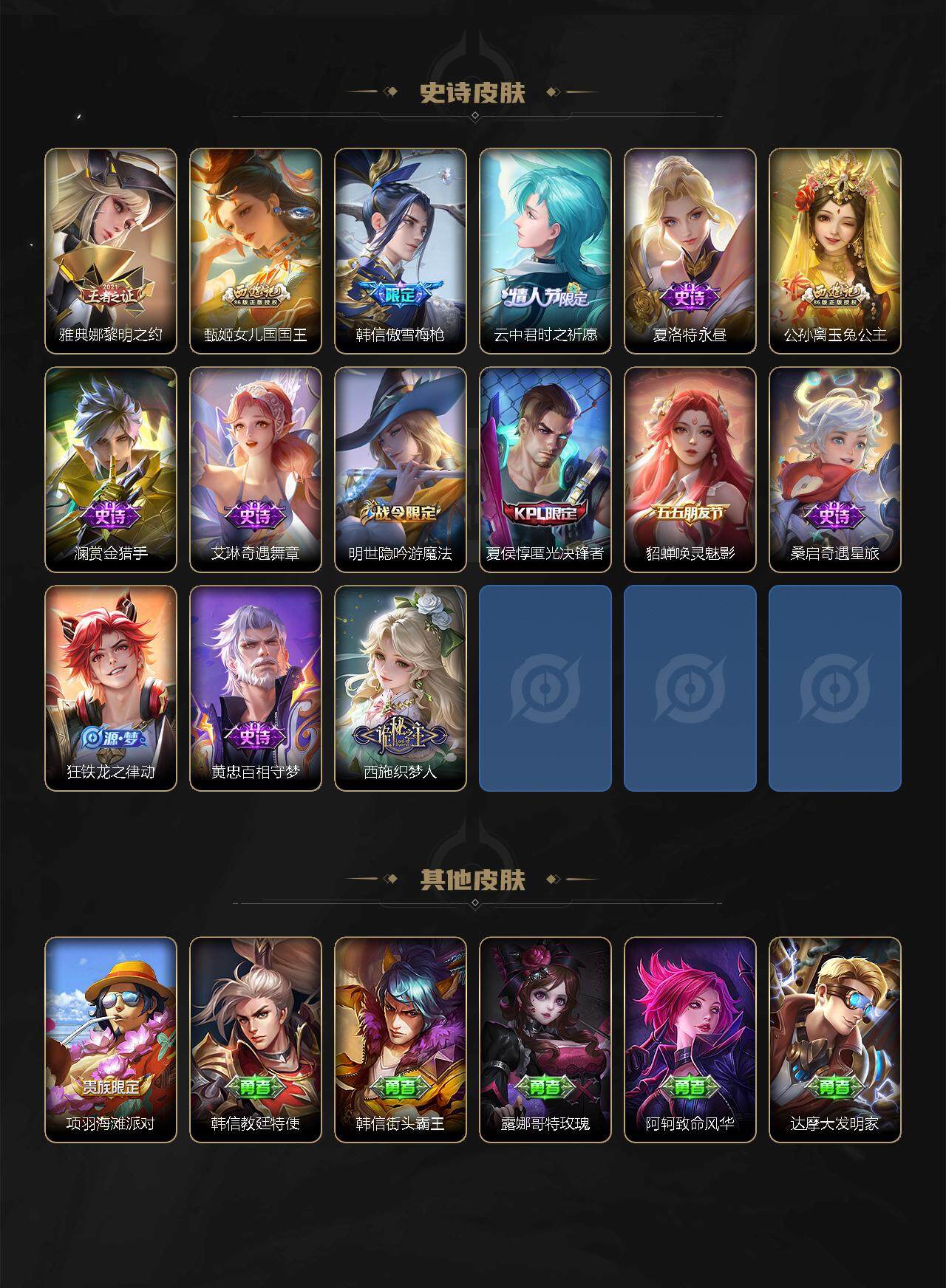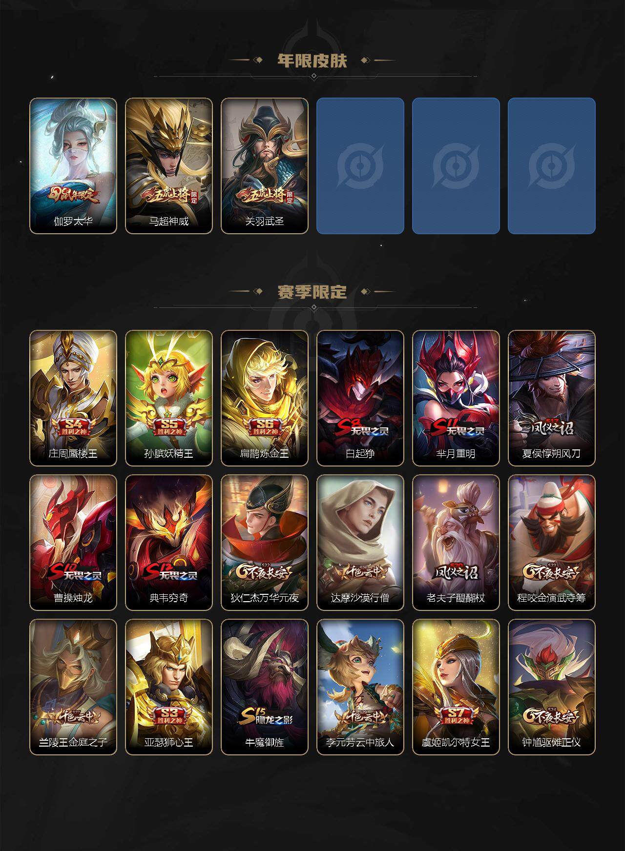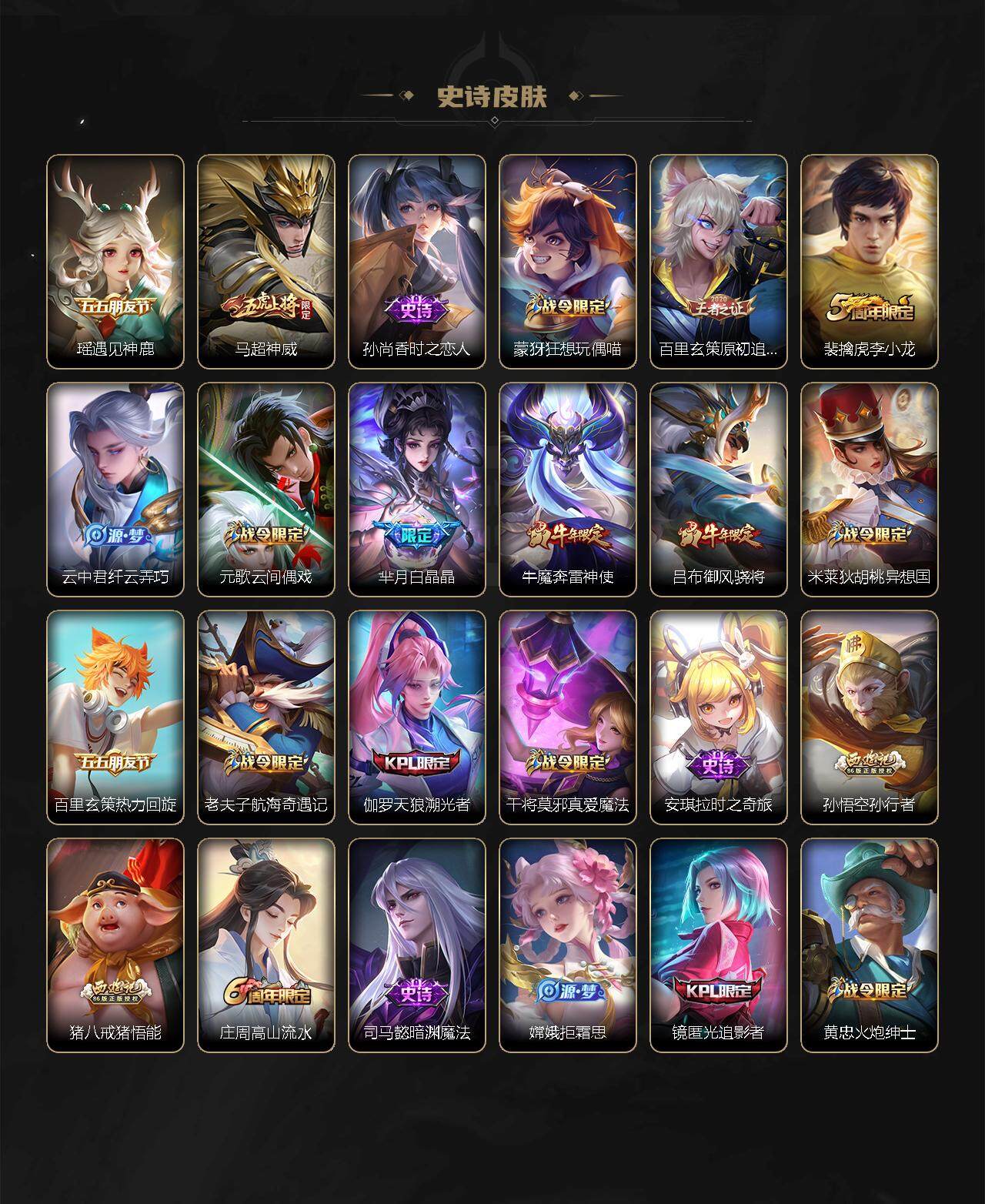 【限定皮肤】:白起狰,狄仁杰阴阳师,小乔纯白花嫁,虞姬凯尔特女王,赵云皇家上将,墨子神迹守卫,妲己时之彼端,嬴政白昼王子,孙尚香异界灵契,鲁班七号狮舞东方,庄周蜃楼王,庄周高山流水,孙膑妖精王,扁鹊炼金王,白起夜都怪侠,芈月重明,芈月白晶晶,芈月幻夜卜梦,吕布猎兽之王,吕布御风骁将,周瑜真爱至上,元歌云间偶戏,夏侯惇朔风刀,夏侯惇匿光决锋者,甄姬女儿国国王,甄姬游园惊梦,曹操烛龙,典韦穷奇,典韦蓝屏警告,马可波罗逐梦之星,狄仁杰魔术师,狄仁杰万华元夜,达摩星际陆战队,达摩沙漠行僧,项羽海滩派对,项羽霸王别姬,老夫子醍醐杖,老夫子航海奇遇记,关羽冰锋战神,关羽武圣,程咬金演武夺筹,露娜一生所爱,露娜启示之音,韩信傲雪梅枪,王昭君午后时光,兰陵王金庭之子,亚瑟狮心王,亚瑟潮玩骑士王,孙悟空美猴王,孙悟空大圣娶亲,孙悟空零号赤焰,孙悟空孙行者,牛魔御旌,牛魔奔雷神使,后羿如梦令,后羿圣弓游侠,李元芳云中旅人,虞姬霸王别姬,虞姬启明星使,钟馗神迹守卫,钟馗驱傩正仪,杨玉环遇见飞天,女娲朔望之晖,干将莫邪冰霜恋舞曲,干将莫邪真爱魔法,雅典娜单词大作战,雅典娜黎明之约,太乙真人饕餮,鬼谷子原初探秘者,诸葛亮武陵仙君,诸葛亮时雨天司,大乔挚爱花嫁,黄忠火炮绅士,苏烈千军破阵,百里玄策原初追逐者,弈星混沌棋,公孙离祈雪灵祝,公孙离玉兔公主,沈梦溪大漠名商,明世隐疑决卦,明世隐吟游魔法,裴擒虎李小龙,裴擒虎寅虎赤拳,狂铁御狮,米莱狄御霄,米莱狄胡桃异想国,瑶时之祈愿,云中君纤云弄巧,云中君时之祈愿,伽罗太