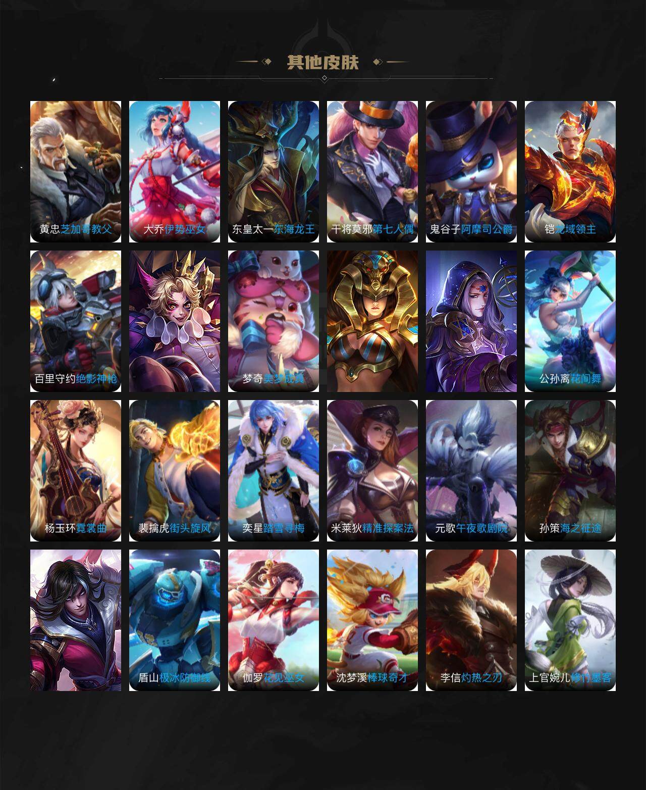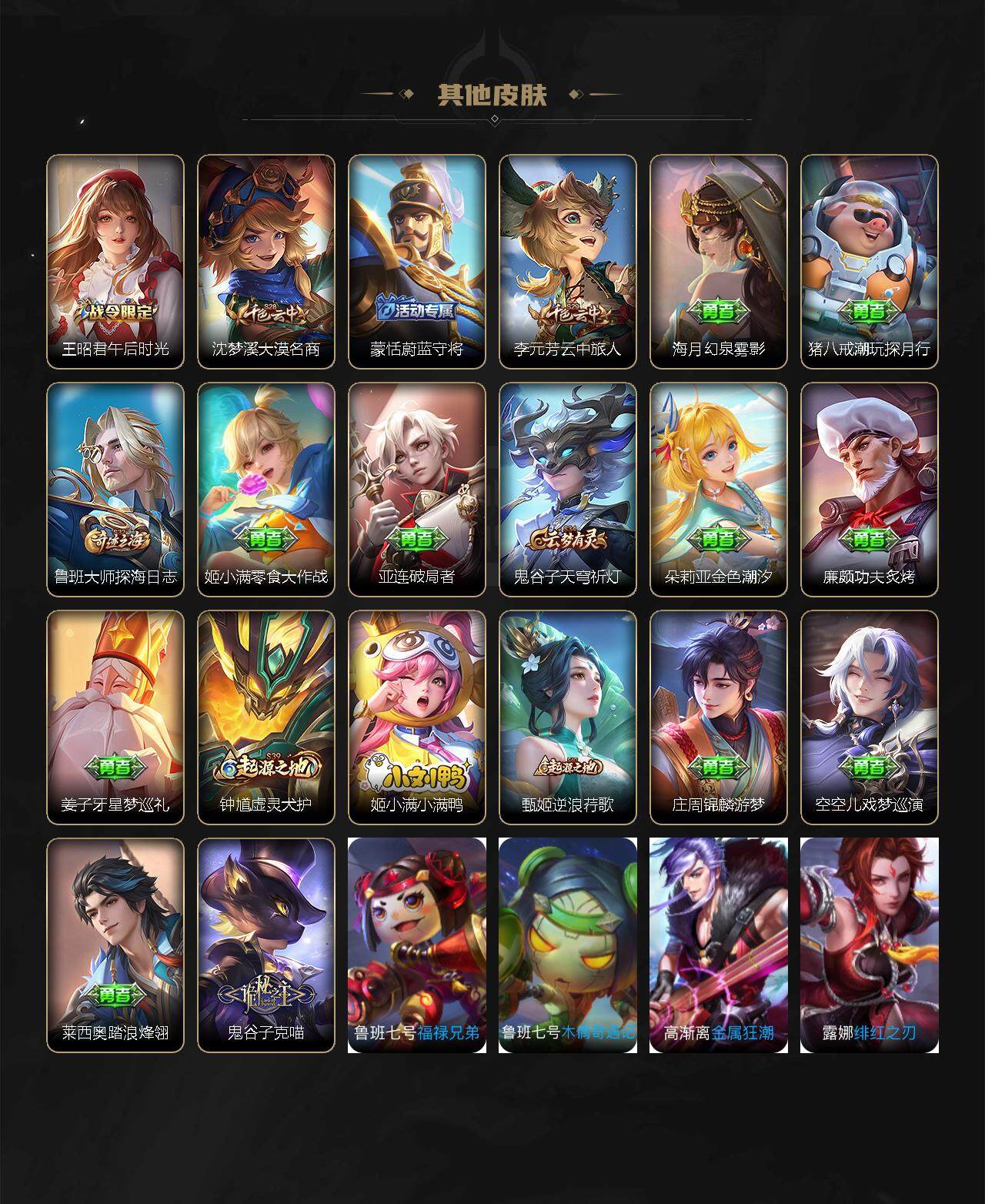 瑶遇见神鹿,娜可露露晚萤,伽罗箭羽风息,李元芳逐浪之夏,不知火舞魅语,大乔猫狗日记,孙策猫狗日记,露娜紫霞仙子,王昭君偶像歌手,韩信白龙吟,项羽苍穹之光,孙尚香时之恋人,阿轲暗夜猫娘,雅典娜冰冠公主,鲁班七号电玩小子,橘右京修罗,墨子龙骑士,嬴政摇滚巨星,刘禅绅士熊喵,刘禅天才门将,白起星夜王子,安琪拉心灵骇客,安琪拉时之奇旅,刘邦德古拉伯爵,兰陵王暗隐猎兽者,曹操幽灵船长,宫本武藏鬼剑武藏,司马懿暗渊魔法,亚瑟心灵战警,蔡文姬舞动绿茵,廉颇地狱岩魂,小乔缤纷独角兽,花木兰水晶猎龙者,百里玄策热力回旋,墨子金属风暴,百里玄策原初追逐者,吕布圣诞狂欢,貂蝉圣诞恋歌,百里守约特工魅影,嫦娥拒霜思,雅典娜黎明之约,李白千年之狐,夏洛特永昼,澜赏金猎手,艾琳奇遇舞章,貂蝉唤灵魅影,桑启奇遇星旅