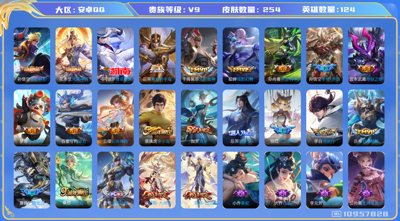 [10957828]【商品标题】:安卓Q-V9-至尊星耀IV段位-124英雄-254皮肤-2典藏-0珍品无双-0无双-1珍品传说-17传说-63史诗