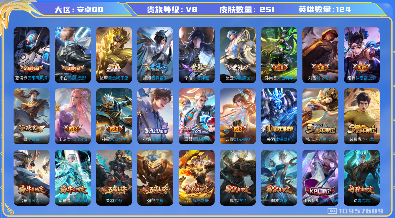 [10957689]【商品标题】:安卓Q-V8-永恒钻石I段位-124英雄-251皮肤-2典藏-0珍品无双-0无双-0珍品传说-19传说-70史诗