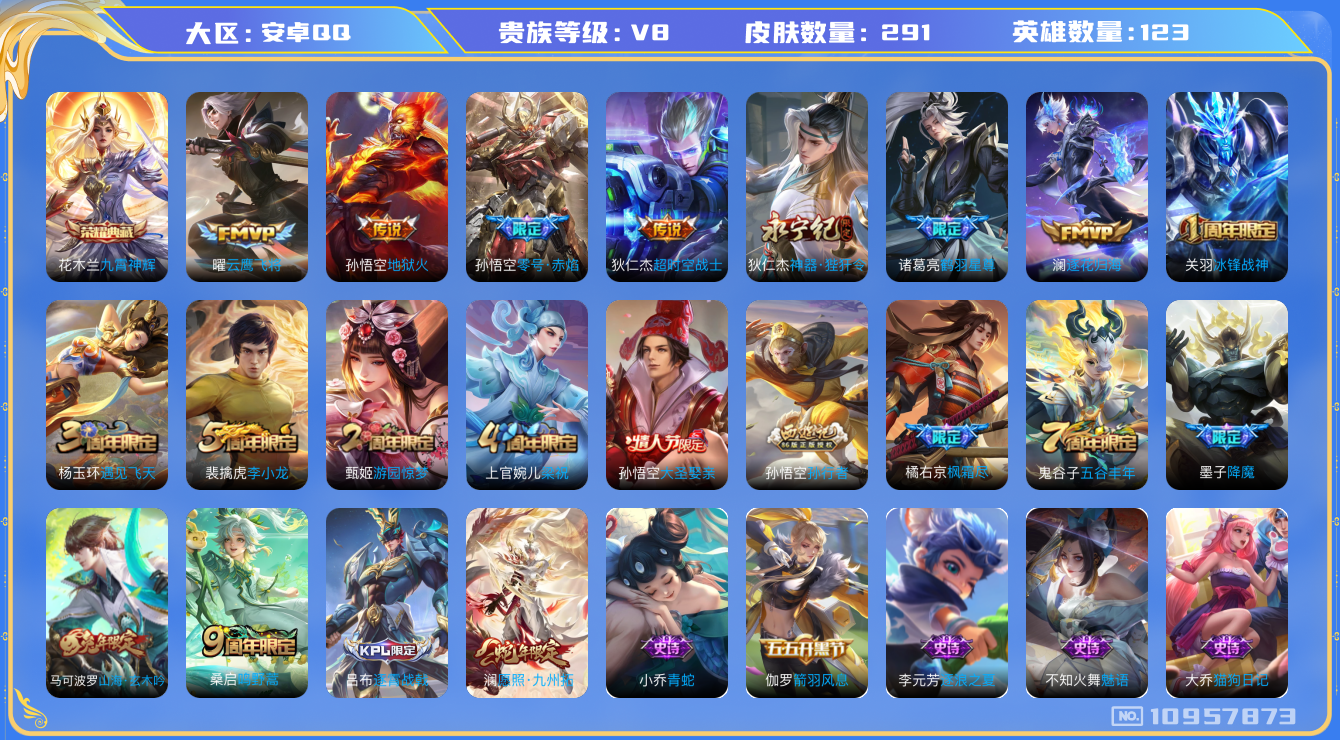 [10957873]【商品标题】:安卓Q-V8-最强王者段位-123英雄-291皮肤-1典藏-0珍品无双-0无双-0珍品传说-11传说-74史诗
