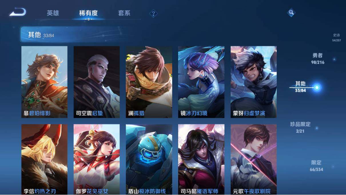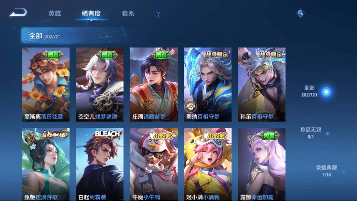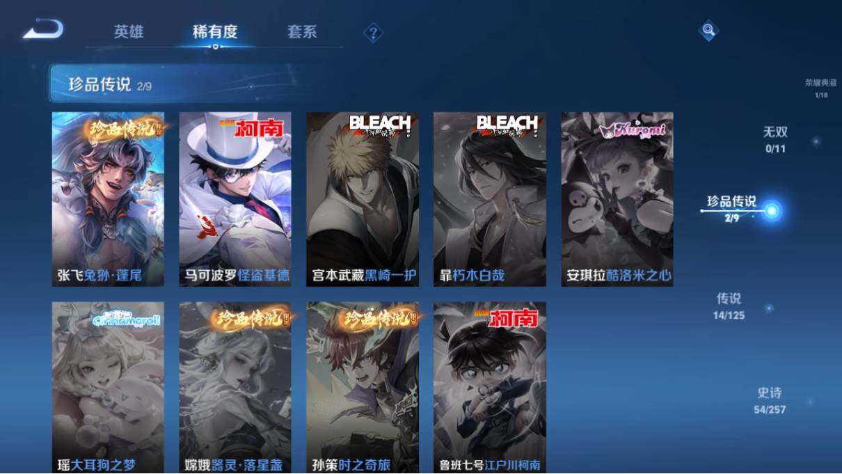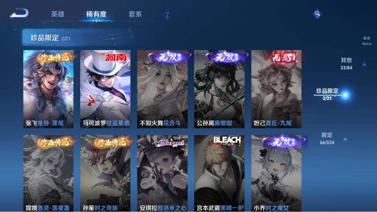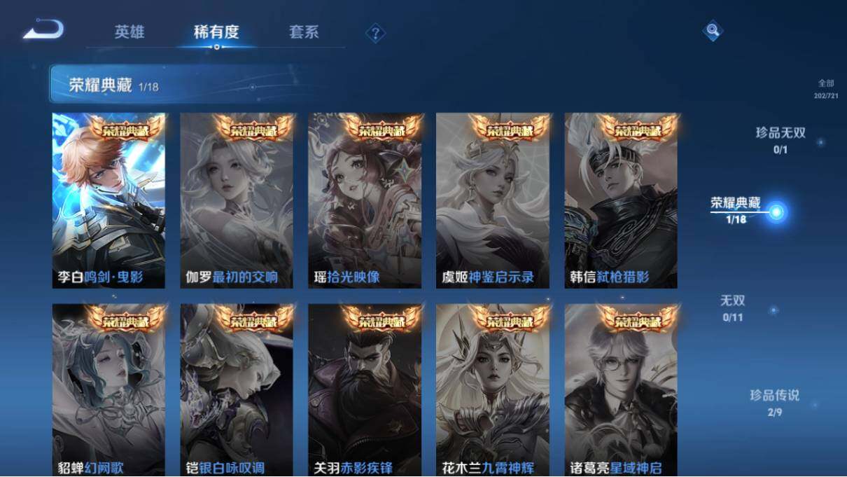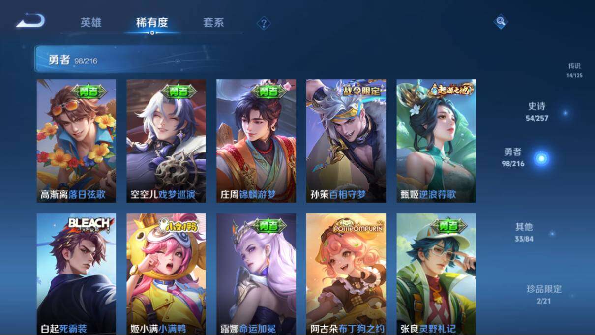 - PX_2096224-85 安卓微信/永恒钻石/187皮肤/123英雄/3典藏/0珍品无双/1无双/4珍品传说/10传说/51史诗/7稀有英雄 【4 珍品传说】怪盗基德 马可波罗,时之奇旅 孙策,器灵·落星盏 嫦娥,江户川柯南 鲁班七号, 【3 典藏皮肤】银白咏叹调 铠,弑枪猎影 韩信,九霄神辉 花木兰, 【1 无双皮肤】离恨烟 公孙离, 【10 传说皮肤】飞鸢探春 李元芳,无双飞将 马超,地狱之