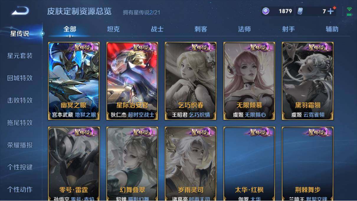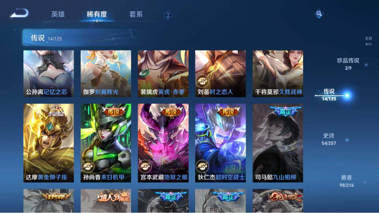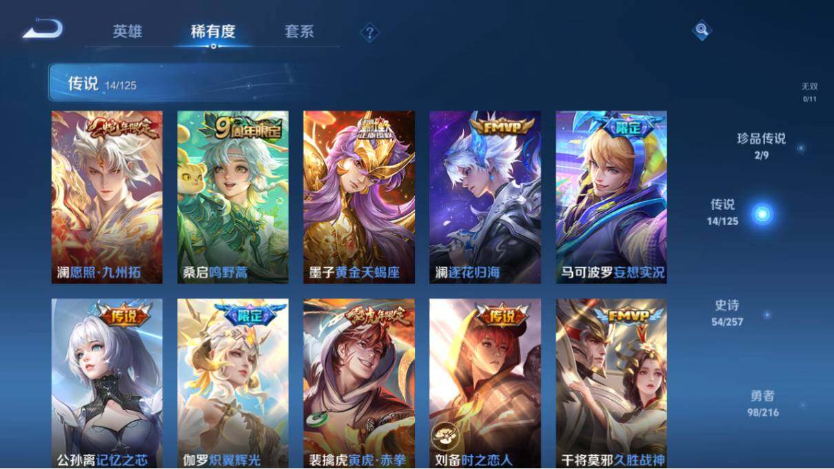 【传说皮肤】:狄仁杰超时空战士,宫本武藏地狱之眼,孙尚香末日机甲,达摩黄金狮子座,干将莫邪久胜战神,刘备时之恋人,裴擒虎寅虎赤拳,伽罗炽翼辉光,公孙离记忆之芯,马可波罗妄想实况,澜逐花归海,墨子黄金天蝎座,桑启鸣野蒿,澜愿照九州拓