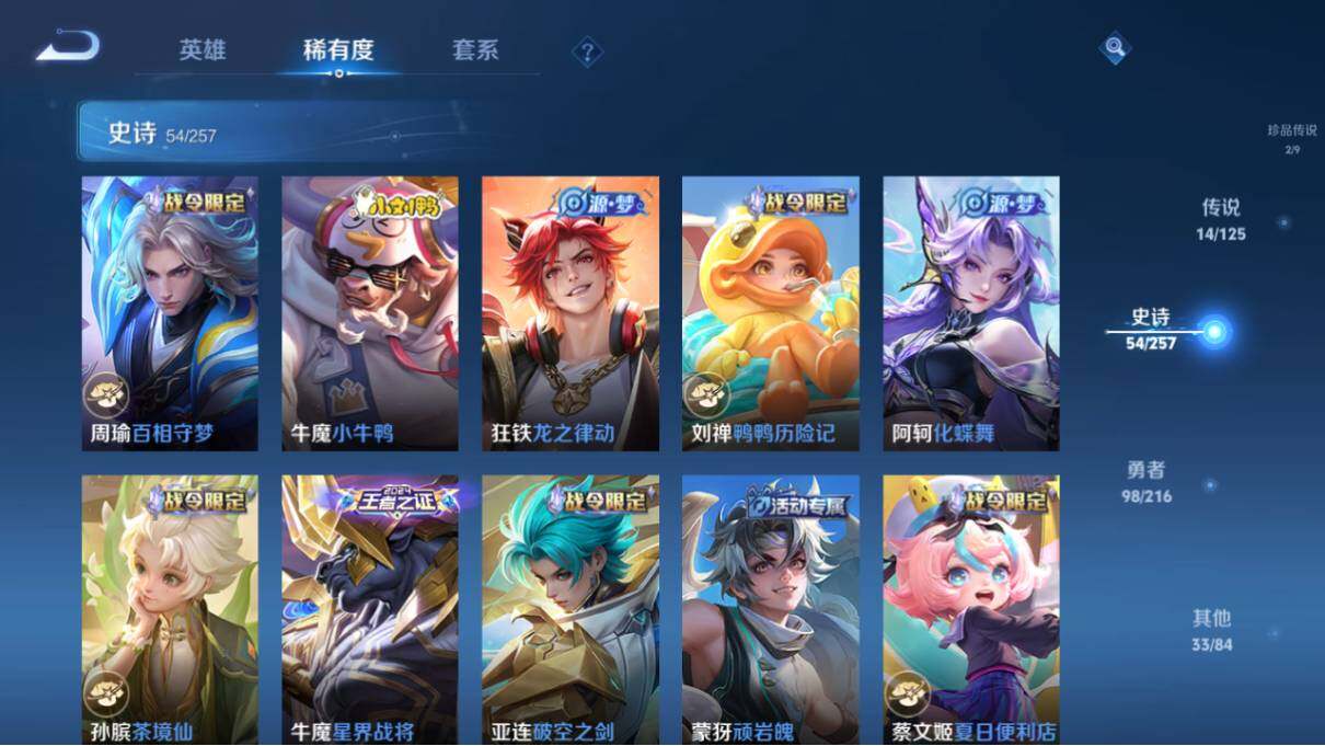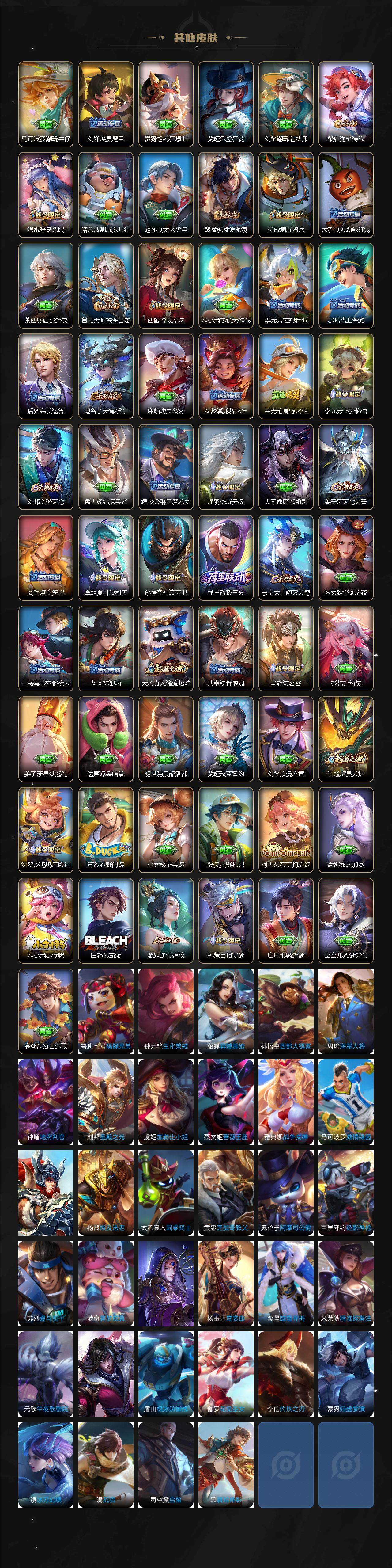 【限定皮肤】:蒙犽顽岩魄,蔡文姬夏日便利店,虞姬夏日便利店,姜子牙天穹之誓,狄仁杰阴阳师,赵云皇家上将,鲁班七号狮舞东方,高渐离死亡摇滚,扁鹊奇幻香踪,典韦蓝屏警告,马可波罗暗影游猎,马可波罗妄想实况,狄仁杰魔术师,项羽海滩派对,关羽冰锋战神,孙悟空至尊宝,孙悟空孙行者,杨戬潮玩骑兵,干将莫邪真爱魔法,雅典娜黎明之约,百里玄策原初追逐者,裴擒虎寅虎赤拳,裴擒虎擒涛扼浪,伽罗炽翼辉光,嫦娥暖冬兔眠,西施玲珑珍味,鲁班大师探海日志,桑启海盐诗旅,暃星界游侠,戈娅驭风魔法,司空震地狱燃心,蒙恬荣光圣徽,鬼谷子天穹祈灯,姬小满妄想食味,沈梦溪龙舞盛年,鲁班七号蔬乡物语,李元芳蔬乡物语,刘邦剑破天穹,程咬金群星魔术团,镜青焰无极,项羽苍威无极,周瑜熔金海岸