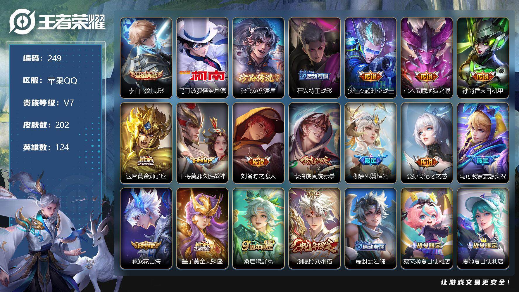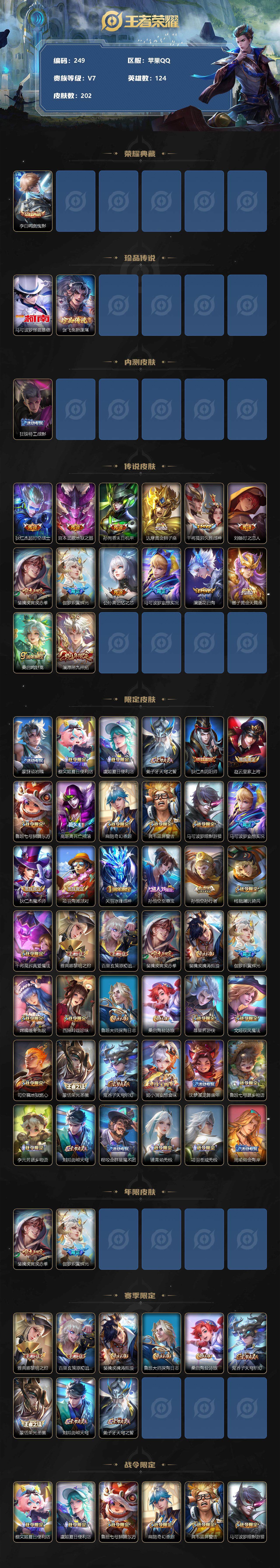 [10957809]【商品标题】:苹果Q-V7-最强王者段位-124英雄-202皮肤-1典藏-0珍品无双-0无双-2珍品传说-14传说-54史诗
