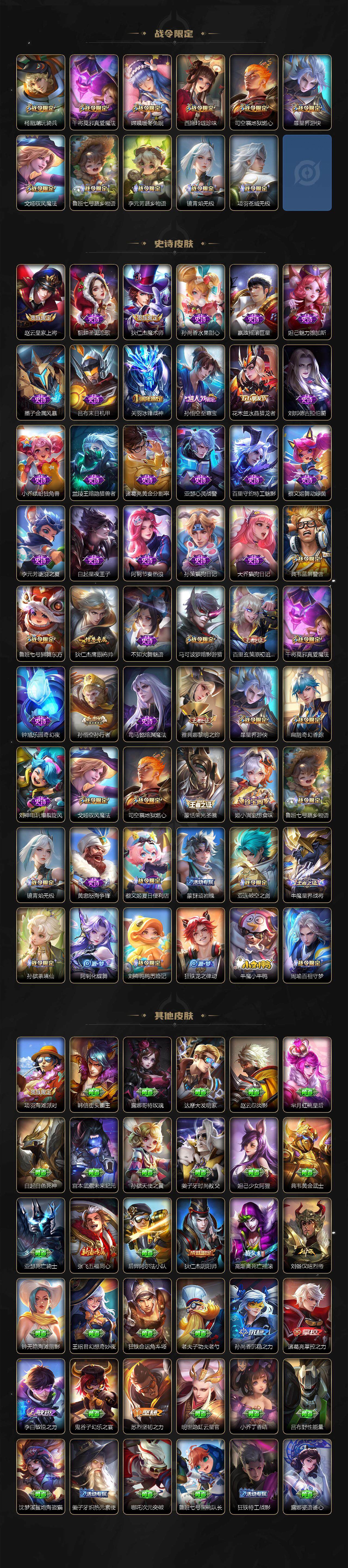【史诗皮肤】:赵云皇家上将,貂蝉圣诞恋歌,狄仁杰魔术师,孙尚香水果甜心,嬴政摇滚巨星,妲己魅力维加斯,墨子金属风暴,吕布末日机甲,关羽冰锋战神,孙悟空至尊宝,花木兰水晶猎龙者,刘邦德古拉伯爵,小乔缤纷独角兽,兰陵王暗隐猎兽者,诸葛亮黄金分割率,亚瑟心灵战警,百里守约特工魅影,蔡文姬舞动绿茵,李元芳逐浪之夏,白起星夜王子,阿轲节奏热浪,孙策猫狗日记,大乔猫狗日记,典韦蓝屏警告,鲁班七号狮舞东方,狄仁杰鹰眼