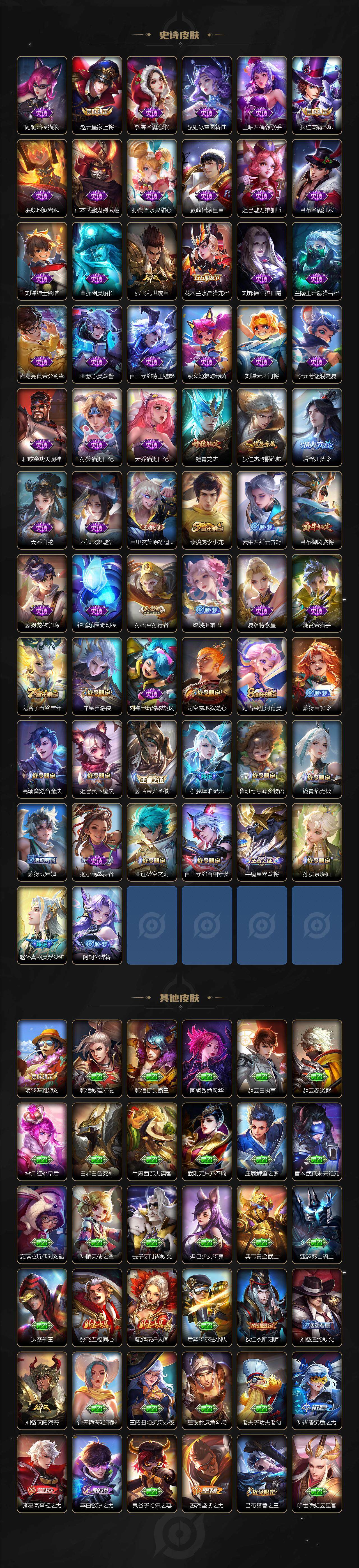 【史诗皮肤】:阿轲暗夜猫娘,赵云皇家上将,貂蝉圣诞恋歌,甄姬冰雪圆舞曲,王昭君偶像歌手,狄仁杰魔术师,廉颇地狱岩魂,宫本武藏鬼剑武藏,孙尚香水果甜心,嬴政摇滚巨星,妲己魅力维加斯,吕布圣诞狂欢,刘禅绅士熊喵,曹操幽灵船长,张飞乱世虎臣,花木兰水晶猎龙者,刘邦德古拉伯爵,兰陵王暗隐猎兽者,诸葛亮黄金分割率,亚瑟心灵战警,百里守约特工魅影,蔡文姬舞动绿茵,刘禅天才门将,李元芳逐浪之夏,程咬金功夫厨神,孙策猫狗日记,大乔猫狗日记,铠青龙志,狄仁杰鹰眼统帅,后羿如梦令,大乔白蛇,不知火舞魅语,百里玄策原初追逐者,裴擒虎李小龙,云中君纤云弄巧,