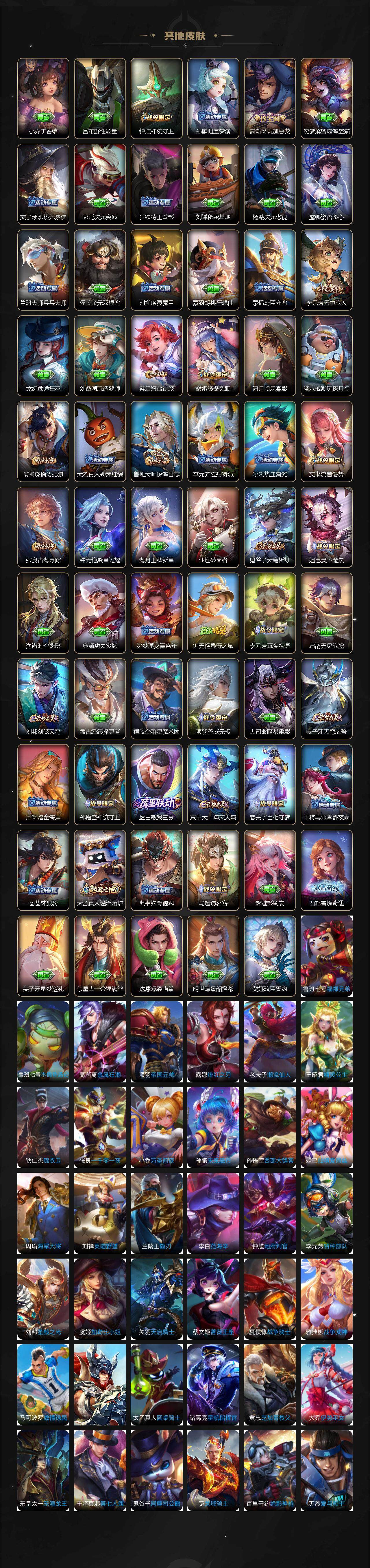 大乔白蛇,李元芳逐浪之夏,不知火舞魅语,大乔猫狗日记,孙策猫狗日记,诸葛亮黄金分割率,王昭君偶像歌手,阿轲暗夜猫娘,蒙犽龙鼓争鸣,嬴政摇滚巨星,刘禅绅士熊喵,刘禅天才门将,程咬金功夫厨神,刘邦德古拉伯爵,兰陵王暗隐猎兽者,曹操幽灵船长,宫本武藏鬼剑武藏,亚瑟心灵战警,钟馗乐园奇幻夜,蔡文姬舞动绿茵,廉颇地狱岩魂,花木兰水晶猎龙者,百里玄策原初追逐者,吕布圣诞狂欢,貂蝉圣诞恋歌,百里守约特工魅影,嫦娥拒霜思,夏洛特永昼,澜赏金猎手,刘禅电玩·爆裂旋风,蒙犽百解令,高渐离燃音魔法,伽罗琥珀纪元,赵怀真器灵·浮梦炉