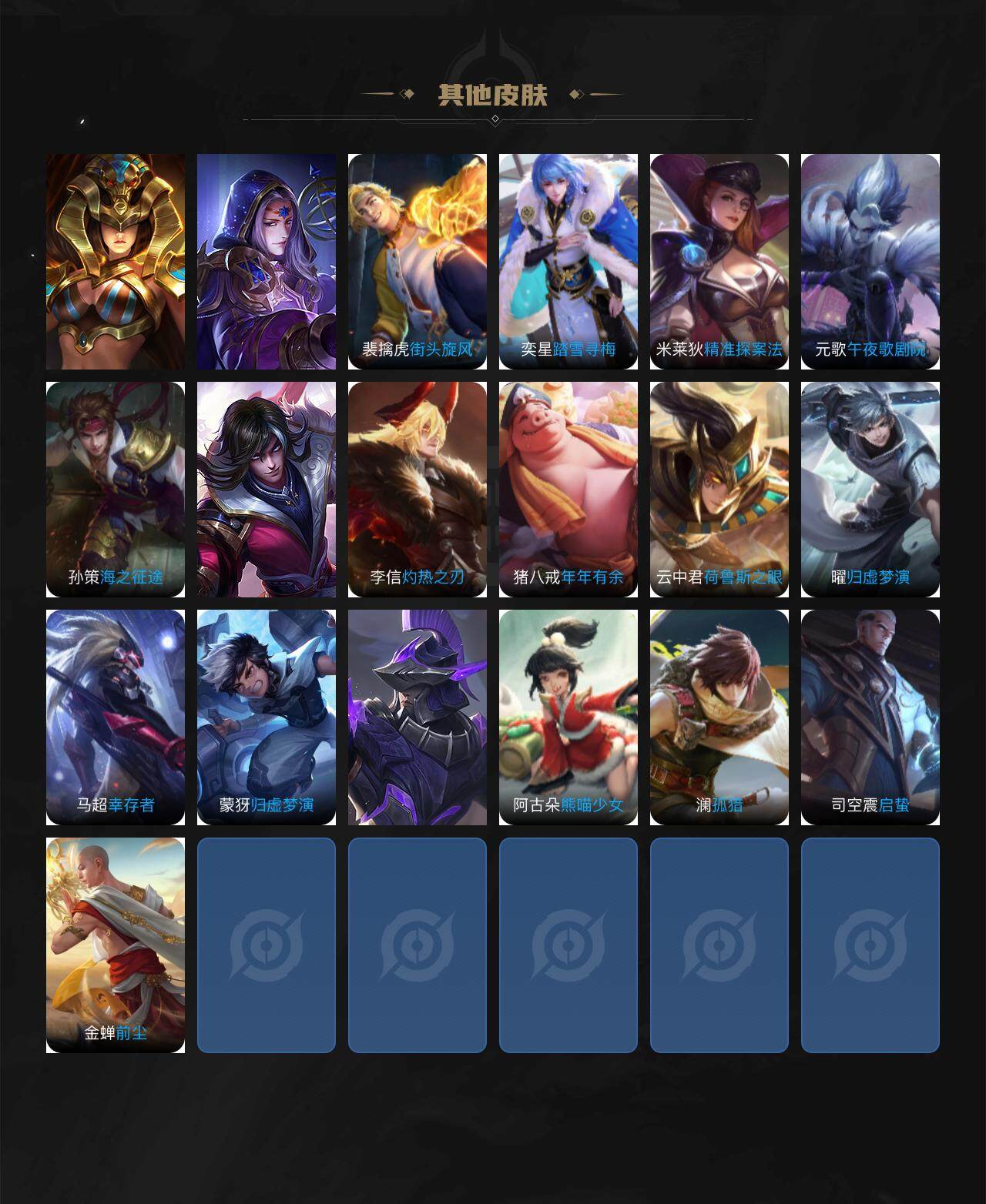 【限定皮肤】:蒙犽顽岩魄,姜子牙天穹之誓,狄仁杰阴阳师,赵云皇家上将,高渐离玩趣恶龙,吕布猎兽之王,吕布御风骁将,狄仁杰魔术师,项羽海滩派对,孙悟空孙行者,后羿如梦令,李元芳云中旅人,钟馗神迹守卫,鬼谷子五谷丰年,铠青龙志,百里玄策原初追逐者,裴擒虎李小龙,裴擒虎擒涛扼浪,云中君纤云弄巧,嫦娥拒霜思,嫦娥暖冬兔眠,鲁班大师探海日志,桑启海盐诗旅,暃星界游侠,艾琳流音漫舞,司空震地狱燃心,阿古朵江河有灵,张良古海寻踪,蒙犽百解令,蒙恬荣光圣徽,高渐离燃音魔法,妲己灵卜魔法,鬼谷子天穹祈灯,伽罗琥珀纪元,沈梦溪龙舞盛年,鲁班七号蔬乡物语,李元芳蔬乡物语,刘邦剑破天穹,程咬金群星魔术团,镜青焰无极,项羽苍威无极,周瑜熔金海岸