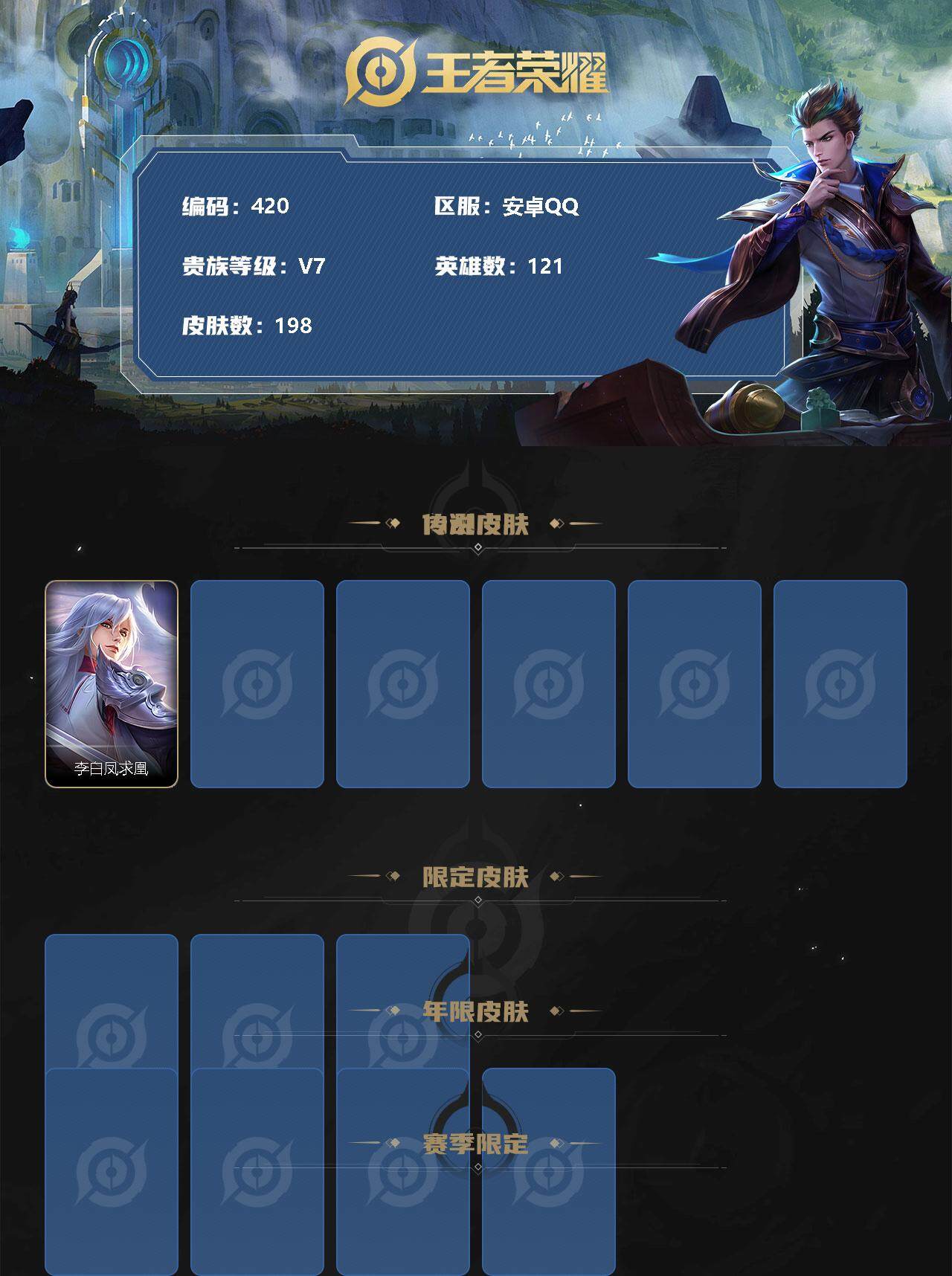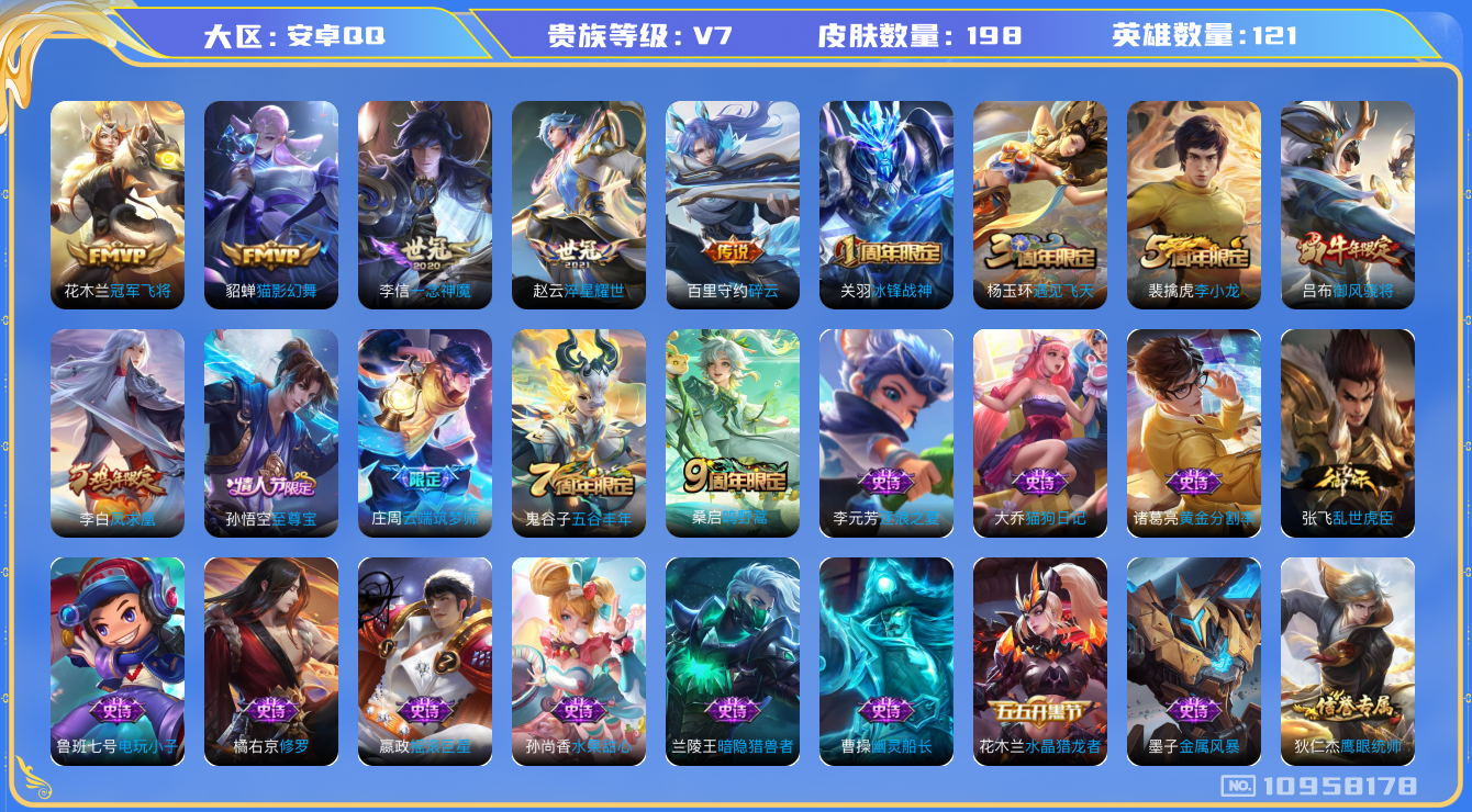 [10958178]【商品标题】:安卓Q-V7-永恒钻石V段位-121英雄-198皮肤-0典藏-0珍品无双-0无双-0珍品传说-7传说-30史诗